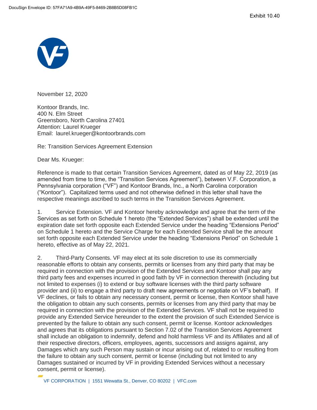 VF CORPORATION | 1551 Wewatta St., Denver, CO 80202 | VFC.com November 12, 2020 Kontoor Brands, Inc. 400 N. Elm Street Greensboro, North Carolina 27401 Attention: Laurel Krueger Email: laurel.krueger@kontoorbrands.com Re: Transition Services Agreement Extension Dear Ms. Krueger: Reference is made to that certain Transition Services Agreement, dated as of May 22, 2019 (as amended from time to time, the “Transition Services Agreement”), between V.F. Corporation, a Pennsylvania corporation (“VF”) and Kontoor Brands, Inc., a North Carolina corporation (“Kontoor”). Capitalized terms used and not otherwise defined in this letter shall have the respective meanings ascribed to such terms in the Transition Services Agreement. 1. Service Extension. VF and Kontoor hereby acknowledge and agree that the term of the Services as set forth on Schedule 1 hereto (the “Extended Services”) shall be extended until the expiration date set forth opposite each Extended Service under the heading “Extensions Period” on Schedule 1 hereto and the Service Charge for each Extended Service shall be the amount set forth opposite each Extended Service under the heading “Extensions Period” on Schedule 1 hereto, effective as of May 22, 2021. 2. Third-Party Consents. VF may elect at its sole discretion to use its commercially reasonable efforts to obtain any consents, permits or licenses from any third party that may be required in connection with the provision of the Extended Services and Kontoor shall pay any third party fees and expenses incurred in good faith by VF in connection therewith (including but not limited to expenses (i) to extend or buy software licenses with the third party software provider and (ii) to engage a third party to draft new agreements or negotiate on VF’s behalf). If VF declines, or fails to obtain any necessary consent, permit or license, then Kontoor shall have the obligation to obtain any such consents, permits or licenses from any third party that may be required in connection with the provision of the Extended Services. VF shall not be required to provide any Extended Service hereunder to the extent the provision of such Extended Service is prevented by the failure to obtain any such consent, permit or license. Kontoor acknowledges and agrees that its obligations pursuant to Section 7.02 of the Transition Services Agreement shall include an obligation to indemnify, defend and hold harmless VF and its Affiliates and all of their respective directors, officers, employees, agents, successors and assigns against, any Damages which any such Person may sustain or incur arising out of, related to or resulting from the failure to obtain any such consent, permit or license (including but not limited to any Damages sustained or incurred by VF in providing Extended Services without a necessary consent, permit or license). DocuSign Envelope ID: 57FA71A9-4B9A-49F5-8469-2B8B5D08FB1C Exhibit 10.40