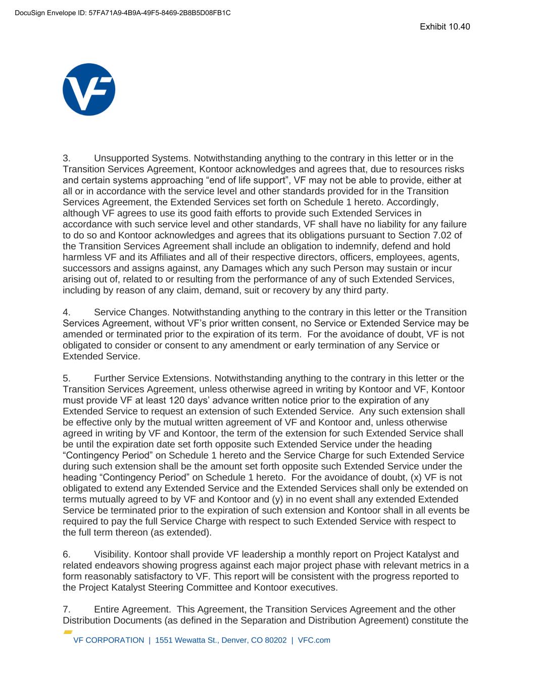 VF CORPORATION | 1551 Wewatta St., Denver, CO 80202 | VFC.com 3. Unsupported Systems. Notwithstanding anything to the contrary in this letter or in the Transition Services Agreement, Kontoor acknowledges and agrees that, due to resources risks and certain systems approaching “end of life support”, VF may not be able to provide, either at all or in accordance with the service level and other standards provided for in the Transition Services Agreement, the Extended Services set forth on Schedule 1 hereto. Accordingly, although VF agrees to use its good faith efforts to provide such Extended Services in accordance with such service level and other standards, VF shall have no liability for any failure to do so and Kontoor acknowledges and agrees that its obligations pursuant to Section 7.02 of the Transition Services Agreement shall include an obligation to indemnify, defend and hold harmless VF and its Affiliates and all of their respective directors, officers, employees, agents, successors and assigns against, any Damages which any such Person may sustain or incur arising out of, related to or resulting from the performance of any of such Extended Services, including by reason of any claim, demand, suit or recovery by any third party. 4. Service Changes. Notwithstanding anything to the contrary in this letter or the Transition Services Agreement, without VF’s prior written consent, no Service or Extended Service may be amended or terminated prior to the expiration of its term. For the avoidance of doubt, VF is not obligated to consider or consent to any amendment or early termination of any Service or Extended Service. 5. Further Service Extensions. Notwithstanding anything to the contrary in this letter or the Transition Services Agreement, unless otherwise agreed in writing by Kontoor and VF, Kontoor must provide VF at least 120 days’ advance written notice prior to the expiration of any Extended Service to request an extension of such Extended Service. Any such extension shall be effective only by the mutual written agreement of VF and Kontoor and, unless otherwise agreed in writing by VF and Kontoor, the term of the extension for such Extended Service shall be until the expiration date set forth opposite such Extended Service under the heading “Contingency Period” on Schedule 1 hereto and the Service Charge for such Extended Service during such extension shall be the amount set forth opposite such Extended Service under the heading “Contingency Period” on Schedule 1 hereto. For the avoidance of doubt, (x) VF is not obligated to extend any Extended Service and the Extended Services shall only be extended on terms mutually agreed to by VF and Kontoor and (y) in no event shall any extended Extended Service be terminated prior to the expiration of such extension and Kontoor shall in all events be required to pay the full Service Charge with respect to such Extended Service with respect to the full term thereon (as extended). 6. Visibility. Kontoor shall provide VF leadership a monthly report on Project Katalyst and related endeavors showing progress against each major project phase with relevant metrics in a form reasonably satisfactory to VF. This report will be consistent with the progress reported to the Project Katalyst Steering Committee and Kontoor executives. 7. Entire Agreement. This Agreement, the Transition Services Agreement and the other Distribution Documents (as defined in the Separation and Distribution Agreement) constitute the DocuSign Envelope ID: 57FA71A9-4B9A-49F5-8469-2B8B5D08FB1C Exhibit 10.40