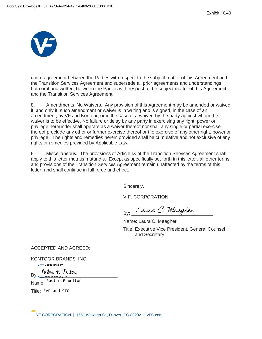 VF CORPORATION | 1551 Wewatta St., Denver, CO 80202 | VFC.com entire agreement between the Parties with respect to the subject matter of this Agreement and the Transition Services Agreement and supersede all prior agreements and understandings, both oral and written, between the Parties with respect to the subject matter of this Agreement and the Transition Services Agreement. 8. Amendments; No Waivers. Any provision of this Agreement may be amended or waived if, and only if, such amendment or waiver is in writing and is signed, in the case of an amendment, by VF and Kontoor, or in the case of a waiver, by the party against whom the waiver is to be effective. No failure or delay by any party in exercising any right, power or privilege hereunder shall operate as a waiver thereof nor shall any single or partial exercise thereof preclude any other or further exercise thereof or the exercise of any other right, power or privilege. The rights and remedies herein provided shall be cumulative and not exclusive of any rights or remedies provided by Applicable Law. 9. Miscellaneous. The provisions of Article IX of the Transition Services Agreement shall apply to this letter mutatis mutandis. Except as specifically set forth in this letter, all other terms and provisions of the Transition Services Agreement remain unaffected by the terms of this letter, and shall continue in full force and effect. Sincerely, V.F. CORPORATION By: _______________________________ Name: Laura C. Meagher Title: Executive Vice President, General Counsel and Secretary ACCEPTED AND AGREED: KONTOOR BRANDS, INC. By: ______________________________ Name: Title: DocuSign Envelope ID: 57FA71A9-4B9A-49F5-8469-2B8B5D08FB1C EVP and CFO Rustin E Welton Exhibit 10.40