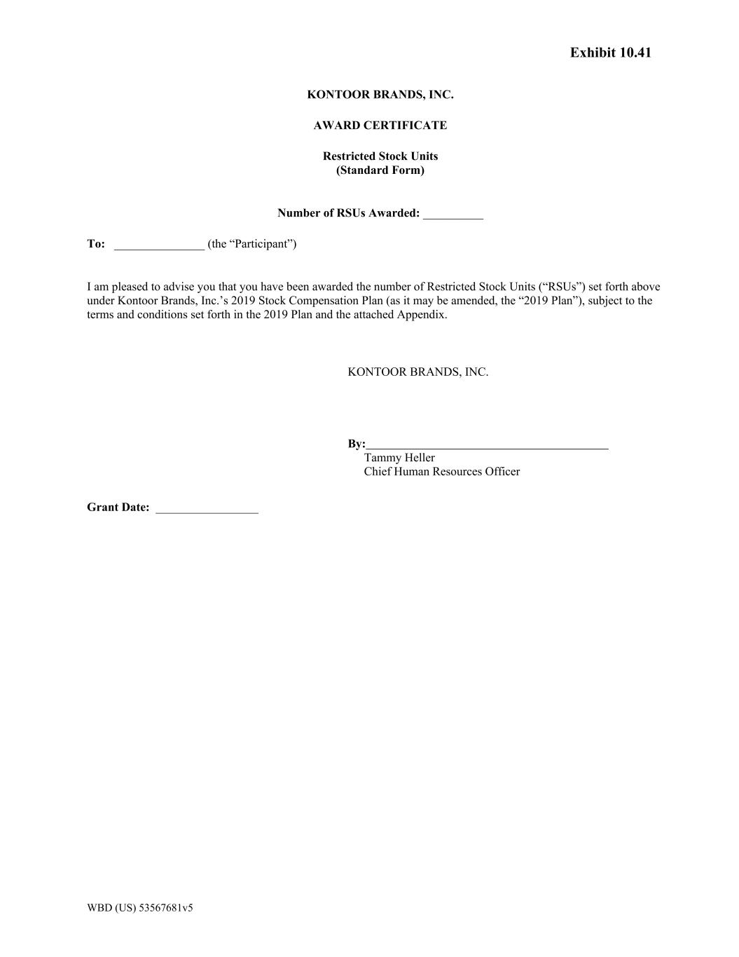Exhibit 10.41 WBD (US) 53567681v5 KONTOOR BRANDS, INC. AWARD CERTIFICATE Restricted Stock Units (Standard Form) Number of RSUs Awarded: __________ To: _______________ (the “Participant”) I am pleased to advise you that you have been awarded the number of Restricted Stock Units (“RSUs”) set forth above under Kontoor Brands, Inc.’s 2019 Stock Compensation Plan (as it may be amended, the “2019 Plan”), subject to the terms and conditions set forth in the 2019 Plan and the attached Appendix. KONTOOR BRANDS, INC. By: Tammy Heller Chief Human Resources Officer Grant Date: _________________
