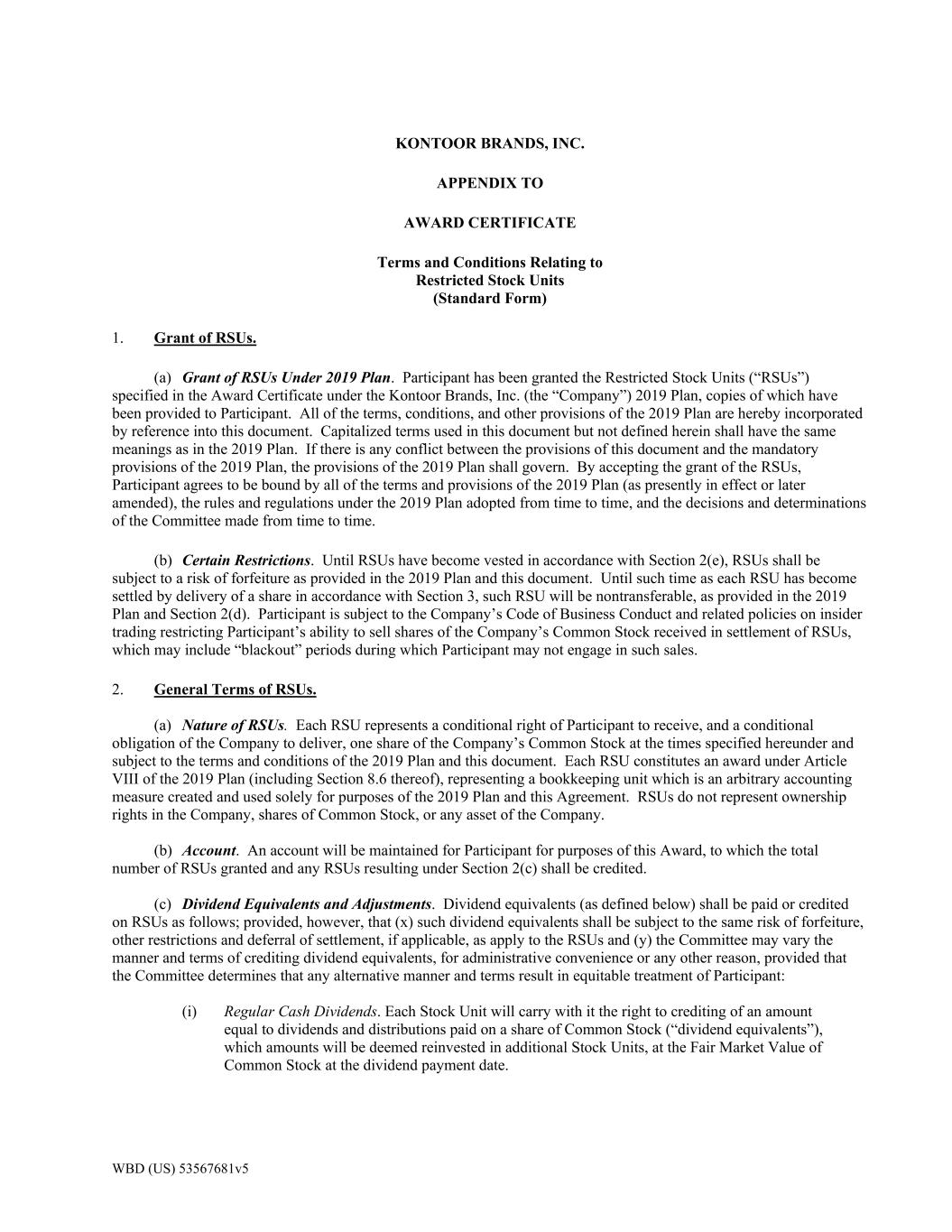 WBD (US) 53567681v5 KONTOOR BRANDS, INC. APPENDIX TO AWARD CERTIFICATE Terms and Conditions Relating to Restricted Stock Units (Standard Form) 1. Grant of RSUs. (a) Grant of RSUs Under 2019 Plan. Participant has been granted the Restricted Stock Units (“RSUs”) specified in the Award Certificate under the Kontoor Brands, Inc. (the “Company”) 2019 Plan, copies of which have been provided to Participant. All of the terms, conditions, and other provisions of the 2019 Plan are hereby incorporated by reference into this document. Capitalized terms used in this document but not defined herein shall have the same meanings as in the 2019 Plan. If there is any conflict between the provisions of this document and the mandatory provisions of the 2019 Plan, the provisions of the 2019 Plan shall govern. By accepting the grant of the RSUs, Participant agrees to be bound by all of the terms and provisions of the 2019 Plan (as presently in effect or later amended), the rules and regulations under the 2019 Plan adopted from time to time, and the decisions and determinations of the Committee made from time to time. (b) Certain Restrictions. Until RSUs have become vested in accordance with Section 2(e), RSUs shall be subject to a risk of forfeiture as provided in the 2019 Plan and this document. Until such time as each RSU has become settled by delivery of a share in accordance with Section 3, such RSU will be nontransferable, as provided in the 2019 Plan and Section 2(d). Participant is subject to the Company’s Code of Business Conduct and related policies on insider trading restricting Participant’s ability to sell shares of the Company’s Common Stock received in settlement of RSUs, which may include “blackout” periods during which Participant may not engage in such sales. 2. General Terms of RSUs. (a) Nature of RSUs. Each RSU represents a conditional right of Participant to receive, and a conditional obligation of the Company to deliver, one share of the Company’s Common Stock at the times specified hereunder and subject to the terms and conditions of the 2019 Plan and this document. Each RSU constitutes an award under Article VIII of the 2019 Plan (including Section 8.6 thereof), representing a bookkeeping unit which is an arbitrary accounting measure created and used solely for purposes of the 2019 Plan and this Agreement. RSUs do not represent ownership rights in the Company, shares of Common Stock, or any asset of the Company. (b) Account. An account will be maintained for Participant for purposes of this Award, to which the total number of RSUs granted and any RSUs resulting under Section 2(c) shall be credited. (c) Dividend Equivalents and Adjustments. Dividend equivalents (as defined below) shall be paid or credited on RSUs as follows; provided, however, that (x) such dividend equivalents shall be subject to the same risk of forfeiture, other restrictions and deferral of settlement, if applicable, as apply to the RSUs and (y) the Committee may vary the manner and terms of crediting dividend equivalents, for administrative convenience or any other reason, provided that the Committee determines that any alternative manner and terms result in equitable treatment of Participant: (i) Regular Cash Dividends. Each Stock Unit will carry with it the right to crediting of an amount equal to dividends and distributions paid on a share of Common Stock (“dividend equivalents”), which amounts will be deemed reinvested in additional Stock Units, at the Fair Market Value of Common Stock at the dividend payment date.