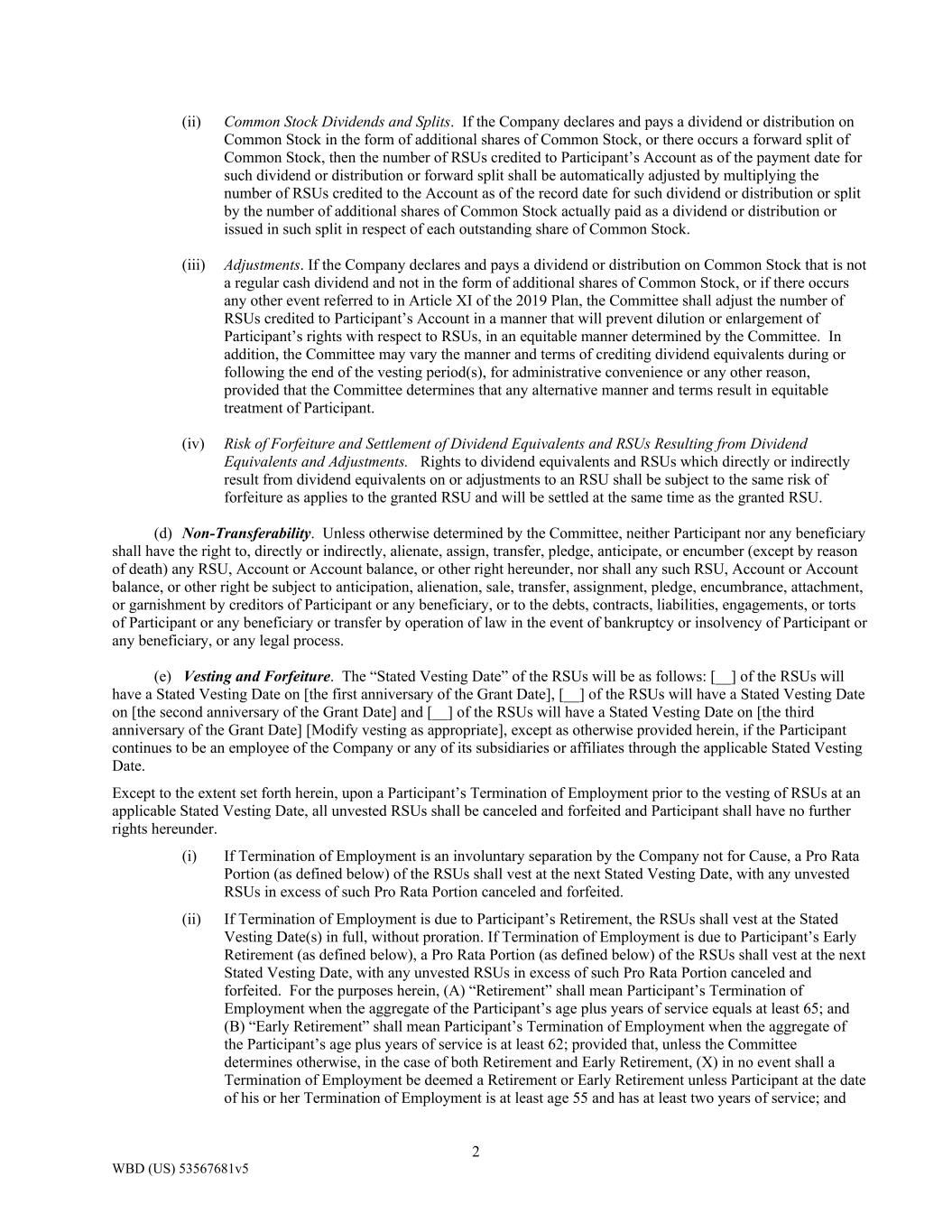 2 WBD (US) 53567681v5 (ii) Common Stock Dividends and Splits. If the Company declares and pays a dividend or distribution on Common Stock in the form of additional shares of Common Stock, or there occurs a forward split of Common Stock, then the number of RSUs credited to Participant’s Account as of the payment date for such dividend or distribution or forward split shall be automatically adjusted by multiplying the number of RSUs credited to the Account as of the record date for such dividend or distribution or split by the number of additional shares of Common Stock actually paid as a dividend or distribution or issued in such split in respect of each outstanding share of Common Stock. (iii) Adjustments. If the Company declares and pays a dividend or distribution on Common Stock that is not a regular cash dividend and not in the form of additional shares of Common Stock, or if there occurs any other event referred to in Article XI of the 2019 Plan, the Committee shall adjust the number of RSUs credited to Participant’s Account in a manner that will prevent dilution or enlargement of Participant’s rights with respect to RSUs, in an equitable manner determined by the Committee. In addition, the Committee may vary the manner and terms of crediting dividend equivalents during or following the end of the vesting period(s), for administrative convenience or any other reason, provided that the Committee determines that any alternative manner and terms result in equitable treatment of Participant. (iv) Risk of Forfeiture and Settlement of Dividend Equivalents and RSUs Resulting from Dividend Equivalents and Adjustments. Rights to dividend equivalents and RSUs which directly or indirectly result from dividend equivalents on or adjustments to an RSU shall be subject to the same risk of forfeiture as applies to the granted RSU and will be settled at the same time as the granted RSU. (d) Non-Transferability. Unless otherwise determined by the Committee, neither Participant nor any beneficiary shall have the right to, directly or indirectly, alienate, assign, transfer, pledge, anticipate, or encumber (except by reason of death) any RSU, Account or Account balance, or other right hereunder, nor shall any such RSU, Account or Account balance, or other right be subject to anticipation, alienation, sale, transfer, assignment, pledge, encumbrance, attachment, or garnishment by creditors of Participant or any beneficiary, or to the debts, contracts, liabilities, engagements, or torts of Participant or any beneficiary or transfer by operation of law in the event of bankruptcy or insolvency of Participant or any beneficiary, or any legal process. (e) Vesting and Forfeiture. The “Stated Vesting Date” of the RSUs will be as follows: [__] of the RSUs will have a Stated Vesting Date on [the first anniversary of the Grant Date], [__] of the RSUs will have a Stated Vesting Date on [the second anniversary of the Grant Date] and [__] of the RSUs will have a Stated Vesting Date on [the third anniversary of the Grant Date] [Modify vesting as appropriate], except as otherwise provided herein, if the Participant continues to be an employee of the Company or any of its subsidiaries or affiliates through the applicable Stated Vesting Date. Except to the extent set forth herein, upon a Participant’s Termination of Employment prior to the vesting of RSUs at an applicable Stated Vesting Date, all unvested RSUs shall be canceled and forfeited and Participant shall have no further rights hereunder. (i) If Termination of Employment is an involuntary separation by the Company not for Cause, a Pro Rata Portion (as defined below) of the RSUs shall vest at the next Stated Vesting Date, with any unvested RSUs in excess of such Pro Rata Portion canceled and forfeited. (ii) If Termination of Employment is due to Participant’s Retirement, the RSUs shall vest at the Stated Vesting Date(s) in full, without proration. If Termination of Employment is due to Participant’s Early Retirement (as defined below), a Pro Rata Portion (as defined below) of the RSUs shall vest at the next Stated Vesting Date, with any unvested RSUs in excess of such Pro Rata Portion canceled and forfeited. For the purposes herein, (A) “Retirement” shall mean Participant’s Termination of Employment when the aggregate of the Participant’s age plus years of service equals at least 65; and (B) “Early Retirement” shall mean Participant’s Termination of Employment when the aggregate of the Participant’s age plus years of service is at least 62; provided that, unless the Committee determines otherwise, in the case of both Retirement and Early Retirement, (X) in no event shall a Termination of Employment be deemed a Retirement or Early Retirement unless Participant at the date of his or her Termination of Employment is at least age 55 and has at least two years of service; and