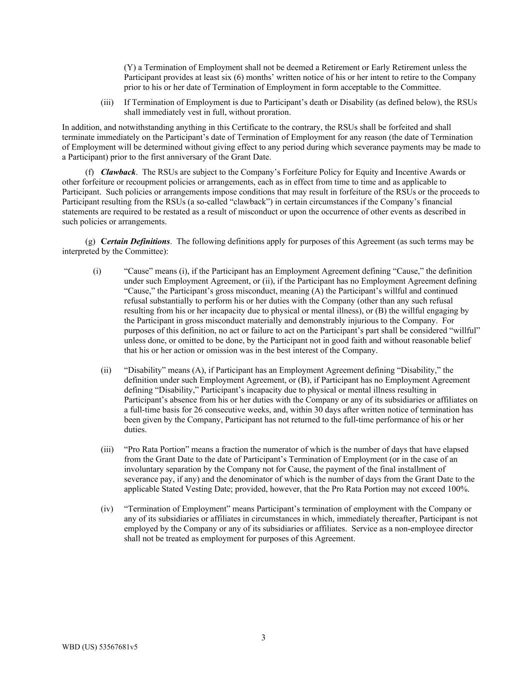 3 WBD (US) 53567681v5 (Y) a Termination of Employment shall not be deemed a Retirement or Early Retirement unless the Participant provides at least six (6) months’ written notice of his or her intent to retire to the Company prior to his or her date of Termination of Employment in form acceptable to the Committee. (iii) If Termination of Employment is due to Participant’s death or Disability (as defined below), the RSUs shall immediately vest in full, without proration. In addition, and notwithstanding anything in this Certificate to the contrary, the RSUs shall be forfeited and shall terminate immediately on the Participant’s date of Termination of Employment for any reason (the date of Termination of Employment will be determined without giving effect to any period during which severance payments may be made to a Participant) prior to the first anniversary of the Grant Date. (f) Clawback. The RSUs are subject to the Company’s Forfeiture Policy for Equity and Incentive Awards or other forfeiture or recoupment policies or arrangements, each as in effect from time to time and as applicable to Participant. Such policies or arrangements impose conditions that may result in forfeiture of the RSUs or the proceeds to Participant resulting from the RSUs (a so-called “clawback”) in certain circumstances if the Company’s financial statements are required to be restated as a result of misconduct or upon the occurrence of other events as described in such policies or arrangements. (g) Certain Definitions. The following definitions apply for purposes of this Agreement (as such terms may be interpreted by the Committee): (i) “Cause” means (i), if the Participant has an Employment Agreement defining “Cause,” the definition under such Employment Agreement, or (ii), if the Participant has no Employment Agreement defining “Cause,” the Participant’s gross misconduct, meaning (A) the Participant’s willful and continued refusal substantially to perform his or her duties with the Company (other than any such refusal resulting from his or her incapacity due to physical or mental illness), or (B) the willful engaging by the Participant in gross misconduct materially and demonstrably injurious to the Company. For purposes of this definition, no act or failure to act on the Participant’s part shall be considered “willful” unless done, or omitted to be done, by the Participant not in good faith and without reasonable belief that his or her action or omission was in the best interest of the Company. (ii) “Disability” means (A), if Participant has an Employment Agreement defining “Disability,” the definition under such Employment Agreement, or (B), if Participant has no Employment Agreement defining “Disability,” Participant’s incapacity due to physical or mental illness resulting in Participant’s absence from his or her duties with the Company or any of its subsidiaries or affiliates on a full-time basis for 26 consecutive weeks, and, within 30 days after written notice of termination has been given by the Company, Participant has not returned to the full-time performance of his or her duties. (iii) “Pro Rata Portion” means a fraction the numerator of which is the number of days that have elapsed from the Grant Date to the date of Participant’s Termination of Employment (or in the case of an involuntary separation by the Company not for Cause, the payment of the final installment of severance pay, if any) and the denominator of which is the number of days from the Grant Date to the applicable Stated Vesting Date; provided, however, that the Pro Rata Portion may not exceed 100%. (iv) “Termination of Employment” means Participant’s termination of employment with the Company or any of its subsidiaries or affiliates in circumstances in which, immediately thereafter, Participant is not employed by the Company or any of its subsidiaries or affiliates. Service as a non-employee director shall not be treated as employment for purposes of this Agreement.
