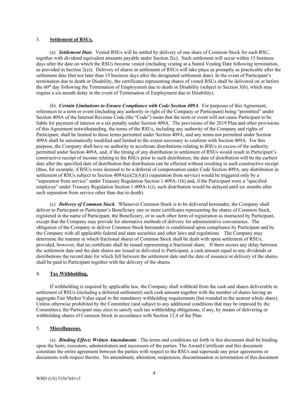 4 WBD (US) 53567681v5 3. Settlement of RSUs. (a) Settlement Date. Vested RSUs will be settled by delivery of one share of Common Stock for each RSU, together with dividend equivalent amounts payable under Section 2(c). Such settlement will occur within 15 business days after the date on which the RSUs become vested (including vesting at a Stated Vesting Date following termination, as provided in Section 2(e)). Delivery of shares in settlement of RSUs will take place as promptly as practicable after the settlement date (but not later than 15 business days after the designated settlement date). In the event of Participant’s termination due to death or Disability, the certificates representing shares of vested RSUs shall be delivered on or before the 60th day following the Termination of Employment due to death or Disability (subject to Section 3(b), which may require a six-month delay in the event of Termination of Employment due to Disability). (b) Certain Limitations to Ensure Compliance with Code Section 409A. For purposes of this Agreement, references to a term or event (including any authority or right of the Company or Participant) being “permitted” under Section 409A of the Internal Revenue Code (the “Code”) mean that the term or event will not cause Participant to be liable for payment of interest or a tax penalty under Section 409A. The provisions of the 2019 Plan and other provisions of this Agreement notwithstanding, the terms of the RSUs, including any authority of the Company and rights of Participant, shall be limited to those terms permitted under Section 409A, and any terms not permitted under Section 409A shall be automatically modified and limited to the extent necessary to conform with Section 409A. For this purpose, the Company shall have no authority to accelerate distributions relating to RSUs in excess of the authority permitted under Section 409A, and, if the timing of any distribution in settlement of RSUs would result in Participant’s constructive receipt of income relating to the RSUs prior to such distribution, the date of distribution will be the earliest date after the specified date of distribution that distribution can be effected without resulting in such constructive receipt (thus, for example, if RSUs were deemed to be a deferral of compensation under Code Section 409A, any distribution in settlement of RSUs subject to Section 409A(a)(2)(A)(i) (separation from service) would be triggered only by a “separation from service” under Treasury Regulation Section 1.409A-1(h) and, if the Participant were a “specified employee” under Treasury Regulation Section 1.409A-1(i), such distribution would be delayed until six months after such separation from service other than due to death). (c) Delivery of Common Stock. Whenever Common Stock is to be delivered hereunder, the Company shall deliver to Participant or Participant’s Beneficiary one or more certificates representing the shares of Common Stock, registered in the name of Participant, the Beneficiary, or in such other form of registration as instructed by Participant, except that the Company may provide for alternative methods of delivery for administrative convenience. The obligation of the Company to deliver Common Stock hereunder is conditioned upon compliance by Participant and by the Company with all applicable federal and state securities and other laws and regulations. The Company may determine the manner in which fractional shares of Common Stock shall be dealt with upon settlement of RSUs; provided, however, that no certificate shall be issued representing a fractional share. If there occurs any delay between the settlement date and the date shares are issued or delivered to Participant, a cash amount equal to any dividends or distributions the record date for which fell between the settlement date and the date of issuance or delivery of the shares shall be paid to Participant together with the delivery of the shares. 4. Tax Withholding. If withholding is required by applicable law, the Company shall withhold from the cash and shares deliverable in settlement of RSUs (including a deferred settlement) such cash amount together with the number of shares having an aggregate Fair Market Value equal to the mandatory withholding requirements (but rounded to the nearest whole share). Unless otherwise prohibited by the Committee (and subject to any additional conditions that may be imposed by the Committee), the Participant may elect to satisfy such tax withholding obligations, if any, by means of delivering or withholding shares of Common Stock in accordance with Section 12.4 of the Plan. 5. Miscellaneous. (a) Binding Effect; Written Amendments. The terms and conditions set forth in this document shall be binding upon the heirs, executors, administrators and successors of the parties. The Award Certificate and this document constitute the entire agreement between the parties with respect to the RSUs and supersede any prior agreements or documents with respect thereto. No amendment, alteration, suspension, discontinuation or termination of this document