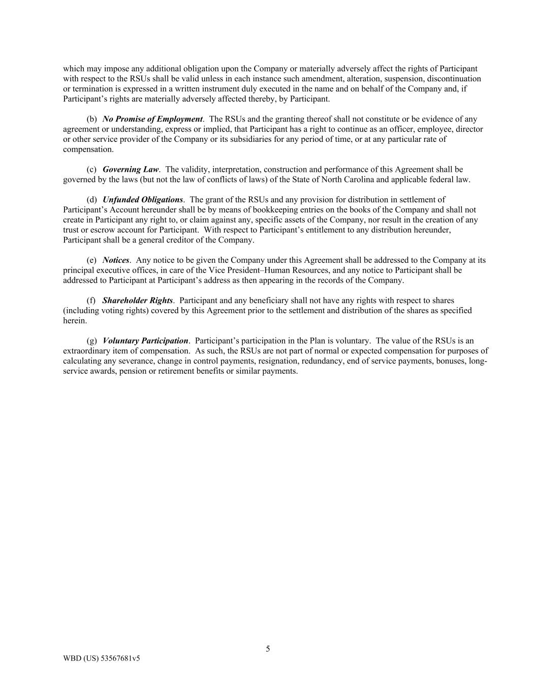 5 WBD (US) 53567681v5 which may impose any additional obligation upon the Company or materially adversely affect the rights of Participant with respect to the RSUs shall be valid unless in each instance such amendment, alteration, suspension, discontinuation or termination is expressed in a written instrument duly executed in the name and on behalf of the Company and, if Participant’s rights are materially adversely affected thereby, by Participant. (b) No Promise of Employment. The RSUs and the granting thereof shall not constitute or be evidence of any agreement or understanding, express or implied, that Participant has a right to continue as an officer, employee, director or other service provider of the Company or its subsidiaries for any period of time, or at any particular rate of compensation. (c) Governing Law. The validity, interpretation, construction and performance of this Agreement shall be governed by the laws (but not the law of conflicts of laws) of the State of North Carolina and applicable federal law. (d) Unfunded Obligations. The grant of the RSUs and any provision for distribution in settlement of Participant’s Account hereunder shall be by means of bookkeeping entries on the books of the Company and shall not create in Participant any right to, or claim against any, specific assets of the Company, nor result in the creation of any trust or escrow account for Participant. With respect to Participant’s entitlement to any distribution hereunder, Participant shall be a general creditor of the Company. (e) Notices. Any notice to be given the Company under this Agreement shall be addressed to the Company at its principal executive offices, in care of the Vice President–Human Resources, and any notice to Participant shall be addressed to Participant at Participant’s address as then appearing in the records of the Company. (f) Shareholder Rights. Participant and any beneficiary shall not have any rights with respect to shares (including voting rights) covered by this Agreement prior to the settlement and distribution of the shares as specified herein. (g) Voluntary Participation. Participant’s participation in the Plan is voluntary. The value of the RSUs is an extraordinary item of compensation. As such, the RSUs are not part of normal or expected compensation for purposes of calculating any severance, change in control payments, resignation, redundancy, end of service payments, bonuses, long- service awards, pension or retirement benefits or similar payments.