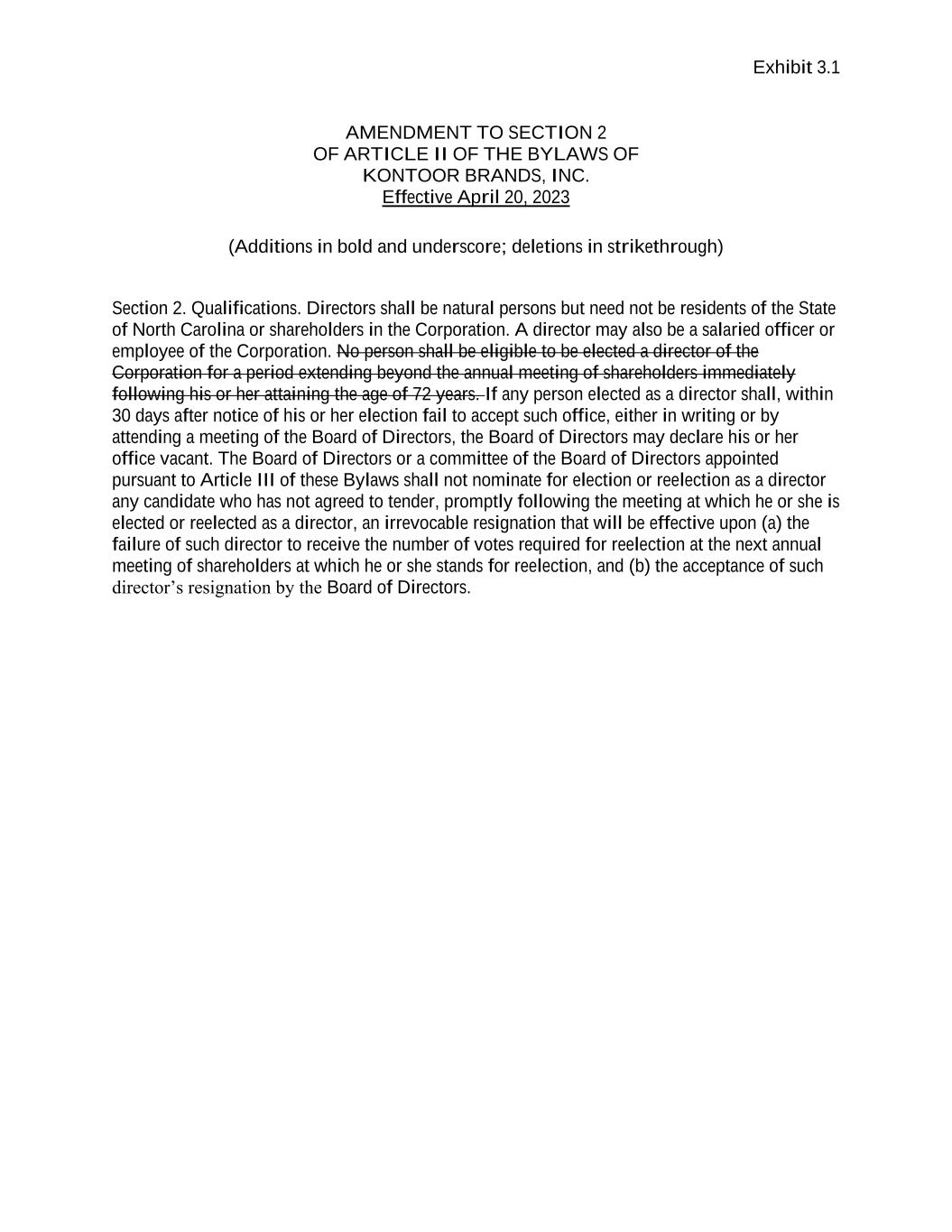 Exhibit 3.1 AMENDMENT TO SECTION 2 OF ARTICLE II OF THE BYLAWS OF KONTOOR BRANDS, INC. Effective April 20, 2023 (Additions in bold and underscore; deletions in strikethrough) Section 2. Qualifications. Directors shall be natural persons but need not be residents of the State of North Carolina or shareholders in the Corporation. A director may also be a salaried officer or employee of the Corporation. No person shall be eligible to be elected a director of the Corporation for a period extending beyond the annual meeting of shareholders immediately following his or her attaining the age of 72 years. If any person elected as a director shall, within 30 days after notice of his or her election fail to accept such office, either in writing or by attending a meeting of the Board of Directors, the Board of Directors may declare his or her office vacant. The Board of Directors or a committee of the Board of Directors appointed pursuant to Article III of these Bylaws shall not nominate for election or reelection as a director any candidate who has not agreed to tender, promptly following the meeting at which he or she is elected or reelected as a director, an irrevocable resignation that will be effective upon (a) the failure of such director to receive the number of votes required for reelection at the next annual meeting of shareholders at which he or she stands for reelection, and (b) the acceptance of such director’s resignation by the Board of Directors.