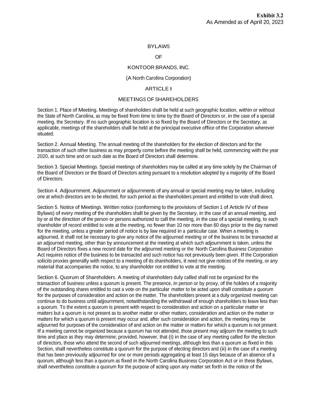 As Amended as of April 20, 2023 BYLAWS OF KONTOOR BRANDS, INC. (A North Carolina Corporation) ARTICLE I MEETINGS OF SHAREHOLDERS Section 1. Place of Meeting. Meetings of shareholders shall be held at such geographic location, within or without the State of North Carolina, as may be fixed from time to time by the Board of Directors or, in the case of a special meeting, the Secretary. If no such geographic location is so fixed by the Board of Directors or the Secretary, as applicable, meetings of the shareholders shall be held at the principal executive office of the Corporation wherever situated. Section 2. Annual Meeting. The annual meeting of the shareholders for the election of directors and for the transaction of such other business as may properly come before the meeting shall be held, commencing with the year 2020, at such time and on such date as the Board of Directors shall determine. Section 3. Special Meetings. Special meetings of shareholders may be called at any time solely by the Chairman of the Board of Directors or the Board of Directors acting pursuant to a resolution adopted by a majority of the Board of Directors. Section 4. Adjournment. Adjournment or adjournments of any annual or special meeting may be taken, including one at which directors are to be elected, for such period as the shareholders present and entitled to vote shall direct. Section 5. Notice of Meetings. Written notice (conforming to the provisions of Section 1 of Article IV of these Bylaws) of every meeting of the shareholders shall be given by the Secretary, in the case of an annual meeting, and by or at the direction of the person or persons authorized to call the meeting, in the case of a special meeting, to each shareholder of record entitled to vote at the meeting, no fewer than 10 nor more than 60 days prior to the day named for the meeting, unless a greater period of notice is by law required in a particular case. When a meeting is adjourned, it shall not be necessary to give any notice of the adjourned meeting or of the business to be transacted at an adjourned meeting, other than by announcement at the meeting at which such adjournment is taken, unless the Board of Directors fixes a new record date for the adjourned meeting or the North Carolina Business Corporation Act requires notice of the business to be transacted and such notice has not previously been given. If the Corporation solicits proxies generally with respect to a meeting of its shareholders, it need not give notices of the meeting, or any material that accompanies the notice, to any shareholder not entitled to vote at the meeting. Section 6. Quorum of Shareholders. A meeting of shareholders duly called shall not be organized for the transaction of business unless a quorum is present. The presence, in person or by proxy, of the holders of a majority of the outstanding shares entitled to cast a vote on the particular matter to be acted upon shall constitute a quorum for the purposes of consideration and action on the matter. The shareholders present at a duly organized meeting can continue to do business until adjournment, notwithstanding the withdrawal of enough shareholders to leave less than a quorum. To the extent a quorum is present with respect to consideration and action on a particular matter or matters but a quorum is not present as to another matter or other matters, consideration and action on the matter or matters for which a quorum is present may occur and, after such consideration and action, the meeting may be adjourned for purposes of the consideration of and action on the matter or matters for which a quorum is not present. If a meeting cannot be organized because a quorum has not attended, those present may adjourn the meeting to such time and place as they may determine; provided, however, that (i) in the case of any meeting called for the election of directors, those who attend the second of such adjourned meetings, although less than a quorum as fixed in this Section, shall nevertheless constitute a quorum for the purpose of electing directors and (ii) in the case of a meeting that has been previously adjourned for one or more periods aggregating at least 15 days because of an absence of a quorum, although less than a quorum as fixed in the North Carolina Business Corporation Act or in these Bylaws, shall nevertheless constitute a quorum for the purpose of acting upon any matter set forth in the notice of the Exhibit 3.2