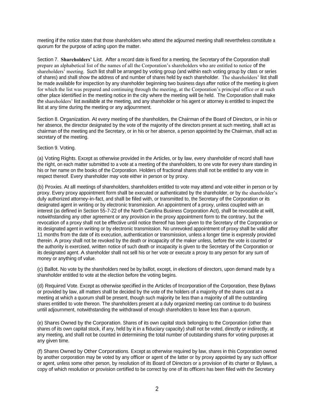 2 meeting if the notice states that those shareholders who attend the adjourned meeting shall nevertheless constitute a quorum for the purpose of acting upon the matter. Section 7. Shareholders’ List. After a record date is fixed for a meeting, the Secretary of the Corporation shall prepare an alphabetical list of the names of all the Corporation’s shareholders who are entitled to notice of the shareholders’ meeting. Such list shall be arranged by voting group (and within each voting group by class or series of shares) and shall show the address of and number of shares held by each shareholder. The shareholders’ list shall be made available for inspection by any shareholder beginning two business days after notice of the meeting is given for which the list was prepared and continuing through the meeting, at the Corporation’s principal office or at such other place identified in the meeting notice in the city where the meeting will be held. The Corporation shall make the shareholders’ list available at the meeting, and any shareholder or his agent or attorney is entitled to inspect the list at any time during the meeting or any adjournment. Section 8. Organization. At every meeting of the shareholders, the Chairman of the Board of Directors, or in his or her absence, the director designated by the vote of the majority of the directors present at such meeting, shall act as chairman of the meeting and the Secretary, or in his or her absence, a person appointed by the Chairman, shall act as secretary of the meeting. Section 9. Voting. (a) Voting Rights. Except as otherwise provided in the Articles, or by law, every shareholder of record shall have the right, on each matter submitted to a vote at a meeting of the shareholders, to one vote for every share standing in his or her name on the books of the Corporation. Holders of fractional shares shall not be entitled to any vote in respect thereof. Every shareholder may vote either in person or by proxy. (b) Proxies. At all meetings of shareholders, shareholders entitled to vote may attend and vote either in person or by proxy. Every proxy appointment form shall be executed or authenticated by the shareholder, or by the shareholder’s duly authorized attorney-in-fact, and shall be filed with, or transmitted to, the Secretary of the Corporation or its designated agent in writing or by electronic transmission. An appointment of a proxy, unless coupled with an interest (as defined in Section 55-7-22 of the North Carolina Business Corporation Act), shall be revocable at will, notwithstanding any other agreement or any provision in the proxy appointment form to the contrary, but the revocation of a proxy shall not be effective until notice thereof has been given to the Secretary of the Corporation or its designated agent in writing or by electronic transmission. No unrevoked appointment of proxy shall be valid after 11 months from the date of its execution, authentication or transmission, unless a longer time is expressly provided therein. A proxy shall not be revoked by the death or incapacity of the maker unless, before the vote is counted or the authority is exercised, written notice of such death or incapacity is given to the Secretary of the Corporation or its designated agent. A shareholder shall not sell his or her vote or execute a proxy to any person for any sum of money or anything of value. (c) Ballot. No vote by the shareholders need be by ballot, except, in elections of directors, upon demand made by a shareholder entitled to vote at the election before the voting begins. (d) Required Vote. Except as otherwise specified in the Articles of Incorporation of the Corporation, these Bylaws or provided by law, all matters shall be decided by the vote of the holders of a majority of the shares cast at a meeting at which a quorum shall be present, though such majority be less than a majority of all the outstanding shares entitled to vote thereon. The shareholders present at a duly organized meeting can continue to do business until adjournment, notwithstanding the withdrawal of enough shareholders to leave less than a quorum. (e) Shares Owned by the Corporation. Shares of its own capital stock belonging to the Corporation (other than shares of its own capital stock, if any, held by it in a fiduciary capacity) shall not be voted, directly or indirectly, at any meeting, and shall not be counted in determining the total number of outstanding shares for voting purposes at any given time. (f) Shares Owned by Other Corporations. Except as otherwise required by law, shares in this Corporation owned by another corporation may be voted by any officer or agent of the latter or by proxy appointed by any such officer or agent, unless some other person, by resolution of its Board of Directors or a provision of its charter or Bylaws, a copy of which resolution or provision certified to be correct by one of its officers has been filed with the Secretary