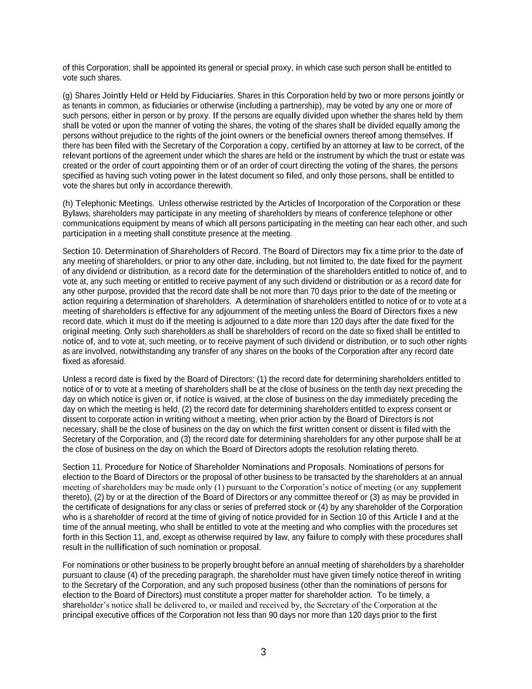 3 of this Corporation, shall be appointed its general or special proxy, in which case such person shall be entitled to vote such shares. (g) Shares Jointly Held or Held by Fiduciaries. Shares in this Corporation held by two or more persons jointly or as tenants in common, as fiduciaries or otherwise (including a partnership), may be voted by any one or more of such persons, either in person or by proxy. If the persons are equally divided upon whether the shares held by them shall be voted or upon the manner of voting the shares, the voting of the shares shall be divided equally among the persons without prejudice to the rights of the joint owners or the beneficial owners thereof among themselves. If there has been filed with the Secretary of the Corporation a copy, certified by an attorney at law to be correct, of the relevant portions of the agreement under which the shares are held or the instrument by which the trust or estate was created or the order of court appointing them or of an order of court directing the voting of the shares, the persons specified as having such voting power in the latest document so filed, and only those persons, shall be entitled to vote the shares but only in accordance therewith. (h) Telephonic Meetings. Unless otherwise restricted by the Articles of Incorporation of the Corporation or these Bylaws, shareholders may participate in any meeting of shareholders by means of conference telephone or other communications equipment by means of which all persons participating in the meeting can hear each other, and such participation in a meeting shall constitute presence at the meeting. Section 10. Determination of Shareholders of Record. The Board of Directors may fix a time prior to the date of any meeting of shareholders, or prior to any other date, including, but not limited to, the date fixed for the payment of any dividend or distribution, as a record date for the determination of the shareholders entitled to notice of, and to vote at, any such meeting or entitled to receive payment of any such dividend or distribution or as a record date for any other purpose, provided that the record date shall be not more than 70 days prior to the date of the meeting or action requiring a determination of shareholders. A determination of shareholders entitled to notice of or to vote at a meeting of shareholders is effective for any adjournment of the meeting unless the Board of Directors fixes a new record date, which it must do if the meeting is adjourned to a date more than 120 days after the date fixed for the original meeting. Only such shareholders as shall be shareholders of record on the date so fixed shall be entitled to notice of, and to vote at, such meeting, or to receive payment of such dividend or distribution, or to such other rights as are involved, notwithstanding any transfer of any shares on the books of the Corporation after any record date fixed as aforesaid. Unless a record date is fixed by the Board of Directors: (1) the record date for determining shareholders entitled to notice of or to vote at a meeting of shareholders shall be at the close of business on the tenth day next preceding the day on which notice is given or, if notice is waived, at the close of business on the day immediately preceding the day on which the meeting is held, (2) the record date for determining shareholders entitled to express consent or dissent to corporate action in writing without a meeting, when prior action by the Board of Directors is not necessary, shall be the close of business on the day on which the first written consent or dissent is filed with the Secretary of the Corporation, and (3) the record date for determining shareholders for any other purpose shall be at the close of business on the day on which the Board of Directors adopts the resolution relating thereto. Section 11. Procedure for Notice of Shareholder Nominations and Proposals. Nominations of persons for election to the Board of Directors or the proposal of other business to be transacted by the shareholders at an annual meeting of shareholders may be made only (1) pursuant to the Corporation’s notice of meeting (or any supplement thereto), (2) by or at the direction of the Board of Directors or any committee thereof or (3) as may be provided in the certificate of designations for any class or series of preferred stock or (4) by any shareholder of the Corporation who is a shareholder of record at the time of giving of notice provided for in Section 10 of this Article I and at the time of the annual meeting, who shall be entitled to vote at the meeting and who complies with the procedures set forth in this Section 11, and, except as otherwise required by law, any failure to comply with these procedures shall result in the nullification of such nomination or proposal. For nominations or other business to be properly brought before an annual meeting of shareholders by a shareholder pursuant to clause (4) of the preceding paragraph, the shareholder must have given timely notice thereof in writing to the Secretary of the Corporation, and any such proposed business (other than the nominations of persons for election to the Board of Directors) must constitute a proper matter for shareholder action. To be timely, a shareholder’s notice shall be delivered to, or mailed and received by, the Secretary of the Corporation at the principal executive offices of the Corporation not less than 90 days nor more than 120 days prior to the first