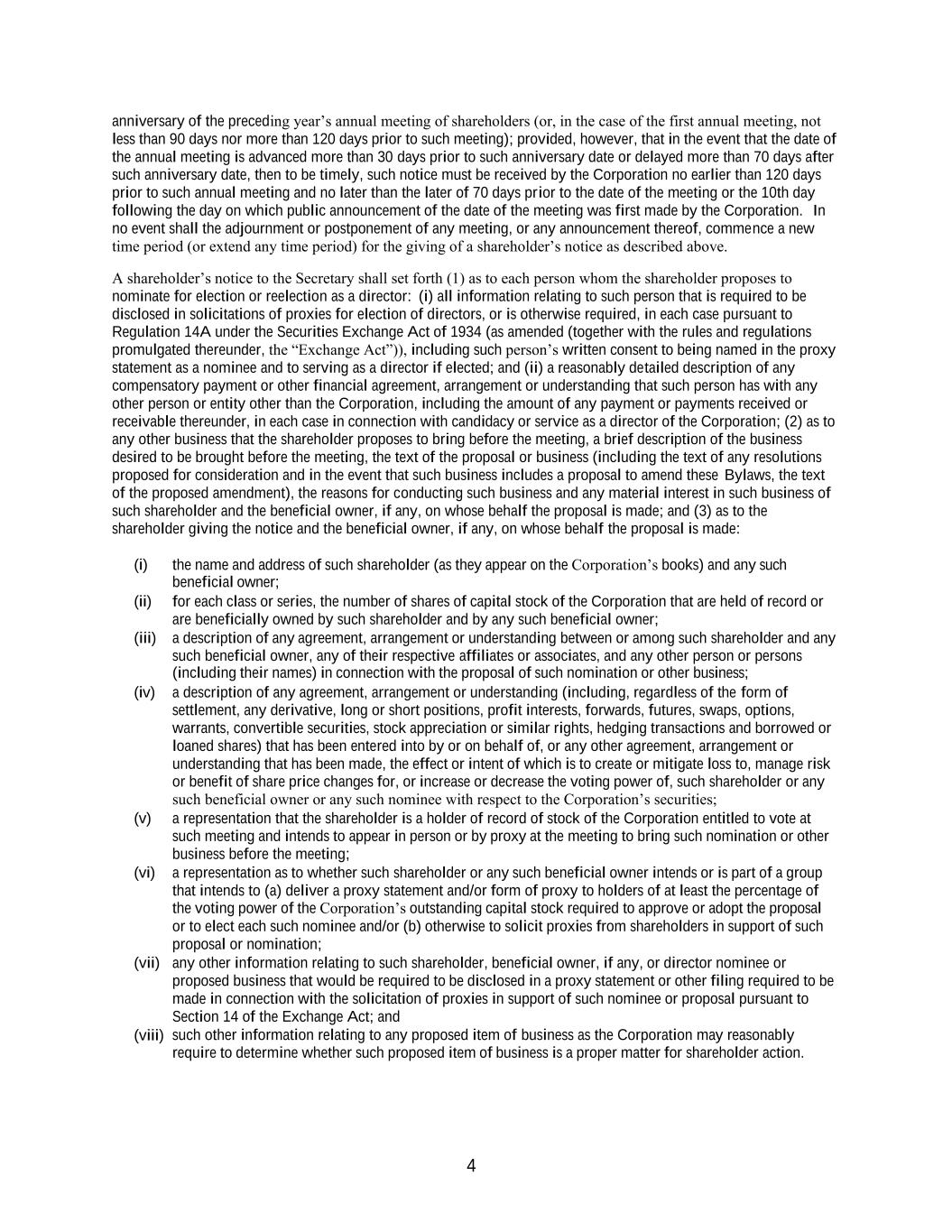 4 anniversary of the preceding year’s annual meeting of shareholders (or, in the case of the first annual meeting, not less than 90 days nor more than 120 days prior to such meeting); provided, however, that in the event that the date of the annual meeting is advanced more than 30 days prior to such anniversary date or delayed more than 70 days after such anniversary date, then to be timely, such notice must be received by the Corporation no earlier than 120 days prior to such annual meeting and no later than the later of 70 days prior to the date of the meeting or the 10th day following the day on which public announcement of the date of the meeting was first made by the Corporation. In no event shall the adjournment or postponement of any meeting, or any announcement thereof, commence a new time period (or extend any time period) for the giving of a shareholder’s notice as described above. A shareholder’s notice to the Secretary shall set forth (1) as to each person whom the shareholder proposes to nominate for election or reelection as a director: (i) all information relating to such person that is required to be disclosed in solicitations of proxies for election of directors, or is otherwise required, in each case pursuant to Regulation 14A under the Securities Exchange Act of 1934 (as amended (together with the rules and regulations promulgated thereunder, the “Exchange Act”)), including such person’s written consent to being named in the proxy statement as a nominee and to serving as a director if elected; and (ii) a reasonably detailed description of any compensatory payment or other financial agreement, arrangement or understanding that such person has with any other person or entity other than the Corporation, including the amount of any payment or payments received or receivable thereunder, in each case in connection with candidacy or service as a director of the Corporation; (2) as to any other business that the shareholder proposes to bring before the meeting, a brief description of the business desired to be brought before the meeting, the text of the proposal or business (including the text of any resolutions proposed for consideration and in the event that such business includes a proposal to amend these Bylaws, the text of the proposed amendment), the reasons for conducting such business and any material interest in such business of such shareholder and the beneficial owner, if any, on whose behalf the proposal is made; and (3) as to the shareholder giving the notice and the beneficial owner, if any, on whose behalf the proposal is made: (i) the name and address of such shareholder (as they appear on the Corporation’s books) and any such beneficial owner; (ii) for each class or series, the number of shares of capital stock of the Corporation that are held of record or are beneficially owned by such shareholder and by any such beneficial owner; (iii) a description of any agreement, arrangement or understanding between or among such shareholder and any such beneficial owner, any of their respective affiliates or associates, and any other person or persons (including their names) in connection with the proposal of such nomination or other business; (iv) a description of any agreement, arrangement or understanding (including, regardless of the form of settlement, any derivative, long or short positions, profit interests, forwards, futures, swaps, options, warrants, convertible securities, stock appreciation or similar rights, hedging transactions and borrowed or loaned shares) that has been entered into by or on behalf of, or any other agreement, arrangement or understanding that has been made, the effect or intent of which is to create or mitigate loss to, manage risk or benefit of share price changes for, or increase or decrease the voting power of, such shareholder or any such beneficial owner or any such nominee with respect to the Corporation’s securities; (v) a representation that the shareholder is a holder of record of stock of the Corporation entitled to vote at such meeting and intends to appear in person or by proxy at the meeting to bring such nomination or other business before the meeting; (vi) a representation as to whether such shareholder or any such beneficial owner intends or is part of a group that intends to (a) deliver a proxy statement and/or form of proxy to holders of at least the percentage of the voting power of the Corporation’s outstanding capital stock required to approve or adopt the proposal or to elect each such nominee and/or (b) otherwise to solicit proxies from shareholders in support of such proposal or nomination; (vii) any other information relating to such shareholder, beneficial owner, if any, or director nominee or proposed business that would be required to be disclosed in a proxy statement or other filing required to be made in connection with the solicitation of proxies in support of such nominee or proposal pursuant to Section 14 of the Exchange Act; and (viii) such other information relating to any proposed item of business as the Corporation may reasonably require to determine whether such proposed item of business is a proper matter for shareholder action.