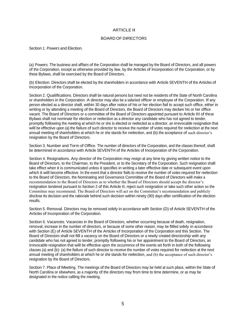 5 Section 1. Powers and Election. ARTICLE II BOARD OF DIRECTORS (a) Powers. The business and affairs of the Corporation shall be managed by the Board of Directors, and all powers of the Corporation, except as otherwise provided by law, by the Articles of Incorporation of the Corporation, or by these Bylaws, shall be exercised by the Board of Directors. (b) Election. Directors shall be elected by the shareholders in accordance with Article SEVENTH of the Articles of Incorporation of the Corporation. Section 2. Qualifications. Directors shall be natural persons but need not be residents of the State of North Carolina or shareholders in the Corporation. A director may also be a salaried officer or employee of the Corporation. If any person elected as a director shall, within 30 days after notice of his or her election fail to accept such office, either in writing or by attending a meeting of the Board of Directors, the Board of Directors may declare his or her office vacant. The Board of Directors or a committee of the Board of Directors appointed pursuant to Article III of these Bylaws shall not nominate for election or reelection as a director any candidate who has not agreed to tender, promptly following the meeting at which he or she is elected or reelected as a director, an irrevocable resignation that will be effective upon (a) the failure of such director to receive the number of votes required for reelection at the next annual meeting of shareholders at which he or she stands for reelection, and (b) the acceptance of such director’s resignation by the Board of Directors. Section 3. Number and Term of Office. The number of directors of the Corporation, and the classes thereof, shall be determined in accordance with Article SEVENTH of the Articles of Incorporation of the Corporation. Section 4. Resignations. Any director of the Corporation may resign at any time by giving written notice to the Board of Directors, to the Chairman, to the President, or to the Secretary of the Corporation. Such resignation shall take effect when it is communicated unless it specifies in writing a later effective date or subsequent event upon which it will become effective. In the event that a director fails to receive the number of votes required for reelection to the Board of Directors, the Nominating and Governance Committee of the Board of Directors will make a recommendation to the Board of Directors as to whether the Board of Directors should accept the director’s resignation tendered pursuant to Section 2 of this Article II, reject such resignation or take such other action as the Committee may recommend. The Board of Directors will act on the Committee’s recommendation and publicly disclose its decision and the rationale behind such decision within ninety (90) days after certification of the election results. Section 5. Removal. Directors may be removed solely in accordance with Section (D) of Article SEVENTH of the Articles of Incorporation of the Corporation. Section 6. Vacancies. Vacancies in the Board of Directors, whether occurring because of death, resignation, removal, increase in the number of directors, or because of some other reason, may be filled solely in accordance with Section (E) of Article SEVENTH of the Articles of Incorporation of the Corporation and this Section. The Board of Directors shall not fill a vacancy on the Board of Directors or a newly created directorship with any candidate who has not agreed to tender, promptly following his or her appointment to the Board of Directors, an irrevocable resignation that will be effective upon the occurrence of the events set forth in both of the following clauses (a) and (b): (a) the failure of such director to receive the number of votes required for reelection at the next annual meeting of shareholders at which he or she stands for reelection, and (b) the acceptance of such director’s resignation by the Board of Directors. Section 7. Place of Meeting. The meetings of the Board of Directors may be held at such place, within the State of North Carolina or elsewhere, as a majority of the directors may from time to time determine, or as may be designated in the notice calling the meeting.