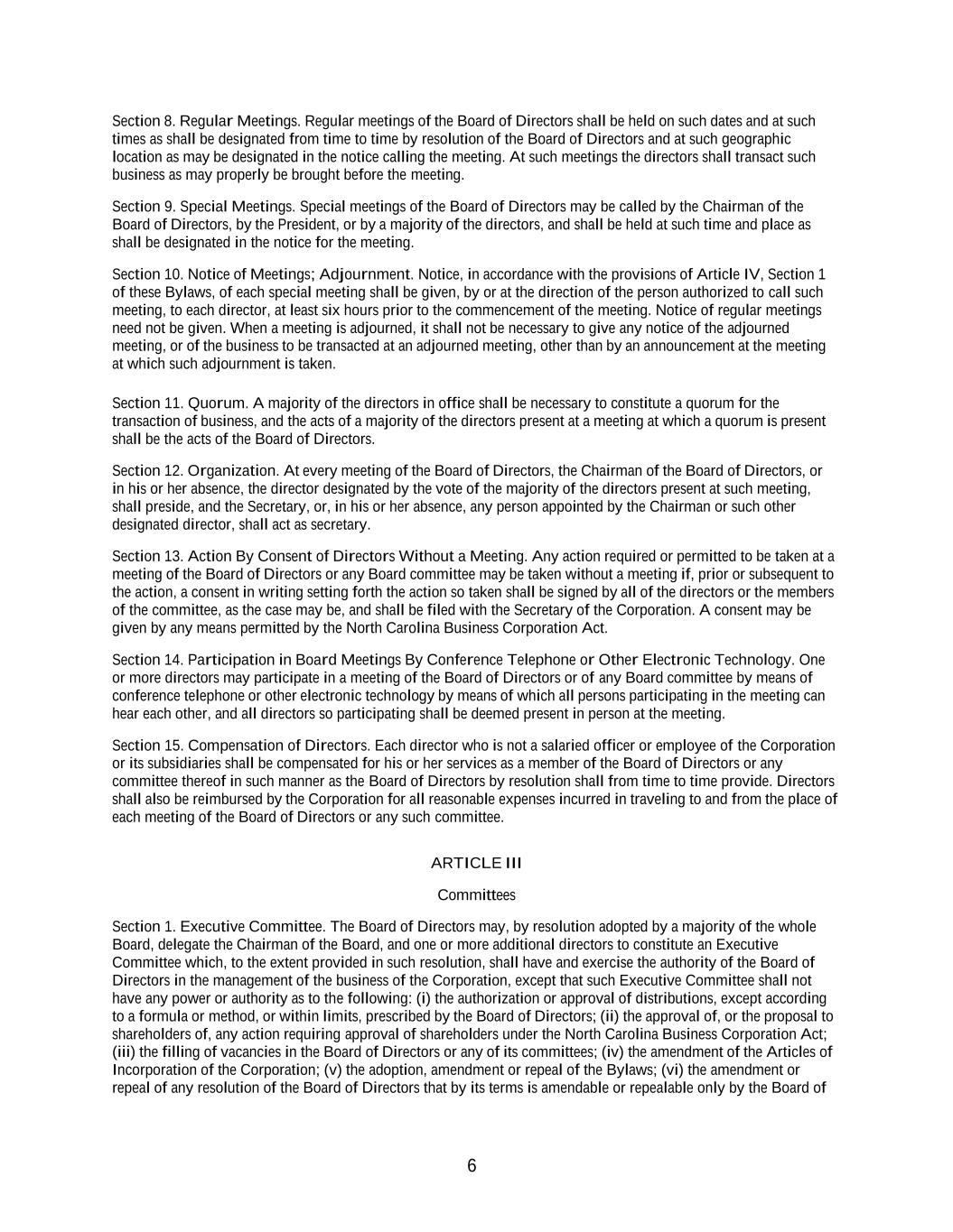 6 Section 8. Regular Meetings. Regular meetings of the Board of Directors shall be held on such dates and at such times as shall be designated from time to time by resolution of the Board of Directors and at such geographic location as may be designated in the notice calling the meeting. At such meetings the directors shall transact such business as may properly be brought before the meeting. Section 9. Special Meetings. Special meetings of the Board of Directors may be called by the Chairman of the Board of Directors, by the President, or by a majority of the directors, and shall be held at such time and place as shall be designated in the notice for the meeting. Section 10. Notice of Meetings; Adjournment. Notice, in accordance with the provisions of Article IV, Section 1 of these Bylaws, of each special meeting shall be given, by or at the direction of the person authorized to call such meeting, to each director, at least six hours prior to the commencement of the meeting. Notice of regular meetings need not be given. When a meeting is adjourned, it shall not be necessary to give any notice of the adjourned meeting, or of the business to be transacted at an adjourned meeting, other than by an announcement at the meeting at which such adjournment is taken. Section 11. Quorum. A majority of the directors in office shall be necessary to constitute a quorum for the transaction of business, and the acts of a majority of the directors present at a meeting at which a quorum is present shall be the acts of the Board of Directors. Section 12. Organization. At every meeting of the Board of Directors, the Chairman of the Board of Directors, or in his or her absence, the director designated by the vote of the majority of the directors present at such meeting, shall preside, and the Secretary, or, in his or her absence, any person appointed by the Chairman or such other designated director, shall act as secretary. Section 13. Action By Consent of Directors Without a Meeting. Any action required or permitted to be taken at a meeting of the Board of Directors or any Board committee may be taken without a meeting if, prior or subsequent to the action, a consent in writing setting forth the action so taken shall be signed by all of the directors or the members of the committee, as the case may be, and shall be filed with the Secretary of the Corporation. A consent may be given by any means permitted by the North Carolina Business Corporation Act. Section 14. Participation in Board Meetings By Conference Telephone or Other Electronic Technology. One or more directors may participate in a meeting of the Board of Directors or of any Board committee by means of conference telephone or other electronic technology by means of which all persons participating in the meeting can hear each other, and all directors so participating shall be deemed present in person at the meeting. Section 15. Compensation of Directors. Each director who is not a salaried officer or employee of the Corporation or its subsidiaries shall be compensated for his or her services as a member of the Board of Directors or any committee thereof in such manner as the Board of Directors by resolution shall from time to time provide. Directors shall also be reimbursed by the Corporation for all reasonable expenses incurred in traveling to and from the place of each meeting of the Board of Directors or any such committee. ARTICLE III Committees Section 1. Executive Committee. The Board of Directors may, by resolution adopted by a majority of the whole Board, delegate the Chairman of the Board, and one or more additional directors to constitute an Executive Committee which, to the extent provided in such resolution, shall have and exercise the authority of the Board of Directors in the management of the business of the Corporation, except that such Executive Committee shall not have any power or authority as to the following: (i) the authorization or approval of distributions, except according to a formula or method, or within limits, prescribed by the Board of Directors; (ii) the approval of, or the proposal to shareholders of, any action requiring approval of shareholders under the North Carolina Business Corporation Act; (iii) the filling of vacancies in the Board of Directors or any of its committees; (iv) the amendment of the Articles of Incorporation of the Corporation; (v) the adoption, amendment or repeal of the Bylaws; (vi) the amendment or repeal of any resolution of the Board of Directors that by its terms is amendable or repealable only by the Board of