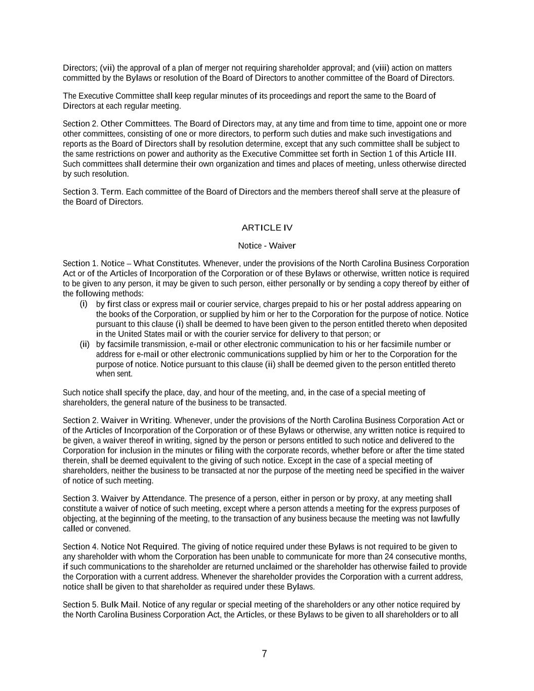 7 Directors; (vii) the approval of a plan of merger not requiring shareholder approval; and (viii) action on matters committed by the Bylaws or resolution of the Board of Directors to another committee of the Board of Directors. The Executive Committee shall keep regular minutes of its proceedings and report the same to the Board of Directors at each regular meeting. Section 2. Other Committees. The Board of Directors may, at any time and from time to time, appoint one or more other committees, consisting of one or more directors, to perform such duties and make such investigations and reports as the Board of Directors shall by resolution determine, except that any such committee shall be subject to the same restrictions on power and authority as the Executive Committee set forth in Section 1 of this Article III. Such committees shall determine their own organization and times and places of meeting, unless otherwise directed by such resolution. Section 3. Term. Each committee of the Board of Directors and the members thereof shall serve at the pleasure of the Board of Directors. ARTICLE IV Notice - Waiver Section 1. Notice – What Constitutes. Whenever, under the provisions of the North Carolina Business Corporation Act or of the Articles of Incorporation of the Corporation or of these Bylaws or otherwise, written notice is required to be given to any person, it may be given to such person, either personally or by sending a copy thereof by either of the following methods: (i) by first class or express mail or courier service, charges prepaid to his or her postal address appearing on the books of the Corporation, or supplied by him or her to the Corporation for the purpose of notice. Notice pursuant to this clause (i) shall be deemed to have been given to the person entitled thereto when deposited in the United States mail or with the courier service for delivery to that person; or (ii) by facsimile transmission, e-mail or other electronic communication to his or her facsimile number or address for e-mail or other electronic communications supplied by him or her to the Corporation for the purpose of notice. Notice pursuant to this clause (ii) shall be deemed given to the person entitled thereto when sent. Such notice shall specify the place, day, and hour of the meeting, and, in the case of a special meeting of shareholders, the general nature of the business to be transacted. Section 2. Waiver in Writing. Whenever, under the provisions of the North Carolina Business Corporation Act or of the Articles of Incorporation of the Corporation or of these Bylaws or otherwise, any written notice is required to be given, a waiver thereof in writing, signed by the person or persons entitled to such notice and delivered to the Corporation for inclusion in the minutes or filing with the corporate records, whether before or after the time stated therein, shall be deemed equivalent to the giving of such notice. Except in the case of a special meeting of shareholders, neither the business to be transacted at nor the purpose of the meeting need be specified in the waiver of notice of such meeting. Section 3. Waiver by Attendance. The presence of a person, either in person or by proxy, at any meeting shall constitute a waiver of notice of such meeting, except where a person attends a meeting for the express purposes of objecting, at the beginning of the meeting, to the transaction of any business because the meeting was not lawfully called or convened. Section 4. Notice Not Required. The giving of notice required under these Bylaws is not required to be given to any shareholder with whom the Corporation has been unable to communicate for more than 24 consecutive months, if such communications to the shareholder are returned unclaimed or the shareholder has otherwise failed to provide the Corporation with a current address. Whenever the shareholder provides the Corporation with a current address, notice shall be given to that shareholder as required under these Bylaws. Section 5. Bulk Mail. Notice of any regular or special meeting of the shareholders or any other notice required by the North Carolina Business Corporation Act, the Articles, or these Bylaws to be given to all shareholders or to all