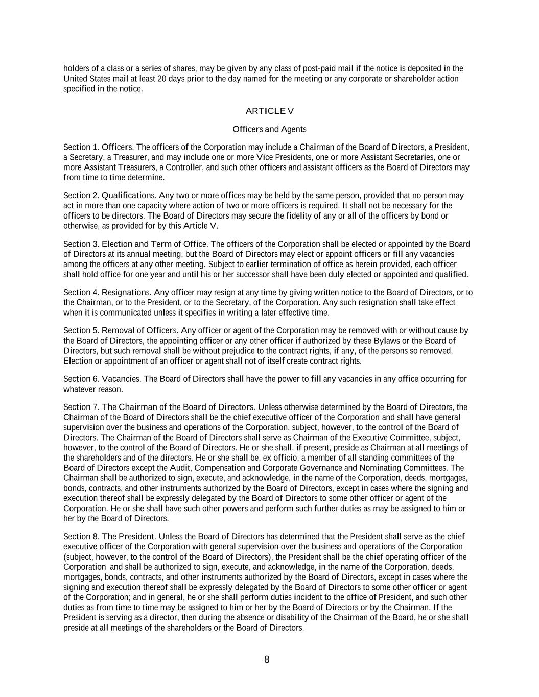 8 holders of a class or a series of shares, may be given by any class of post-paid mail if the notice is deposited in the United States mail at least 20 days prior to the day named for the meeting or any corporate or shareholder action specified in the notice. ARTICLE V Officers and Agents Section 1. Officers. The officers of the Corporation may include a Chairman of the Board of Directors, a President, a Secretary, a Treasurer, and may include one or more Vice Presidents, one or more Assistant Secretaries, one or more Assistant Treasurers, a Controller, and such other officers and assistant officers as the Board of Directors may from time to time determine. Section 2. Qualifications. Any two or more offices may be held by the same person, provided that no person may act in more than one capacity where action of two or more officers is required. It shall not be necessary for the officers to be directors. The Board of Directors may secure the fidelity of any or all of the officers by bond or otherwise, as provided for by this Article V. Section 3. Election and Term of Office. The officers of the Corporation shall be elected or appointed by the Board of Directors at its annual meeting, but the Board of Directors may elect or appoint officers or fill any vacancies among the officers at any other meeting. Subject to earlier termination of office as herein provided, each officer shall hold office for one year and until his or her successor shall have been duly elected or appointed and qualified. Section 4. Resignations. Any officer may resign at any time by giving written notice to the Board of Directors, or to the Chairman, or to the President, or to the Secretary, of the Corporation. Any such resignation shall take effect when it is communicated unless it specifies in writing a later effective time. Section 5. Removal of Officers. Any officer or agent of the Corporation may be removed with or without cause by the Board of Directors, the appointing officer or any other officer if authorized by these Bylaws or the Board of Directors, but such removal shall be without prejudice to the contract rights, if any, of the persons so removed. Election or appointment of an officer or agent shall not of itself create contract rights. Section 6. Vacancies. The Board of Directors shall have the power to fill any vacancies in any office occurring for whatever reason. Section 7. The Chairman of the Board of Directors. Unless otherwise determined by the Board of Directors, the Chairman of the Board of Directors shall be the chief executive officer of the Corporation and shall have general supervision over the business and operations of the Corporation, subject, however, to the control of the Board of Directors. The Chairman of the Board of Directors shall serve as Chairman of the Executive Committee, subject, however, to the control of the Board of Directors. He or she shall, if present, preside as Chairman at all meetings of the shareholders and of the directors. He or she shall be, ex officio, a member of all standing committees of the Board of Directors except the Audit, Compensation and Corporate Governance and Nominating Committees. The Chairman shall be authorized to sign, execute, and acknowledge, in the name of the Corporation, deeds, mortgages, bonds, contracts, and other instruments authorized by the Board of Directors, except in cases where the signing and execution thereof shall be expressly delegated by the Board of Directors to some other officer or agent of the Corporation. He or she shall have such other powers and perform such further duties as may be assigned to him or her by the Board of Directors. Section 8. The President. Unless the Board of Directors has determined that the President shall serve as the chief executive officer of the Corporation with general supervision over the business and operations of the Corporation (subject, however, to the control of the Board of Directors), the President shall be the chief operating officer of the Corporation and shall be authorized to sign, execute, and acknowledge, in the name of the Corporation, deeds, mortgages, bonds, contracts, and other instruments authorized by the Board of Directors, except in cases where the signing and execution thereof shall be expressly delegated by the Board of Directors to some other officer or agent of the Corporation; and in general, he or she shall perform duties incident to the office of President, and such other duties as from time to time may be assigned to him or her by the Board of Directors or by the Chairman. If the President is serving as a director, then during the absence or disability of the Chairman of the Board, he or she shall preside at all meetings of the shareholders or the Board of Directors.