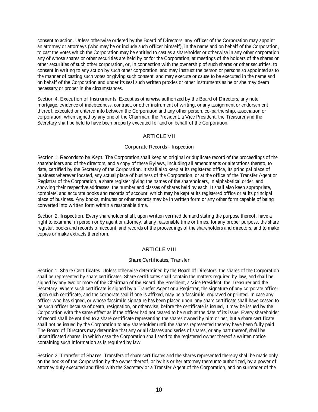 10 consent to action. Unless otherwise ordered by the Board of Directors, any officer of the Corporation may appoint an attorney or attorneys (who may be or include such officer himself), in the name and on behalf of the Corporation, to cast the votes which the Corporation may be entitled to cast as a shareholder or otherwise in any other corporation any of whose shares or other securities are held by or for the Corporation, at meetings of the holders of the shares or other securities of such other corporation, or, in connection with the ownership of such shares or other securities, to consent in writing to any action by such other corporation, and may instruct the person or persons so appointed as to the manner of casting such votes or giving such consent, and may execute or cause to be executed in the name and on behalf of the Corporation and under its seal such written proxies or other instruments as he or she may deem necessary or proper in the circumstances. Section 4. Execution of Instruments. Except as otherwise authorized by the Board of Directors, any note, mortgage, evidence of indebtedness, contract, or other instrument of writing, or any assignment or endorsement thereof, executed or entered into between the Corporation and any other person, co-partnership, association or corporation, when signed by any one of the Chairman, the President, a Vice President, the Treasurer and the Secretary shall be held to have been properly executed for and on behalf of the Corporation. ARTICLE VII Corporate Records - Inspection Section 1. Records to be Kept. The Corporation shall keep an original or duplicate record of the proceedings of the shareholders and of the directors, and a copy of these Bylaws, including all amendments or alterations thereto, to date, certified by the Secretary of the Corporation. It shall also keep at its registered office, its principal place of business wherever located, any actual place of business of the Corporation, or at the office of the Transfer Agent or Registrar of the Corporation, a share register giving the names of the shareholders, in alphabetical order, and showing their respective addresses, the number and classes of shares held by each. It shall also keep appropriate, complete, and accurate books and records of account, which may be kept at its registered office or at its principal place of business. Any books, minutes or other records may be in written form or any other form capable of being converted into written form within a reasonable time. Section 2. Inspection. Every shareholder shall, upon written verified demand stating the purpose thereof, have a right to examine, in person or by agent or attorney, at any reasonable time or times, for any proper purpose, the share register, books and records of account, and records of the proceedings of the shareholders and directors, and to make copies or make extracts therefrom. ARTICLE VIII Share Certificates, Transfer Section 1. Share Certificates. Unless otherwise determined by the Board of Directors, the shares of the Corporation shall be represented by share certificates. Share certificates shall contain the matters required by law, and shall be signed by any two or more of the Chairman of the Board, the President, a Vice President, the Treasurer and the Secretary. Where such certificate is signed by a Transfer Agent or a Registrar, the signature of any corporate officer upon such certificate, and the corporate seal if one is affixed, may be a facsimile, engraved or printed. In case any officer who has signed, or whose facsimile signature has been placed upon, any share certificate shall have ceased to be such officer because of death, resignation, or otherwise, before the certificate is issued, it may be issued by the Corporation with the same effect as if the officer had not ceased to be such at the date of its issue. Every shareholder of record shall be entitled to a share certificate representing the shares owned by him or her, but a share certificate shall not be issued by the Corporation to any shareholder until the shares represented thereby have been fully paid. The Board of Directors may determine that any or all classes and series of shares, or any part thereof, shall be uncertificated shares, in which case the Corporation shall send to the registered owner thereof a written notice containing such information as is required by law. Section 2. Transfer of Shares. Transfers of share certificates and the shares represented thereby shall be made only on the books of the Corporation by the owner thereof, or by his or her attorney thereunto authorized, by a power of attorney duly executed and filed with the Secretary or a Transfer Agent of the Corporation, and on surrender of the