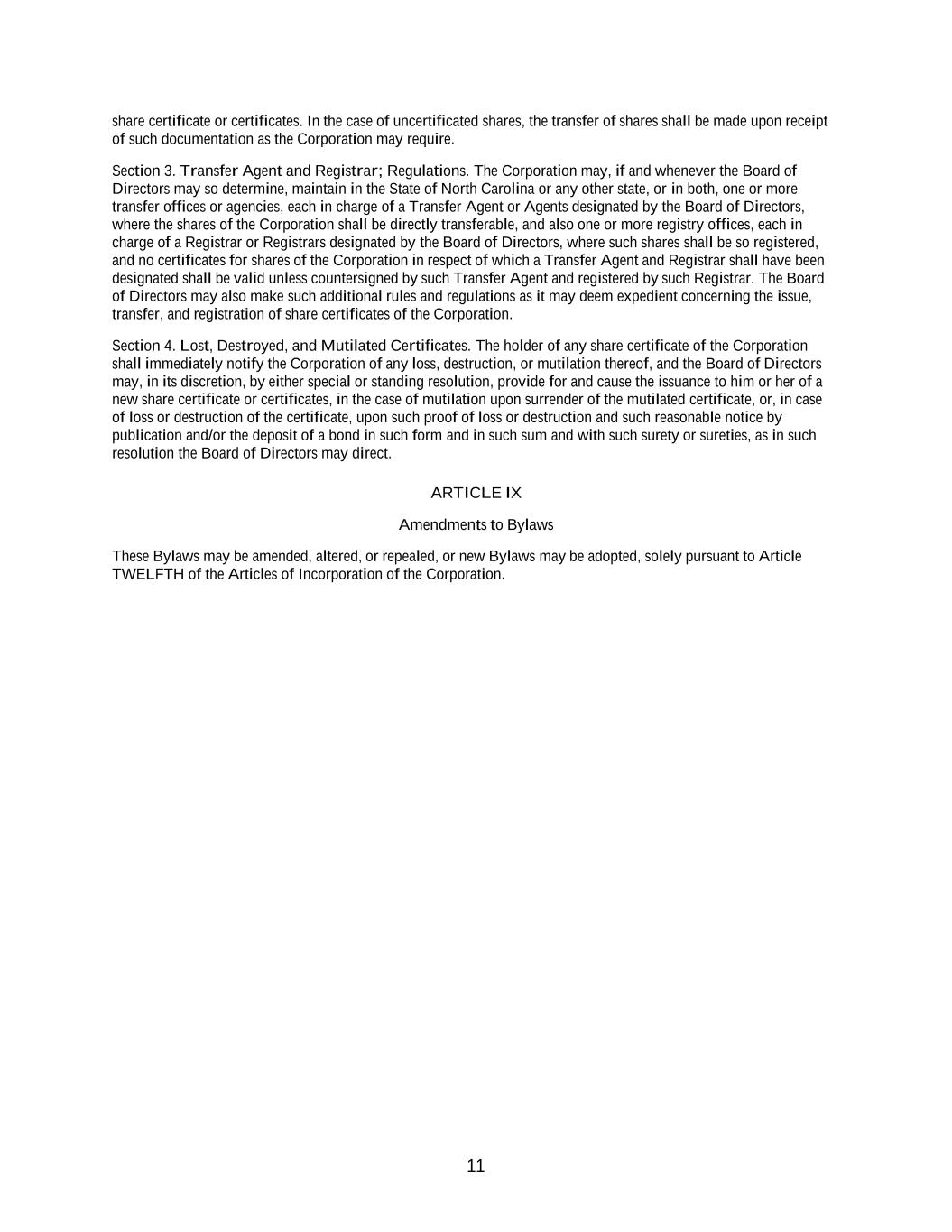 11 share certificate or certificates. In the case of uncertificated shares, the transfer of shares shall be made upon receipt of such documentation as the Corporation may require. Section 3. Transfer Agent and Registrar; Regulations. The Corporation may, if and whenever the Board of Directors may so determine, maintain in the State of North Carolina or any other state, or in both, one or more transfer offices or agencies, each in charge of a Transfer Agent or Agents designated by the Board of Directors, where the shares of the Corporation shall be directly transferable, and also one or more registry offices, each in charge of a Registrar or Registrars designated by the Board of Directors, where such shares shall be so registered, and no certificates for shares of the Corporation in respect of which a Transfer Agent and Registrar shall have been designated shall be valid unless countersigned by such Transfer Agent and registered by such Registrar. The Board of Directors may also make such additional rules and regulations as it may deem expedient concerning the issue, transfer, and registration of share certificates of the Corporation. Section 4. Lost, Destroyed, and Mutilated Certificates. The holder of any share certificate of the Corporation shall immediately notify the Corporation of any loss, destruction, or mutilation thereof, and the Board of Directors may, in its discretion, by either special or standing resolution, provide for and cause the issuance to him or her of a new share certificate or certificates, in the case of mutilation upon surrender of the mutilated certificate, or, in case of loss or destruction of the certificate, upon such proof of loss or destruction and such reasonable notice by publication and/or the deposit of a bond in such form and in such sum and with such surety or sureties, as in such resolution the Board of Directors may direct. ARTICLE IX Amendments to Bylaws These Bylaws may be amended, altered, or repealed, or new Bylaws may be adopted, solely pursuant to Article TWELFTH of the Articles of Incorporation of the Corporation.