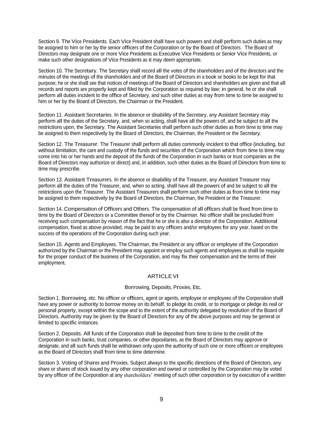 9 Section 9. The Vice Presidents. Each Vice President shall have such powers and shall perform such duties as may be assigned to him or her by the senior officers of the Corporation or by the Board of Directors. The Board of Directors may designate one or more Vice Presidents as Executive Vice Presidents or Senior Vice Presidents, or make such other designations of Vice Presidents as it may deem appropriate. Section 10. The Secretary. The Secretary shall record all the votes of the shareholders and of the directors and the minutes of the meetings of the shareholders and of the Board of Directors in a book or books to be kept for that purpose; he or she shall see that notices of meetings of the Board of Directors and shareholders are given and that all records and reports are properly kept and filed by the Corporation as required by law; in general, he or she shall perform all duties incident to the office of Secretary, and such other duties as may from time to time be assigned to him or her by the Board of Directors, the Chairman or the President. Section 11. Assistant Secretaries. In the absence or disability of the Secretary, any Assistant Secretary may perform all the duties of the Secretary, and, when so acting, shall have all the powers of, and be subject to all the restrictions upon, the Secretary. The Assistant Secretaries shall perform such other duties as from time to time may be assigned to them respectively by the Board of Directors, the Chairman, the President or the Secretary. Section 12. The Treasurer. The Treasurer shall perform all duties commonly incident to that office (including, but without limitation, the care and custody of the funds and securities of the Corporation which from time to time may come into his or her hands and the deposit of the funds of the Corporation in such banks or trust companies as the Board of Directors may authorize or direct) and, in addition, such other duties as the Board of Directors from time to time may prescribe. Section 13. Assistant Treasurers. In the absence or disability of the Treasurer, any Assistant Treasurer may perform all the duties of the Treasurer, and, when so acting, shall have all the powers of and be subject to all the restrictions upon the Treasurer. The Assistant Treasurers shall perform such other duties as from time to time may be assigned to them respectively by the Board of Directors, the Chairman, the President or the Treasurer. Section 14. Compensation of Officers and Others. The compensation of all officers shall be fixed from time to time by the Board of Directors or a Committee thereof or by the Chairman. No officer shall be precluded from receiving such compensation by reason of the fact that he or she is also a director of the Corporation. Additional compensation, fixed as above provided, may be paid to any officers and/or employees for any year, based on the success of the operations of the Corporation during such year. Section 15. Agents and Employees. The Chairman, the President or any officer or employee of the Corporation authorized by the Chairman or the President may appoint or employ such agents and employees as shall be requisite for the proper conduct of the business of the Corporation, and may fix their compensation and the terms of their employment. ARTICLE VI Borrowing, Deposits, Proxies, Etc. Section 1. Borrowing, etc. No officer or officers, agent or agents, employee or employees of the Corporation shall have any power or authority to borrow money on its behalf, to pledge its credit, or to mortgage or pledge its real or personal property, except within the scope and to the extent of the authority delegated by resolution of the Board of Directors. Authority may be given by the Board of Directors for any of the above purposes and may be general or limited to specific instances. Section 2. Deposits. All funds of the Corporation shall be deposited from time to time to the credit of the Corporation in such banks, trust companies, or other depositaries, as the Board of Directors may approve or designate, and all such funds shall be withdrawn only upon the authority of such one or more officers or employees as the Board of Directors shall from time to time determine. Section 3. Voting of Shares and Proxies. Subject always to the specific directions of the Board of Directors, any share or shares of stock issued by any other corporation and owned or controlled by the Corporation may be voted by any officer of the Corporation at any shareholders’ meeting of such other corporation or by execution of a written