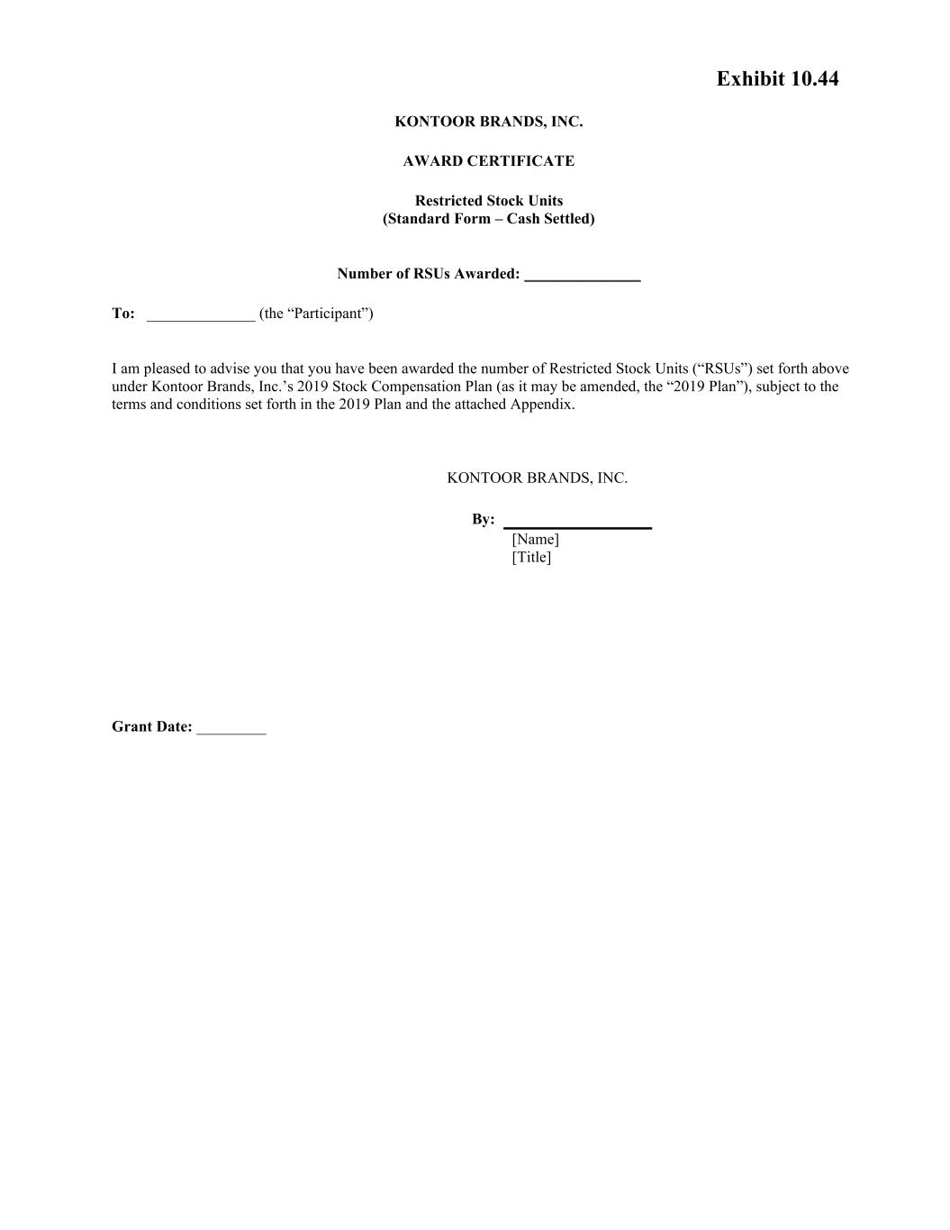KONTOOR BRANDS, INC. AWARD CERTIFICATE Restricted Stock Units (Standard Form – Cash Settled) Number of RSUs Awarded: _______________ To: ______________ (the “Participant”) I am pleased to advise you that you have been awarded the number of Restricted Stock Units (“RSUs”) set forth above under Kontoor Brands, Inc.’s 2019 Stock Compensation Plan (as it may be amended, the “2019 Plan”), subject to the terms and conditions set forth in the 2019 Plan and the attached Appendix. KONTOOR BRANDS, INC. Grant Date: _________ By: [Name] [Title]