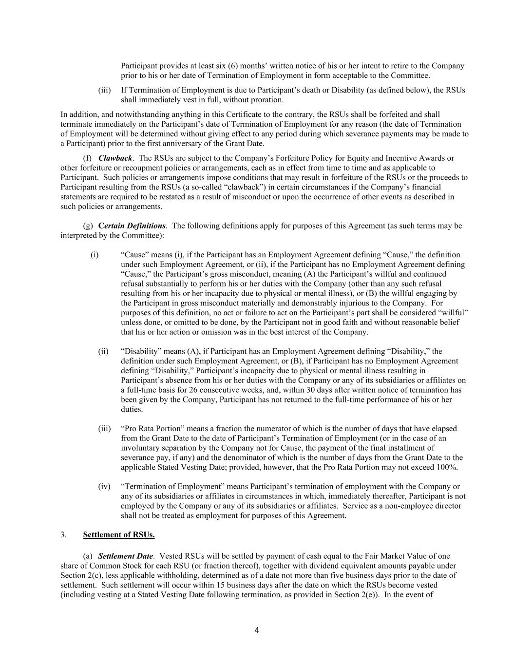 4 Participant provides at least six (6) months’ written notice of his or her intent to retire to the Company prior to his or her date of Termination of Employment in form acceptable to the Committee. (iii) If Termination of Employment is due to Participant’s death or Disability (as defined below), the RSUs shall immediately vest in full, without proration. In addition, and notwithstanding anything in this Certificate to the contrary, the RSUs shall be forfeited and shall terminate immediately on the Participant’s date of Termination of Employment for any reason (the date of Termination of Employment will be determined without giving effect to any period during which severance payments may be made to a Participant) prior to the first anniversary of the Grant Date. (f) Clawback. The RSUs are subject to the Company’s Forfeiture Policy for Equity and Incentive Awards or other forfeiture or recoupment policies or arrangements, each as in effect from time to time and as applicable to Participant. Such policies or arrangements impose conditions that may result in forfeiture of the RSUs or the proceeds to Participant resulting from the RSUs (a so-called “clawback”) in certain circumstances if the Company’s financial statements are required to be restated as a result of misconduct or upon the occurrence of other events as described in such policies or arrangements. (g) Certain Definitions. The following definitions apply for purposes of this Agreement (as such terms may be interpreted by the Committee): (i) “Cause” means (i), if the Participant has an Employment Agreement defining “Cause,” the definition under such Employment Agreement, or (ii), if the Participant has no Employment Agreement defining “Cause,” the Participant’s gross misconduct, meaning (A) the Participant’s willful and continued refusal substantially to perform his or her duties with the Company (other than any such refusal resulting from his or her incapacity due to physical or mental illness), or (B) the willful engaging by the Participant in gross misconduct materially and demonstrably injurious to the Company. For purposes of this definition, no act or failure to act on the Participant’s part shall be considered “willful” unless done, or omitted to be done, by the Participant not in good faith and without reasonable belief that his or her action or omission was in the best interest of the Company. (ii) “Disability” means (A), if Participant has an Employment Agreement defining “Disability,” the definition under such Employment Agreement, or (B), if Participant has no Employment Agreement defining “Disability,” Participant’s incapacity due to physical or mental illness resulting in Participant’s absence from his or her duties with the Company or any of its subsidiaries or affiliates on a full-time basis for 26 consecutive weeks, and, within 30 days after written notice of termination has been given by the Company, Participant has not returned to the full-time performance of his or her duties. (iii) “Pro Rata Portion” means a fraction the numerator of which is the number of days that have elapsed from the Grant Date to the date of Participant’s Termination of Employment (or in the case of an involuntary separation by the Company not for Cause, the payment of the final installment of severance pay, if any) and the denominator of which is the number of days from the Grant Date to the applicable Stated Vesting Date; provided, however, that the Pro Rata Portion may not exceed 100%. (iv) “Termination of Employment” means Participant’s termination of employment with the Company or any of its subsidiaries or affiliates in circumstances in which, immediately thereafter, Participant is not employed by the Company or any of its subsidiaries or affiliates. Service as a non-employee director shall not be treated as employment for purposes of this Agreement. 3. Settlement of RSUs. (a) Settlement Date. Vested RSUs will be settled by payment of cash equal to the Fair Market Value of one share of Common Stock for each RSU (or fraction thereof), together with dividend equivalent amounts payable under Section 2(c), less applicable withholding, determined as of a date not more than five business days prior to the date of settlement. Such settlement will occur within 15 business days after the date on which the RSUs become vested (including vesting at a Stated Vesting Date following termination, as provided in Section 2(e)). In the event of