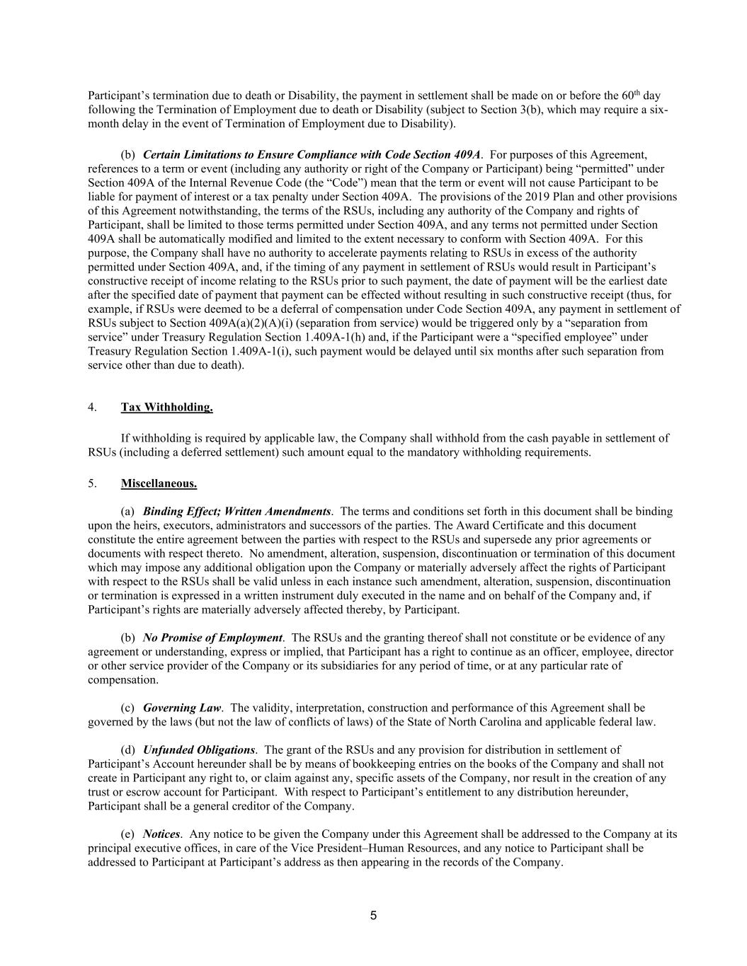 5 Participant’s termination due to death or Disability, the payment in settlement shall be made on or before the 60th day following the Termination of Employment due to death or Disability (subject to Section 3(b), which may require a six- month delay in the event of Termination of Employment due to Disability). (b) Certain Limitations to Ensure Compliance with Code Section 409A. For purposes of this Agreement, references to a term or event (including any authority or right of the Company or Participant) being “permitted” under Section 409A of the Internal Revenue Code (the “Code”) mean that the term or event will not cause Participant to be liable for payment of interest or a tax penalty under Section 409A. The provisions of the 2019 Plan and other provisions of this Agreement notwithstanding, the terms of the RSUs, including any authority of the Company and rights of Participant, shall be limited to those terms permitted under Section 409A, and any terms not permitted under Section 409A shall be automatically modified and limited to the extent necessary to conform with Section 409A. For this purpose, the Company shall have no authority to accelerate payments relating to RSUs in excess of the authority permitted under Section 409A, and, if the timing of any payment in settlement of RSUs would result in Participant’s constructive receipt of income relating to the RSUs prior to such payment, the date of payment will be the earliest date after the specified date of payment that payment can be effected without resulting in such constructive receipt (thus, for example, if RSUs were deemed to be a deferral of compensation under Code Section 409A, any payment in settlement of RSUs subject to Section 409A(a)(2)(A)(i) (separation from service) would be triggered only by a “separation from service” under Treasury Regulation Section 1.409A-1(h) and, if the Participant were a “specified employee” under Treasury Regulation Section 1.409A-1(i), such payment would be delayed until six months after such separation from service other than due to death). 4. Tax Withholding. If withholding is required by applicable law, the Company shall withhold from the cash payable in settlement of RSUs (including a deferred settlement) such amount equal to the mandatory withholding requirements. 5. Miscellaneous. (a) Binding Effect; Written Amendments. The terms and conditions set forth in this document shall be binding upon the heirs, executors, administrators and successors of the parties. The Award Certificate and this document constitute the entire agreement between the parties with respect to the RSUs and supersede any prior agreements or documents with respect thereto. No amendment, alteration, suspension, discontinuation or termination of this document which may impose any additional obligation upon the Company or materially adversely affect the rights of Participant with respect to the RSUs shall be valid unless in each instance such amendment, alteration, suspension, discontinuation or termination is expressed in a written instrument duly executed in the name and on behalf of the Company and, if Participant’s rights are materially adversely affected thereby, by Participant. (b) No Promise of Employment. The RSUs and the granting thereof shall not constitute or be evidence of any agreement or understanding, express or implied, that Participant has a right to continue as an officer, employee, director or other service provider of the Company or its subsidiaries for any period of time, or at any particular rate of compensation. (c) Governing Law. The validity, interpretation, construction and performance of this Agreement shall be governed by the laws (but not the law of conflicts of laws) of the State of North Carolina and applicable federal law. (d) Unfunded Obligations. The grant of the RSUs and any provision for distribution in settlement of Participant’s Account hereunder shall be by means of bookkeeping entries on the books of the Company and shall not create in Participant any right to, or claim against any, specific assets of the Company, nor result in the creation of any trust or escrow account for Participant. With respect to Participant’s entitlement to any distribution hereunder, Participant shall be a general creditor of the Company. (e) Notices. Any notice to be given the Company under this Agreement shall be addressed to the Company at its principal executive offices, in care of the Vice President–Human Resources, and any notice to Participant shall be addressed to Participant at Participant’s address as then appearing in the records of the Company.