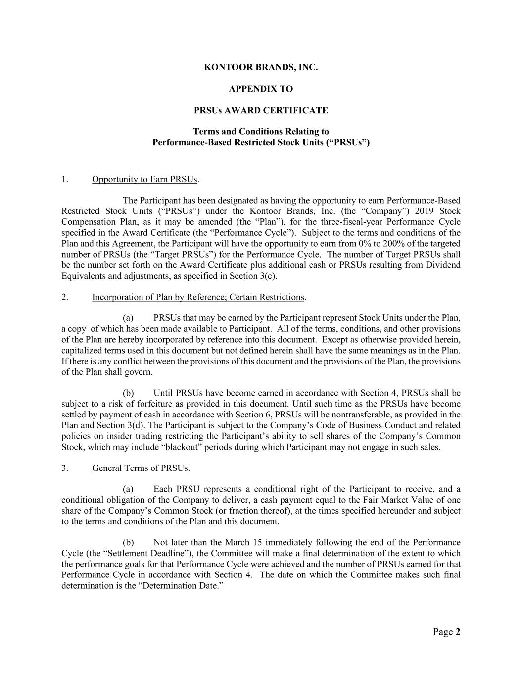 Page 2 KONTOOR BRANDS, INC. APPENDIX TO PRSUs AWARD CERTIFICATE Terms and Conditions Relating to Performance-Based Restricted Stock Units (“PRSUs”) 1. Opportunity to Earn PRSUs. The Participant has been designated as having the opportunity to earn Performance-Based Restricted Stock Units (“PRSUs”) under the Kontoor Brands, Inc. (the “Company”) 2019 Stock Compensation Plan, as it may be amended (the “Plan”), for the three-fiscal-year Performance Cycle specified in the Award Certificate (the “Performance Cycle”). Subject to the terms and conditions of the Plan and this Agreement, the Participant will have the opportunity to earn from 0% to 200% of the targeted number of PRSUs (the “Target PRSUs”) for the Performance Cycle. The number of Target PRSUs shall be the number set forth on the Award Certificate plus additional cash or PRSUs resulting from Dividend Equivalents and adjustments, as specified in Section 3(c). 2. Incorporation of Plan by Reference; Certain Restrictions. (a) PRSUs that may be earned by the Participant represent Stock Units under the Plan, a copy of which has been made available to Participant. All of the terms, conditions, and other provisions of the Plan are hereby incorporated by reference into this document. Except as otherwise provided herein, capitalized terms used in this document but not defined herein shall have the same meanings as in the Plan. If there is any conflict between the provisions of this document and the provisions of the Plan, the provisions of the Plan shall govern. (b) Until PRSUs have become earned in accordance with Section 4, PRSUs shall be subject to a risk of forfeiture as provided in this document. Until such time as the PRSUs have become settled by payment of cash in accordance with Section 6, PRSUs will be nontransferable, as provided in the Plan and Section 3(d). The Participant is subject to the Company’s Code of Business Conduct and related policies on insider trading restricting the Participant’s ability to sell shares of the Company’s Common Stock, which may include “blackout” periods during which Participant may not engage in such sales. 3. General Terms of PRSUs. (a) Each PRSU represents a conditional right of the Participant to receive, and a conditional obligation of the Company to deliver, a cash payment equal to the Fair Market Value of one share of the Company’s Common Stock (or fraction thereof), at the times specified hereunder and subject to the terms and conditions of the Plan and this document. (b) Not later than the March 15 immediately following the end of the Performance Cycle (the “Settlement Deadline”), the Committee will make a final determination of the extent to which the performance goals for that Performance Cycle were achieved and the number of PRSUs earned for that Performance Cycle in accordance with Section 4. The date on which the Committee makes such final determination is the “Determination Date.”