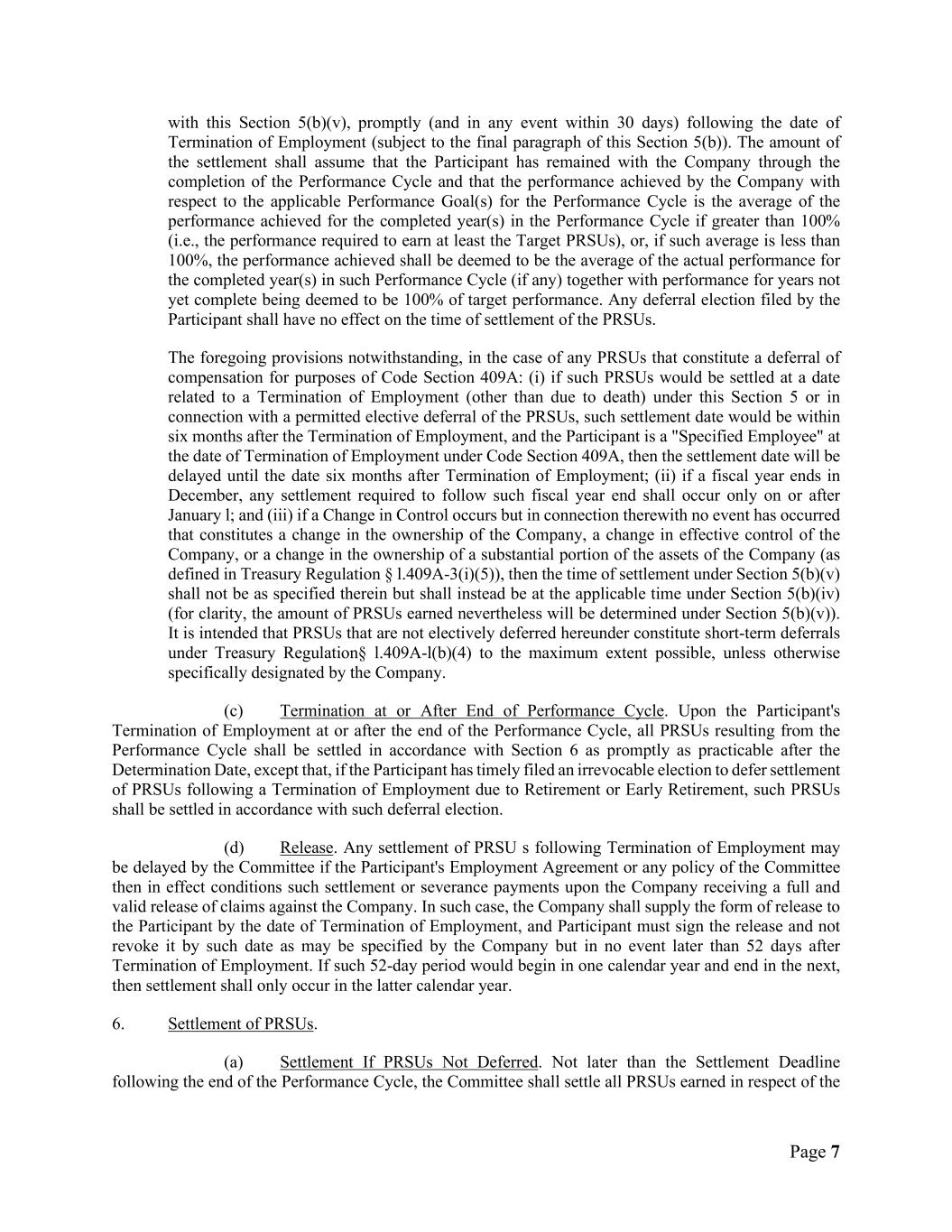 Page 7 with this Section 5(b)(v), promptly (and in any event within 30 days) following the date of Termination of Employment (subject to the final paragraph of this Section 5(b)). The amount of the settlement shall assume that the Participant has remained with the Company through the completion of the Performance Cycle and that the performance achieved by the Company with respect to the applicable Performance Goal(s) for the Performance Cycle is the average of the performance achieved for the completed year(s) in the Performance Cycle if greater than 100% (i.e., the performance required to earn at least the Target PRSUs), or, if such average is less than 100%, the performance achieved shall be deemed to be the average of the actual performance for the completed year(s) in such Performance Cycle (if any) together with performance for years not yet complete being deemed to be 100% of target performance. Any deferral election filed by the Participant shall have no effect on the time of settlement of the PRSUs. The foregoing provisions notwithstanding, in the case of any PRSUs that constitute a deferral of compensation for purposes of Code Section 409A: (i) if such PRSUs would be settled at a date related to a Termination of Employment (other than due to death) under this Section 5 or in connection with a permitted elective deferral of the PRSUs, such settlement date would be within six months after the Termination of Employment, and the Participant is a "Specified Employee" at the date of Termination of Employment under Code Section 409A, then the settlement date will be delayed until the date six months after Termination of Employment; (ii) if a fiscal year ends in December, any settlement required to follow such fiscal year end shall occur only on or after January l; and (iii) if a Change in Control occurs but in connection therewith no event has occurred that constitutes a change in the ownership of the Company, a change in effective control of the Company, or a change in the ownership of a substantial portion of the assets of the Company (as defined in Treasury Regulation § l.409A-3(i)(5)), then the time of settlement under Section 5(b)(v) shall not be as specified therein but shall instead be at the applicable time under Section 5(b)(iv) (for clarity, the amount of PRSUs earned nevertheless will be determined under Section 5(b)(v)). It is intended that PRSUs that are not electively deferred hereunder constitute short-term deferrals under Treasury Regulation§ l.409A-l(b)(4) to the maximum extent possible, unless otherwise specifically designated by the Company. (c) Termination at or After End of Performance Cycle. Upon the Participant's Termination of Employment at or after the end of the Performance Cycle, all PRSUs resulting from the Performance Cycle shall be settled in accordance with Section 6 as promptly as practicable after the Determination Date, except that, if the Participant has timely filed an irrevocable election to defer settlement of PRSUs following a Termination of Employment due to Retirement or Early Retirement, such PRSUs shall be settled in accordance with such deferral election. (d) Release. Any settlement of PRSU s following Termination of Employment may be delayed by the Committee if the Participant's Employment Agreement or any policy of the Committee then in effect conditions such settlement or severance payments upon the Company receiving a full and valid release of claims against the Company. In such case, the Company shall supply the form of release to the Participant by the date of Termination of Employment, and Participant must sign the release and not revoke it by such date as may be specified by the Company but in no event later than 52 days after Termination of Employment. If such 52-day period would begin in one calendar year and end in the next, then settlement shall only occur in the latter calendar year. 6. Settlement of PRSUs. (a) Settlement If PRSUs Not Deferred. Not later than the Settlement Deadline following the end of the Performance Cycle, the Committee shall settle all PRSUs earned in respect of the