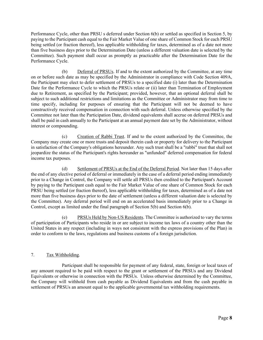 Page 8 Performance Cycle, other than PRSU s deferred under Section 6(b) or settled as specified in Section 5, by paying to the Participant cash equal to the Fair Market Value of one share of Common Stock for each PRSU being settled (or fraction thereof), less applicable withholding for taxes, determined as of a date not more than five business days prior to the Determination Date (unless a different valuation date is selected by the Committee). Such payment shall occur as promptly as practicable after the Determination Date for the Performance Cycle. (b) Deferral of PRSUs. If and to the extent authorized by the Committee, at any time on or before such date as may be specified by the Administrator in compliance with Code Section 409A, the Participant may elect to defer settlement of PRSUs to a specified date (i) later than the Determination Date for the Performance Cycle to which the PRSUs relate or (ii) later than Termination of Employment due to Retirement, as specified by the Participant; provided, however, that an optional deferral shall be subject to such additional restrictions and limitations as the Committee or Administrator may from time to time specify, including for purposes of ensuring that the Participant will not be deemed to have constructively received compensation in connection with such deferral. Unless otherwise specified by the Committee not later than the Participation Date, dividend equivalents shall accrue on deferred PRSUs and shall be paid in cash annually to the Participant at an annual payment date set by the Administrator, without interest or compounding. (c) Creation of Rabbi Trust. If and to the extent authorized by the Committee, the Company may create one or more trusts and deposit therein cash or property for delivery to the Participant in satisfaction of the Company's obligations hereunder. Any such trust shall be a "rabbi" trust that shall not jeopardize the status of the Participant's rights hereunder as "unfunded" deferred compensation for federal income tax purposes. (d) Settlement of PRSUs at the End of the Deferral Period. Not later than 15 days after the end of any elective period of deferral or immediately in the case of a deferral period ending immediately prior to a Change in Control, the Company will settle all PRSUs then credited to the Participant's Account by paying to the Participant cash equal to the Fair Market Value of one share of Common Stock for each PRSU being settled (or fraction thereof), less applicable withholding for taxes, determined as of a date not more than five business days prior to the date of settlement (unless a different valuation date is selected by the Committee). Any deferral period will end on an accelerated basis immediately prior to a Change in Control, except as limited under the final paragraph of Section 5(b) and Section 6(b). (e) PRSUs Held by Non-US Residents. The Committee is authorized to vary the terms of participation of Participants who reside in or are subject to income tax laws of a country other than the United States in any respect (including in ways not consistent with the express provisions of the Plan) in order to conform to the laws, regulations and business customs of a foreign jurisdiction. 7. Tax Withholding. Participant shall be responsible for payment of any federal, state, foreign or local taxes of any amount required to be paid with respect to the grant or settlement of the PRSUs and any Dividend Equivalents or otherwise in connection with the PRSUs. Unless otherwise determined by the Committee, the Company will withhold from cash payable as Dividend Equivalents and from the cash payable in settlement of PRSUs an amount equal to the applicable governmental tax withholding requirements.