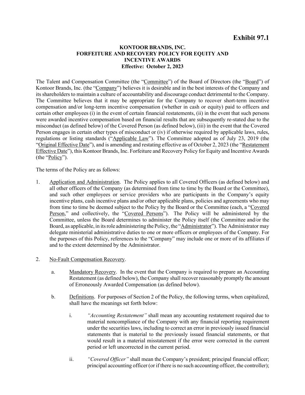 KONTOOR BRANDS, INC. FORFEITURE AND RECOVERY POLICY FOR EQUITY AND INCENTIVE AWARDS Effective: October 2, 2023 The Talent and Compensation Committee (the “Committee”) of the Board of Directors (the “Board”) of Kontoor Brands, Inc. (the “Company”) believes it is desirable and in the best interests of the Company and its shareholders to maintain a culture of accountability and discourage conduct detrimental to the Company. The Committee believes that it may be appropriate for the Company to recover short-term incentive compensation and/or long-term incentive compensation (whether in cash or equity) paid to officers and certain other employees (i) in the event of certain financial restatements, (ii) in the event that such persons were awarded incentive compensation based on financial results that are subsequently re-stated due to the misconduct (as defined below) of the Covered Person (as defined below), (iii) in the event that the Covered Person engages in certain other types of misconduct or (iv) if otherwise required by applicable laws, rules, regulations or listing standards (“Applicable Law”). The Committee adopted as of July 23, 2019 (the “Original Effective Date”), and is amending and restating effective as of October 2, 2023 (the “Restatement Effective Date”), this Kontoor Brands, Inc. Forfeiture and Recovery Policy for Equity and Incentive Awards (the “Policy”). The terms of the Policy are as follows: 1. Application and Administration. The Policy applies to all Covered Officers (as defined below) and all other officers of the Company (as determined from time to time by the Board or the Committee), and such other employees or service providers who are participants in the Company’s equity incentive plans, cash incentive plans and/or other applicable plans, policies and agreements who may from time to time be deemed subject to the Policy by the Board or the Committee (each, a “Covered Person,” and collectively, the “Covered Persons”). The Policy will be administered by the Committee, unless the Board determines to administer the Policy itself (the Committee and/or the Board, as applicable, in its role administering the Policy, the “Administrator”). The Administrator may delegate ministerial administrative duties to one or more officers or employees of the Company. For the purposes of this Policy, references to the “Company” may include one or more of its affiliates if and to the extent determined by the Administrator. 2. No-Fault Compensation Recovery. a. Mandatory Recovery. In the event that the Company is required to prepare an Accounting Restatement (as defined below), the Company shall recover reasonably promptly the amount of Erroneously Awarded Compensation (as defined below). b. Definitions. For purposes of Section 2 of the Policy, the following terms, when capitalized, shall have the meanings set forth below: i. “Accounting Restatement” shall mean any accounting restatement required due to material noncompliance of the Company with any financial reporting requirement under the securities laws, including to correct an error in previously issued financial statements that is material to the previously issued financial statements, or that would result in a material misstatement if the error were corrected in the current period or left uncorrected in the current period. ii. “Covered Officer” shall mean the Company’s president; principal financial officer; principal accounting officer (or if there is no such accounting officer, the controller);