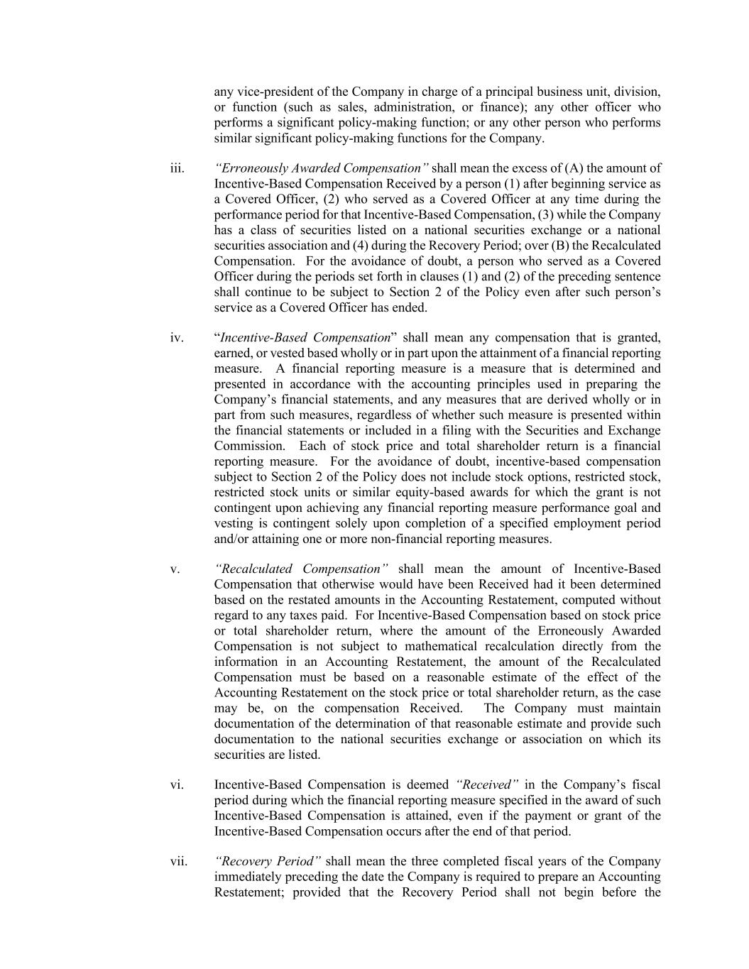 any vice-president of the Company in charge of a principal business unit, division, or function (such as sales, administration, or finance); any other officer who performs a significant policy-making function; or any other person who performs similar significant policy-making functions for the Company. iii. “Erroneously Awarded Compensation” shall mean the excess of (A) the amount of Incentive-Based Compensation Received by a person (1) after beginning service as a Covered Officer, (2) who served as a Covered Officer at any time during the performance period for that Incentive-Based Compensation, (3) while the Company has a class of securities listed on a national securities exchange or a national securities association and (4) during the Recovery Period; over (B) the Recalculated Compensation. For the avoidance of doubt, a person who served as a Covered Officer during the periods set forth in clauses (1) and (2) of the preceding sentence shall continue to be subject to Section 2 of the Policy even after such person’s service as a Covered Officer has ended. iv. “Incentive-Based Compensation” shall mean any compensation that is granted, earned, or vested based wholly or in part upon the attainment of a financial reporting measure. A financial reporting measure is a measure that is determined and presented in accordance with the accounting principles used in preparing the Company’s financial statements, and any measures that are derived wholly or in part from such measures, regardless of whether such measure is presented within the financial statements or included in a filing with the Securities and Exchange Commission. Each of stock price and total shareholder return is a financial reporting measure. For the avoidance of doubt, incentive-based compensation subject to Section 2 of the Policy does not include stock options, restricted stock, restricted stock units or similar equity-based awards for which the grant is not contingent upon achieving any financial reporting measure performance goal and vesting is contingent solely upon completion of a specified employment period and/or attaining one or more non-financial reporting measures. v. “Recalculated Compensation” shall mean the amount of Incentive-Based Compensation that otherwise would have been Received had it been determined based on the restated amounts in the Accounting Restatement, computed without regard to any taxes paid. For Incentive-Based Compensation based on stock price or total shareholder return, where the amount of the Erroneously Awarded Compensation is not subject to mathematical recalculation directly from the information in an Accounting Restatement, the amount of the Recalculated Compensation must be based on a reasonable estimate of the effect of the Accounting Restatement on the stock price or total shareholder return, as the case may be, on the compensation Received. The Company must maintain documentation of the determination of that reasonable estimate and provide such documentation to the national securities exchange or association on which its securities are listed. vi. Incentive-Based Compensation is deemed “Received” in the Company’s fiscal period during which the financial reporting measure specified in the award of such Incentive-Based Compensation is attained, even if the payment or grant of the Incentive-Based Compensation occurs after the end of that period. vii. “Recovery Period” shall mean the three completed fiscal years of the Company immediately preceding the date the Company is required to prepare an Accounting Restatement; provided that the Recovery Period shall not begin before the