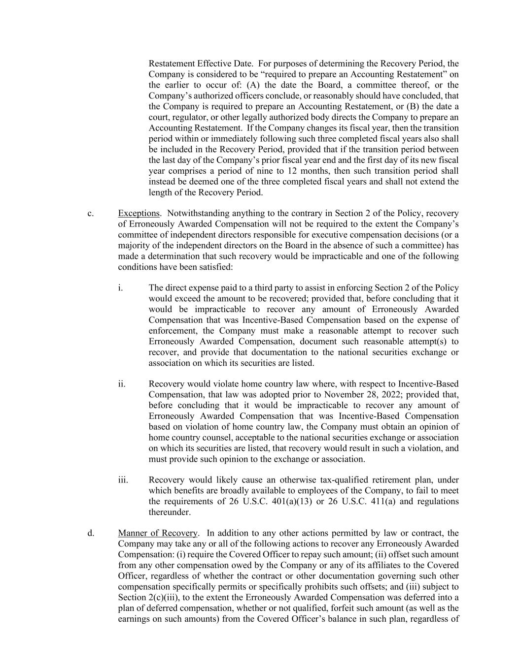 Restatement Effective Date. For purposes of determining the Recovery Period, the Company is considered to be “required to prepare an Accounting Restatement” on the earlier to occur of: (A) the date the Board, a committee thereof, or the Company’s authorized officers conclude, or reasonably should have concluded, that the Company is required to prepare an Accounting Restatement, or (B) the date a court, regulator, or other legally authorized body directs the Company to prepare an Accounting Restatement. If the Company changes its fiscal year, then the transition period within or immediately following such three completed fiscal years also shall be included in the Recovery Period, provided that if the transition period between the last day of the Company’s prior fiscal year end and the first day of its new fiscal year comprises a period of nine to 12 months, then such transition period shall instead be deemed one of the three completed fiscal years and shall not extend the length of the Recovery Period. c. Exceptions. Notwithstanding anything to the contrary in Section 2 of the Policy, recovery of Erroneously Awarded Compensation will not be required to the extent the Company’s committee of independent directors responsible for executive compensation decisions (or a majority of the independent directors on the Board in the absence of such a committee) has made a determination that such recovery would be impracticable and one of the following conditions have been satisfied: i. The direct expense paid to a third party to assist in enforcing Section 2 of the Policy would exceed the amount to be recovered; provided that, before concluding that it would be impracticable to recover any amount of Erroneously Awarded Compensation that was Incentive-Based Compensation based on the expense of enforcement, the Company must make a reasonable attempt to recover such Erroneously Awarded Compensation, document such reasonable attempt(s) to recover, and provide that documentation to the national securities exchange or association on which its securities are listed. ii. Recovery would violate home country law where, with respect to Incentive-Based Compensation, that law was adopted prior to November 28, 2022; provided that, before concluding that it would be impracticable to recover any amount of Erroneously Awarded Compensation that was Incentive-Based Compensation based on violation of home country law, the Company must obtain an opinion of home country counsel, acceptable to the national securities exchange or association on which its securities are listed, that recovery would result in such a violation, and must provide such opinion to the exchange or association. iii. Recovery would likely cause an otherwise tax-qualified retirement plan, under which benefits are broadly available to employees of the Company, to fail to meet the requirements of 26 U.S.C. 401(a)(13) or 26 U.S.C. 411(a) and regulations thereunder. d. Manner of Recovery. In addition to any other actions permitted by law or contract, the Company may take any or all of the following actions to recover any Erroneously Awarded Compensation: (i) require the Covered Officer to repay such amount; (ii) offset such amount from any other compensation owed by the Company or any of its affiliates to the Covered Officer, regardless of whether the contract or other documentation governing such other compensation specifically permits or specifically prohibits such offsets; and (iii) subject to Section 2(c)(iii), to the extent the Erroneously Awarded Compensation was deferred into a plan of deferred compensation, whether or not qualified, forfeit such amount (as well as the earnings on such amounts) from the Covered Officer’s balance in such plan, regardless of
