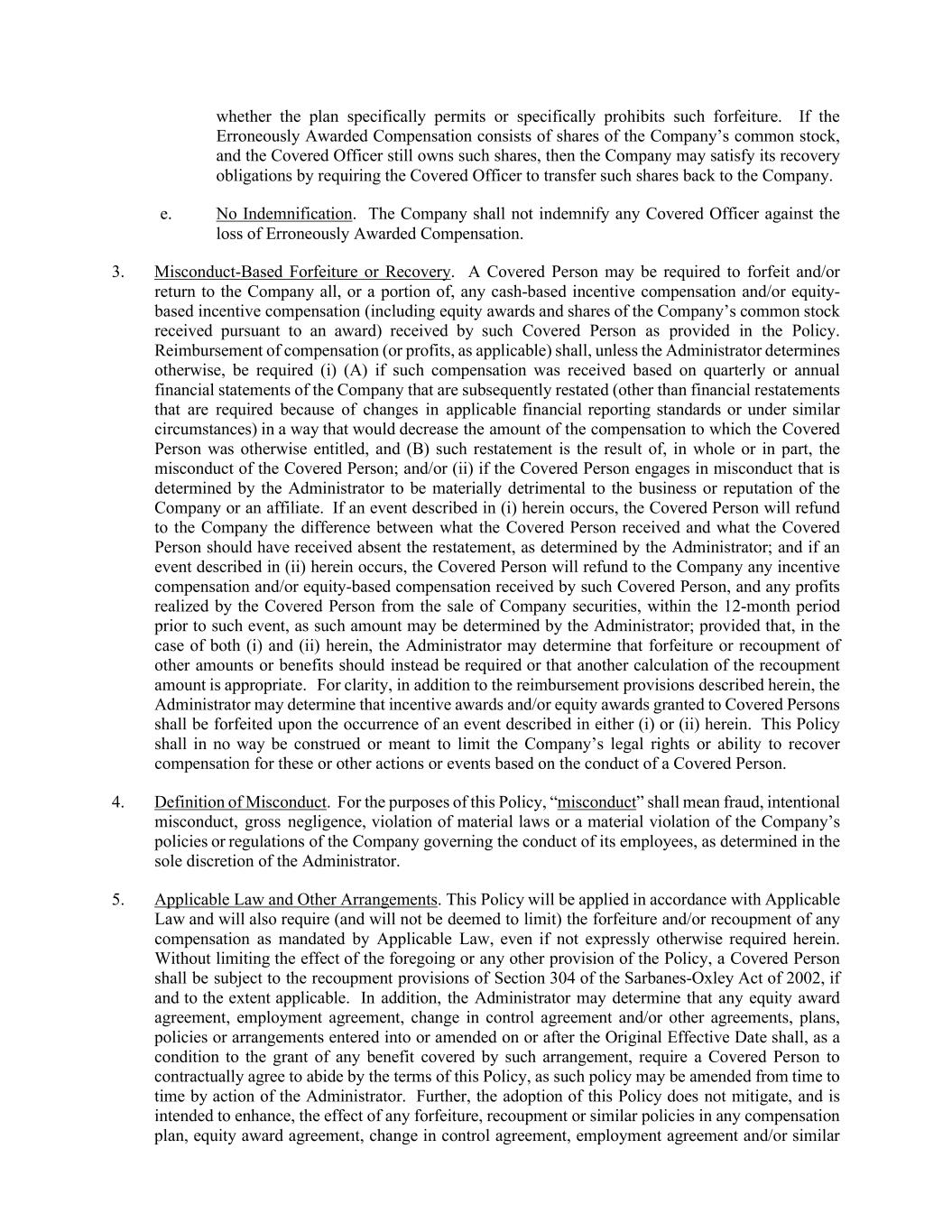 whether the plan specifically permits or specifically prohibits such forfeiture. If the Erroneously Awarded Compensation consists of shares of the Company’s common stock, and the Covered Officer still owns such shares, then the Company may satisfy its recovery obligations by requiring the Covered Officer to transfer such shares back to the Company. e. No Indemnification. The Company shall not indemnify any Covered Officer against the loss of Erroneously Awarded Compensation. 3. Misconduct-Based Forfeiture or Recovery. A Covered Person may be required to forfeit and/or return to the Company all, or a portion of, any cash-based incentive compensation and/or equity- based incentive compensation (including equity awards and shares of the Company’s common stock received pursuant to an award) received by such Covered Person as provided in the Policy. Reimbursement of compensation (or profits, as applicable) shall, unless the Administrator determines otherwise, be required (i) (A) if such compensation was received based on quarterly or annual financial statements of the Company that are subsequently restated (other than financial restatements that are required because of changes in applicable financial reporting standards or under similar circumstances) in a way that would decrease the amount of the compensation to which the Covered Person was otherwise entitled, and (B) such restatement is the result of, in whole or in part, the misconduct of the Covered Person; and/or (ii) if the Covered Person engages in misconduct that is determined by the Administrator to be materially detrimental to the business or reputation of the Company or an affiliate. If an event described in (i) herein occurs, the Covered Person will refund to the Company the difference between what the Covered Person received and what the Covered Person should have received absent the restatement, as determined by the Administrator; and if an event described in (ii) herein occurs, the Covered Person will refund to the Company any incentive compensation and/or equity-based compensation received by such Covered Person, and any profits realized by the Covered Person from the sale of Company securities, within the 12-month period prior to such event, as such amount may be determined by the Administrator; provided that, in the case of both (i) and (ii) herein, the Administrator may determine that forfeiture or recoupment of other amounts or benefits should instead be required or that another calculation of the recoupment amount is appropriate. For clarity, in addition to the reimbursement provisions described herein, the Administrator may determine that incentive awards and/or equity awards granted to Covered Persons shall be forfeited upon the occurrence of an event described in either (i) or (ii) herein. This Policy shall in no way be construed or meant to limit the Company’s legal rights or ability to recover compensation for these or other actions or events based on the conduct of a Covered Person. 4. Definition of Misconduct. For the purposes of this Policy, “misconduct” shall mean fraud, intentional misconduct, gross negligence, violation of material laws or a material violation of the Company’s policies or regulations of the Company governing the conduct of its employees, as determined in the sole discretion of the Administrator. 5. Applicable Law and Other Arrangements. This Policy will be applied in accordance with Applicable Law and will also require (and will not be deemed to limit) the forfeiture and/or recoupment of any compensation as mandated by Applicable Law, even if not expressly otherwise required herein. Without limiting the effect of the foregoing or any other provision of the Policy, a Covered Person shall be subject to the recoupment provisions of Section 304 of the Sarbanes-Oxley Act of 2002, if and to the extent applicable. In addition, the Administrator may determine that any equity award agreement, employment agreement, change in control agreement and/or other agreements, plans, policies or arrangements entered into or amended on or after the Original Effective Date shall, as a condition to the grant of any benefit covered by such arrangement, require a Covered Person to contractually agree to abide by the terms of this Policy, as such policy may be amended from time to time by action of the Administrator. Further, the adoption of this Policy does not mitigate, and is intended to enhance, the effect of any forfeiture, recoupment or similar policies in any compensation plan, equity award agreement, change in control agreement, employment agreement and/or similar