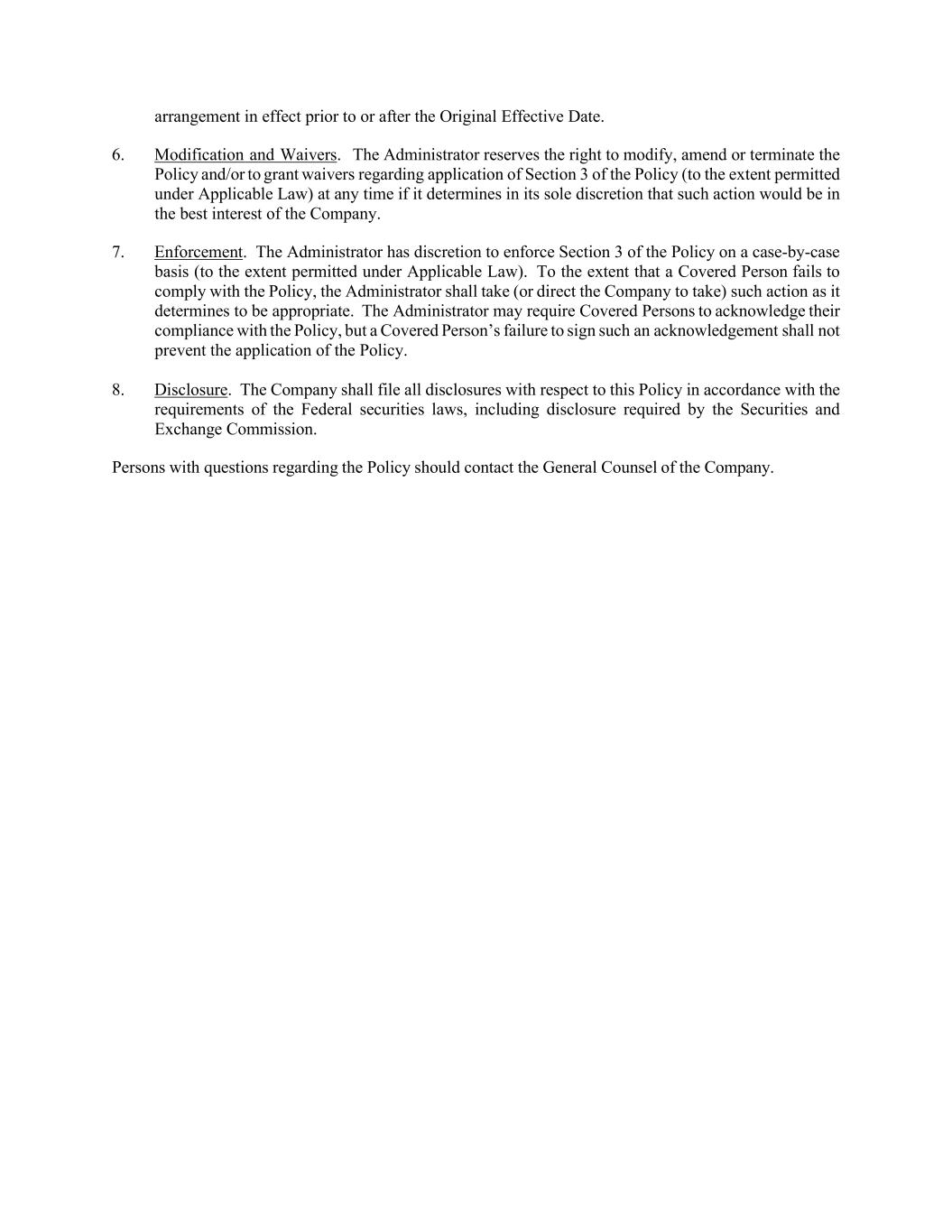 arrangement in effect prior to or after the Original Effective Date. 6. Modification and Waivers. The Administrator reserves the right to modify, amend or terminate the Policy and/or to grant waivers regarding application of Section 3 of the Policy (to the extent permitted under Applicable Law) at any time if it determines in its sole discretion that such action would be in the best interest of the Company. 7. Enforcement. The Administrator has discretion to enforce Section 3 of the Policy on a case-by-case basis (to the extent permitted under Applicable Law). To the extent that a Covered Person fails to comply with the Policy, the Administrator shall take (or direct the Company to take) such action as it determines to be appropriate. The Administrator may require Covered Persons to acknowledge their compliance with the Policy, but a Covered Person’s failure to sign such an acknowledgement shall not prevent the application of the Policy. 8. Disclosure. The Company shall file all disclosures with respect to this Policy in accordance with the requirements of the Federal securities laws, including disclosure required by the Securities and Exchange Commission. Persons with questions regarding the Policy should contact the General Counsel of the Company.