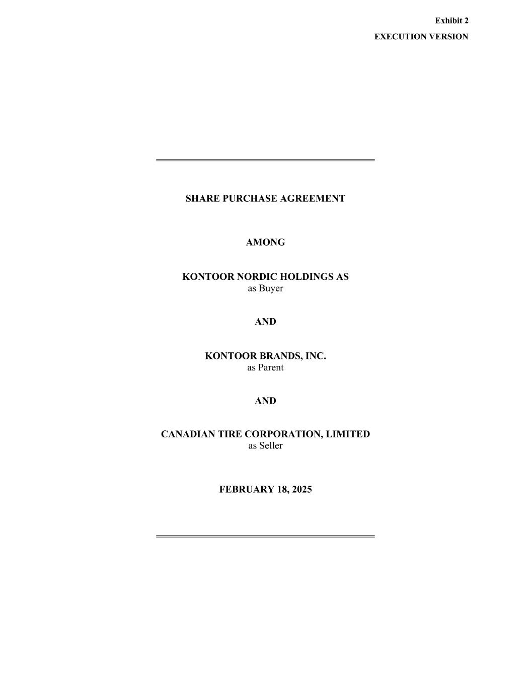 EXECUTION VERSION SHARE PURCHASE AGREEMENT AMONG KONTOOR NORDIC HOLDINGS AS as Buyer AND KONTOOR BRANDS, INC. as Parent AND CANADIAN TIRE CORPORATION, LIMITED as Seller FEBRUARY 18, 2025 Exhibit 2
