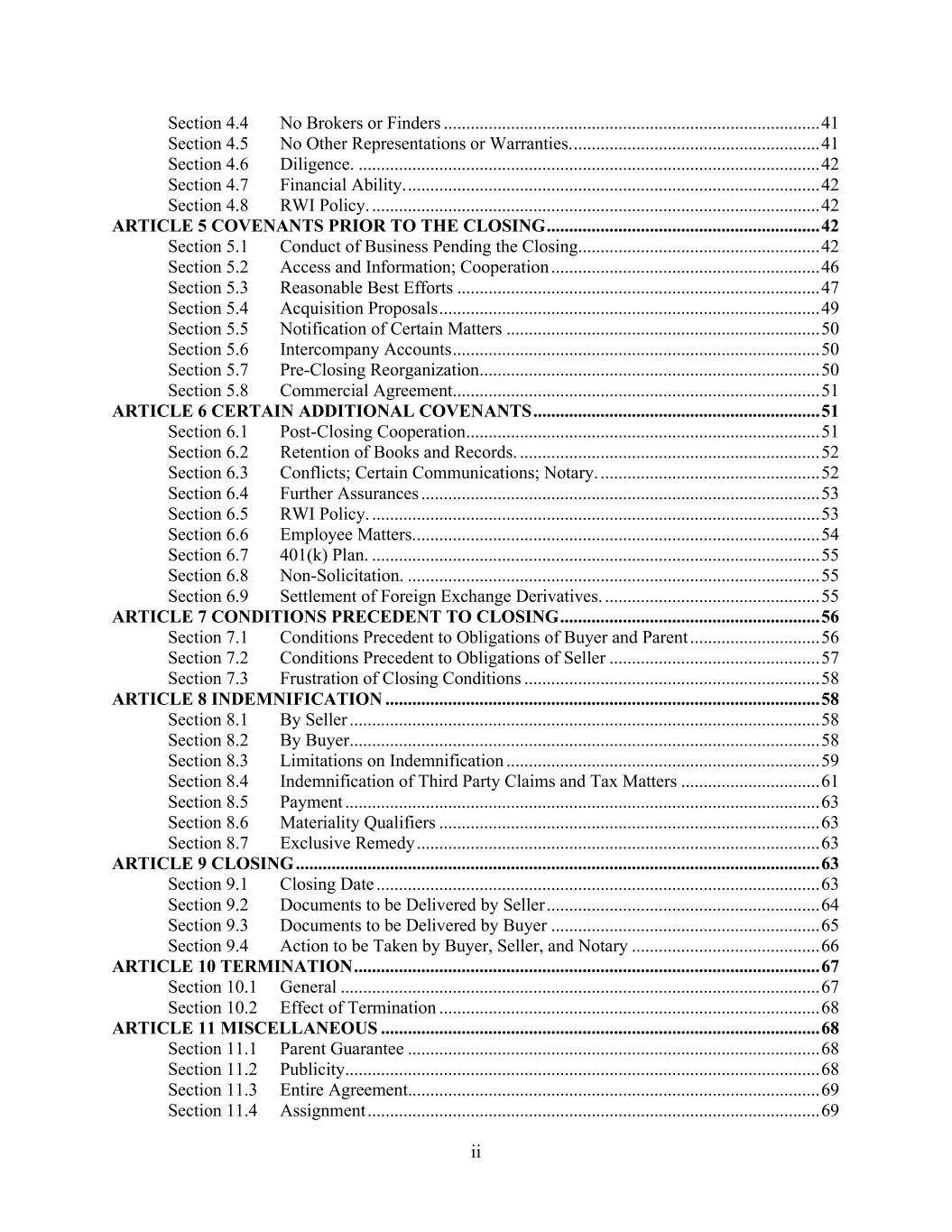 ii Section 4.4 No Brokers or Finders .................................................................................... 41 Section 4.5 No Other Representations or Warranties. ....................................................... 41 Section 4.6 Diligence. ....................................................................................................... 42 Section 4.7 Financial Ability. ............................................................................................ 42 Section 4.8 RWI Policy. .................................................................................................... 42 ARTICLE 5 COVENANTS PRIOR TO THE CLOSING ............................................................. 42 Section 5.1 Conduct of Business Pending the Closing ...................................................... 42 Section 5.2 Access and Information; Cooperation ............................................................ 46 Section 5.3 Reasonable Best Efforts ................................................................................. 47 Section 5.4 Acquisition Proposals ..................................................................................... 49 Section 5.5 Notification of Certain Matters ...................................................................... 50 Section 5.6 Intercompany Accounts .................................................................................. 50 Section 5.7 Pre-Closing Reorganization ............................................................................ 50 Section 5.8 Commercial Agreement .................................................................................. 51 ARTICLE 6 CERTAIN ADDITIONAL COVENANTS ................................................................ 51 Section 6.1 Post-Closing Cooperation ............................................................................... 51 Section 6.2 Retention of Books and Records. ................................................................... 52 Section 6.3 Conflicts; Certain Communications; Notary. ................................................. 52 Section 6.4 Further Assurances ......................................................................................... 53 Section 6.5 RWI Policy. .................................................................................................... 53 Section 6.6 Employee Matters. .......................................................................................... 54 Section 6.7 401(k) Plan. .................................................................................................... 55 Section 6.8 Non-Solicitation. ............................................................................................ 55 Section 6.9 Settlement of Foreign Exchange Derivatives. ................................................ 55 ARTICLE 7 CONDITIONS PRECEDENT TO CLOSING .......................................................... 56 Section 7.1 Conditions Precedent to Obligations of Buyer and Parent ............................. 56 Section 7.2 Conditions Precedent to Obligations of Seller ............................................... 57 Section 7.3 Frustration of Closing Conditions .................................................................. 58 ARTICLE 8 INDEMNIFICATION ................................................................................................. 58 Section 8.1 By Seller ......................................................................................................... 58 Section 8.2 By Buyer ......................................................................................................... 58 Section 8.3 Limitations on Indemnification ...................................................................... 59 Section 8.4 Indemnification of Third Party Claims and Tax Matters ............................... 61 Section 8.5 Payment .......................................................................................................... 63 Section 8.6 Materiality Qualifiers ..................................................................................... 63 Section 8.7 Exclusive Remedy .......................................................................................... 63 ARTICLE 9 CLOSING ..................................................................................................................... 63 Section 9.1 Closing Date ................................................................................................... 63 Section 9.2 Documents to be Delivered by Seller ............................................................. 64 Section 9.3 Documents to be Delivered by Buyer ............................................................ 65 Section 9.4 Action to be Taken by Buyer, Seller, and Notary .......................................... 66 ARTICLE 10 TERMINATION ........................................................................................................ 67 Section 10.1 General ........................................................................................................... 67 Section 10.2 Effect of Termination ..................................................................................... 68 ARTICLE 11 MISCELLANEOUS .................................................................................................. 68 Section 11.1 Parent Guarantee ............................................................................................ 68 Section 11.2 Publicity .......................................................................................................... 68 Section 11.3 Entire Agreement............................................................................................ 69 Section 11.4 Assignment ..................................................................................................... 69