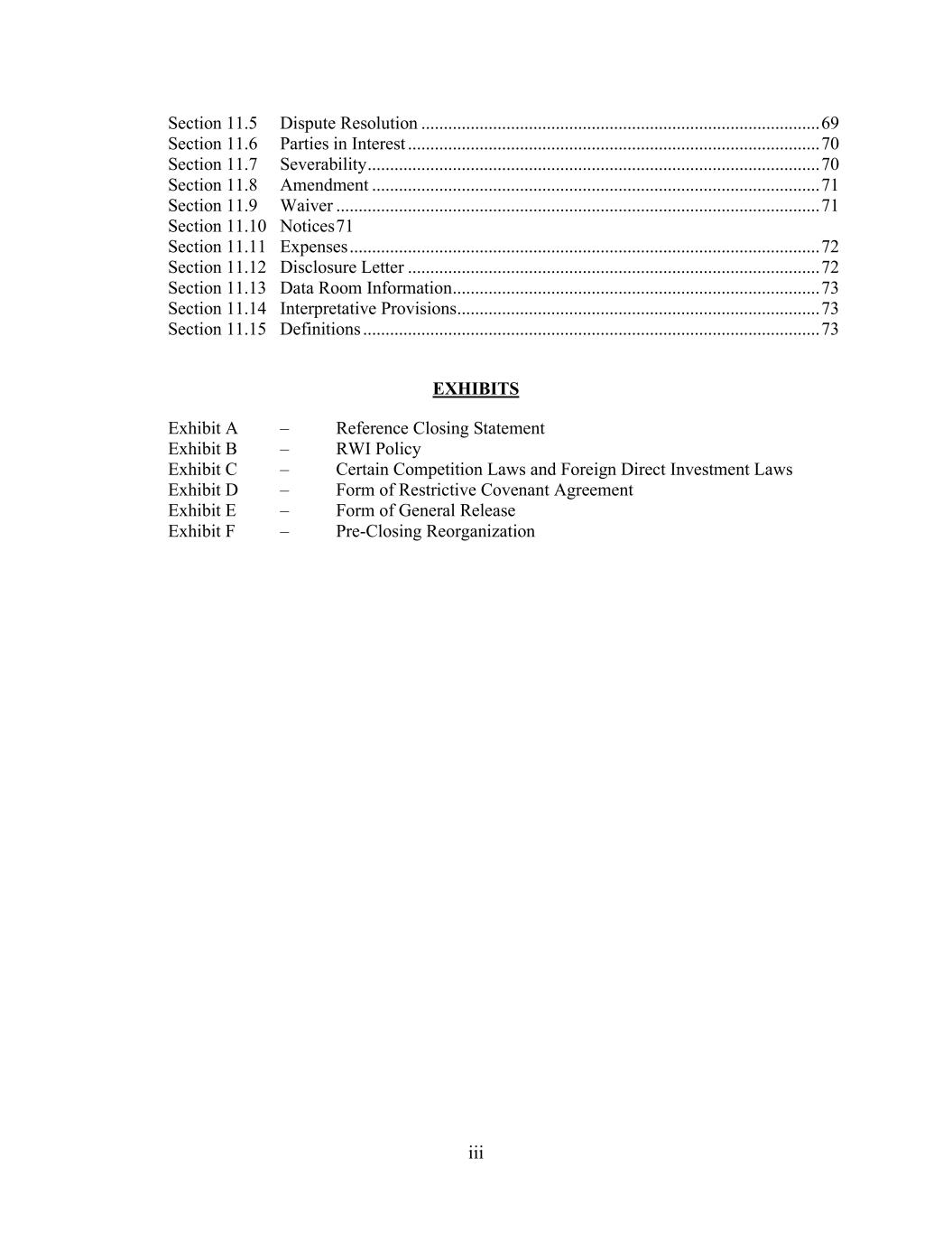 iii Section 11.5 Dispute Resolution ......................................................................................... 69 Section 11.6 Parties in Interest ............................................................................................ 70 Section 11.7 Severability ..................................................................................................... 70 Section 11.8 Amendment .................................................................................................... 71 Section 11.9 Waiver ............................................................................................................ 71 Section 11.10 Notices 71 Section 11.11 Expenses ......................................................................................................... 72 Section 11.12 Disclosure Letter ............................................................................................ 72 Section 11.13 Data Room Information .................................................................................. 73 Section 11.14 Interpretative Provisions ................................................................................. 73 Section 11.15 Definitions ...................................................................................................... 73 EXHIBITS Exhibit A – Reference Closing Statement Exhibit B – RWI Policy Exhibit C – Certain Competition Laws and Foreign Direct Investment Laws Exhibit D – Form of Restrictive Covenant Agreement Exhibit E – Form of General Release Exhibit F – Pre-Closing Reorganization
