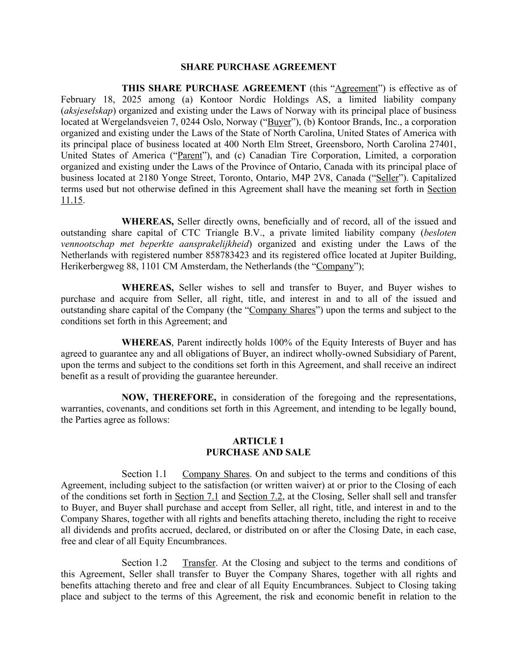 SHARE PURCHASE AGREEMENT THIS SHARE PURCHASE AGREEMENT (this “Agreement”) is effective as of February 18, 2025 among (a) Kontoor Nordic Holdings AS, a limited liability company (aksjeselskap) organized and existing under the Laws of Norway with its principal place of business located at Wergelandsveien 7, 0244 Oslo, Norway (“Buyer”), (b) Kontoor Brands, Inc., a corporation organized and existing under the Laws of the State of North Carolina, United States of America with its principal place of business located at 400 North Elm Street, Greensboro, North Carolina 27401, United States of America (“Parent”), and (c) Canadian Tire Corporation, Limited, a corporation organized and existing under the Laws of the Province of Ontario, Canada with its principal place of business located at 2180 Yonge Street, Toronto, Ontario, M4P 2V8, Canada (“Seller”). Capitalized terms used but not otherwise defined in this Agreement shall have the meaning set forth in Section 11.15. WHEREAS, Seller directly owns, beneficially and of record, all of the issued and outstanding share capital of CTC Triangle B.V., a private limited liability company (besloten vennootschap met beperkte aansprakelijkheid) organized and existing under the Laws of the Netherlands with registered number 858783423 and its registered office located at Jupiter Building, Herikerbergweg 88, 1101 CM Amsterdam, the Netherlands (the “Company”); WHEREAS, Seller wishes to sell and transfer to Buyer, and Buyer wishes to purchase and acquire from Seller, all right, title, and interest in and to all of the issued and outstanding share capital of the Company (the “Company Shares”) upon the terms and subject to the conditions set forth in this Agreement; and WHEREAS, Parent indirectly holds 100% of the Equity Interests of Buyer and has agreed to guarantee any and all obligations of Buyer, an indirect wholly-owned Subsidiary of Parent, upon the terms and subject to the conditions set forth in this Agreement, and shall receive an indirect benefit as a result of providing the guarantee hereunder. NOW, THEREFORE, in consideration of the foregoing and the representations, warranties, covenants, and conditions set forth in this Agreement, and intending to be legally bound, the Parties agree as follows: ARTICLE 1 PURCHASE AND SALE Section 1.1 Company Shares. On and subject to the terms and conditions of this Agreement, including subject to the satisfaction (or written waiver) at or prior to the Closing of each of the conditions set forth in Section 7.1 and Section 7.2, at the Closing, Seller shall sell and transfer to Buyer, and Buyer shall purchase and accept from Seller, all right, title, and interest in and to the Company Shares, together with all rights and benefits attaching thereto, including the right to receive all dividends and profits accrued, declared, or distributed on or after the Closing Date, in each case, free and clear of all Equity Encumbrances. Section 1.2 Transfer. At the Closing and subject to the terms and conditions of this Agreement, Seller shall transfer to Buyer the Company Shares, together with all rights and benefits attaching thereto and free and clear of all Equity Encumbrances. Subject to Closing taking place and subject to the terms of this Agreement, the risk and economic benefit in relation to the