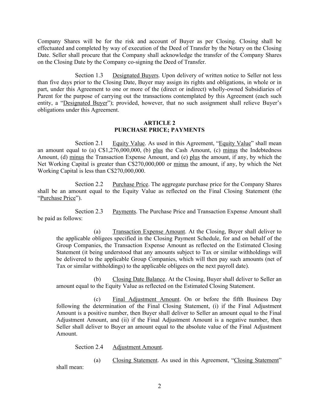 2 Company Shares will be for the risk and account of Buyer as per Closing. Closing shall be effectuated and completed by way of execution of the Deed of Transfer by the Notary on the Closing Date. Seller shall procure that the Company shall acknowledge the transfer of the Company Shares on the Closing Date by the Company co-signing the Deed of Transfer. Section 1.3 Designated Buyers. Upon delivery of written notice to Seller not less than five days prior to the Closing Date, Buyer may assign its rights and obligations, in whole or in part, under this Agreement to one or more of the (direct or indirect) wholly-owned Subsidiaries of Parent for the purpose of carrying out the transactions contemplated by this Agreement (each such entity, a “Designated Buyer”); provided, however, that no such assignment shall relieve Buyer’s obligations under this Agreement. ARTICLE 2 PURCHASE PRICE; PAYMENTS Section 2.1 Equity Value. As used in this Agreement, “Equity Value” shall mean an amount equal to (a) C$1,276,000,000, (b) plus the Cash Amount, (c) minus the Indebtedness Amount, (d) minus the Transaction Expense Amount, and (e) plus the amount, if any, by which the Net Working Capital is greater than C$270,000,000 or minus the amount, if any, by which the Net Working Capital is less than C$270,000,000. Section 2.2 Purchase Price. The aggregate purchase price for the Company Shares shall be an amount equal to the Equity Value as reflected on the Final Closing Statement (the “Purchase Price”). Section 2.3 Payments. The Purchase Price and Transaction Expense Amount shall be paid as follows: (a) Transaction Expense Amount. At the Closing, Buyer shall deliver to the applicable obligees specified in the Closing Payment Schedule, for and on behalf of the Group Companies, the Transaction Expense Amount as reflected on the Estimated Closing Statement (it being understood that any amounts subject to Tax or similar withholdings will be delivered to the applicable Group Companies, which will then pay such amounts (net of Tax or similar withholdings) to the applicable obligees on the next payroll date). (b) Closing Date Balance. At the Closing, Buyer shall deliver to Seller an amount equal to the Equity Value as reflected on the Estimated Closing Statement. (c) Final Adjustment Amount. On or before the fifth Business Day following the determination of the Final Closing Statement, (i) if the Final Adjustment Amount is a positive number, then Buyer shall deliver to Seller an amount equal to the Final Adjustment Amount, and (ii) if the Final Adjustment Amount is a negative number, then Seller shall deliver to Buyer an amount equal to the absolute value of the Final Adjustment Amount. Section 2.4 Adjustment Amount. (a) Closing Statement. As used in this Agreement, “Closing Statement” shall mean:
