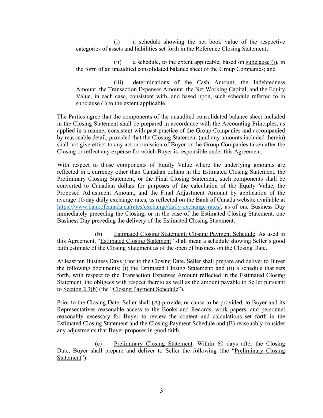 3 (i) a schedule showing the net book value of the respective categories of assets and liabilities set forth in the Reference Closing Statement; (ii) a schedule, to the extent applicable, based on subclause (i), in the form of an unaudited consolidated balance sheet of the Group Companies; and (iii) determinations of the Cash Amount, the Indebtedness Amount, the Transaction Expenses Amount, the Net Working Capital, and the Equity Value, in each case, consistent with, and based upon, such schedule referred to in subclause (i) to the extent applicable. The Parties agree that the components of the unaudited consolidated balance sheet included in the Closing Statement shall be prepared in accordance with the Accounting Principles, as applied in a manner consistent with past practice of the Group Companies and accompanied by reasonable detail, provided that the Closing Statement (and any amounts included therein) shall not give effect to any act or omission of Buyer or the Group Companies taken after the Closing or reflect any expense for which Buyer is responsible under this Agreement. With respect to those components of Equity Value where the underlying amounts are reflected in a currency other than Canadian dollars in the Estimated Closing Statement, the Preliminary Closing Statement, or the Final Closing Statement, such components shall be converted to Canadian dollars for purposes of the calculation of the Equity Value, the Proposed Adjustment Amount, and the Final Adjustment Amount by application of the average 10-day daily exchange rates, as reflected on the Bank of Canada website available at https://www.bankofcanada.ca/rates/exchange/daily-exchange-rates/, as of one Business Day immediately preceding the Closing, or in the case of the Estimated Closing Statement, one Business Day preceding the delivery of the Estimated Closing Statement. (b) Estimated Closing Statement; Closing Payment Schedule. As used in this Agreement, “Estimated Closing Statement” shall mean a schedule showing Seller’s good faith estimate of the Closing Statement as of the open of business on the Closing Date. At least ten Business Days prior to the Closing Date, Seller shall prepare and deliver to Buyer the following documents: (i) the Estimated Closing Statement; and (ii) a schedule that sets forth, with respect to the Transaction Expenses Amount reflected in the Estimated Closing Statement, the obligees with respect thereto as well as the amount payable to Seller pursuant to Section 2.3(b) (the “Closing Payment Schedule”). Prior to the Closing Date, Seller shall (A) provide, or cause to be provided, to Buyer and its Representatives reasonable access to the Books and Records, work papers, and personnel reasonably necessary for Buyer to review the content and calculations set forth in the Estimated Closing Statement and the Closing Payment Schedule and (B) reasonably consider any adjustments that Buyer proposes in good faith. (c) Preliminary Closing Statement. Within 60 days after the Closing Date, Buyer shall prepare and deliver to Seller the following (the “Preliminary Closing Statement”):