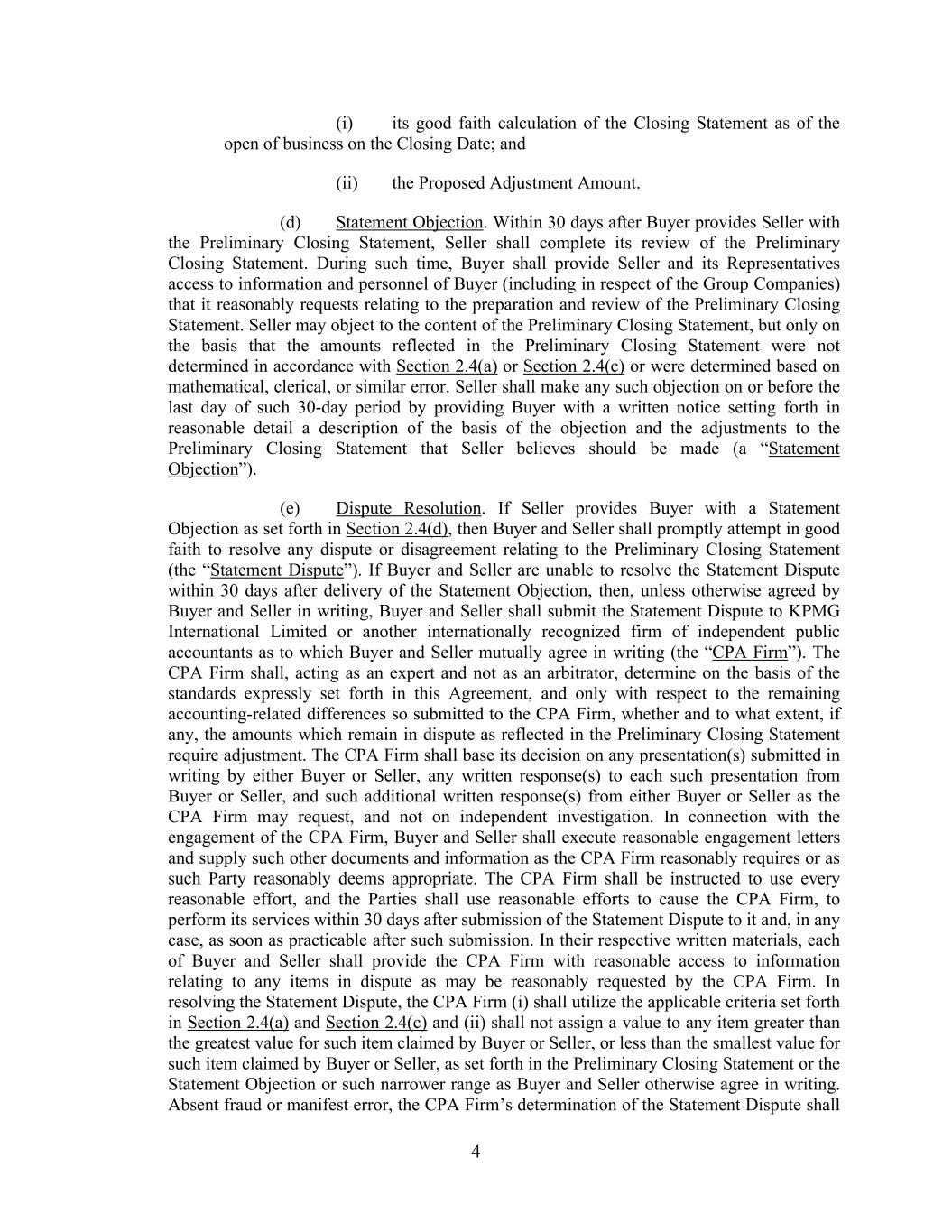 4 (i) its good faith calculation of the Closing Statement as of the open of business on the Closing Date; and (ii) the Proposed Adjustment Amount. (d) Statement Objection. Within 30 days after Buyer provides Seller with the Preliminary Closing Statement, Seller shall complete its review of the Preliminary Closing Statement. During such time, Buyer shall provide Seller and its Representatives access to information and personnel of Buyer (including in respect of the Group Companies) that it reasonably requests relating to the preparation and review of the Preliminary Closing Statement. Seller may object to the content of the Preliminary Closing Statement, but only on the basis that the amounts reflected in the Preliminary Closing Statement were not determined in accordance with Section 2.4(a) or Section 2.4(c) or were determined based on mathematical, clerical, or similar error. Seller shall make any such objection on or before the last day of such 30-day period by providing Buyer with a written notice setting forth in reasonable detail a description of the basis of the objection and the adjustments to the Preliminary Closing Statement that Seller believes should be made (a “Statement Objection”). (e) Dispute Resolution. If Seller provides Buyer with a Statement Objection as set forth in Section 2.4(d), then Buyer and Seller shall promptly attempt in good faith to resolve any dispute or disagreement relating to the Preliminary Closing Statement (the “Statement Dispute”). If Buyer and Seller are unable to resolve the Statement Dispute within 30 days after delivery of the Statement Objection, then, unless otherwise agreed by Buyer and Seller in writing, Buyer and Seller shall submit the Statement Dispute to KPMG International Limited or another internationally recognized firm of independent public accountants as to which Buyer and Seller mutually agree in writing (the “CPA Firm”). The CPA Firm shall, acting as an expert and not as an arbitrator, determine on the basis of the standards expressly set forth in this Agreement, and only with respect to the remaining accounting-related differences so submitted to the CPA Firm, whether and to what extent, if any, the amounts which remain in dispute as reflected in the Preliminary Closing Statement require adjustment. The CPA Firm shall base its decision on any presentation(s) submitted in writing by either Buyer or Seller, any written response(s) to each such presentation from Buyer or Seller, and such additional written response(s) from either Buyer or Seller as the CPA Firm may request, and not on independent investigation. In connection with the engagement of the CPA Firm, Buyer and Seller shall execute reasonable engagement letters and supply such other documents and information as the CPA Firm reasonably requires or as such Party reasonably deems appropriate. The CPA Firm shall be instructed to use every reasonable effort, and the Parties shall use reasonable efforts to cause the CPA Firm, to perform its services within 30 days after submission of the Statement Dispute to it and, in any case, as soon as practicable after such submission. In their respective written materials, each of Buyer and Seller shall provide the CPA Firm with reasonable access to information relating to any items in dispute as may be reasonably requested by the CPA Firm. In resolving the Statement Dispute, the CPA Firm (i) shall utilize the applicable criteria set forth in Section 2.4(a) and Section 2.4(c) and (ii) shall not assign a value to any item greater than the greatest value for such item claimed by Buyer or Seller, or less than the smallest value for such item claimed by Buyer or Seller, as set forth in the Preliminary Closing Statement or the Statement Objection or such narrower range as Buyer and Seller otherwise agree in writing. Absent fraud or manifest error, the CPA Firm’s determination of the Statement Dispute shall
