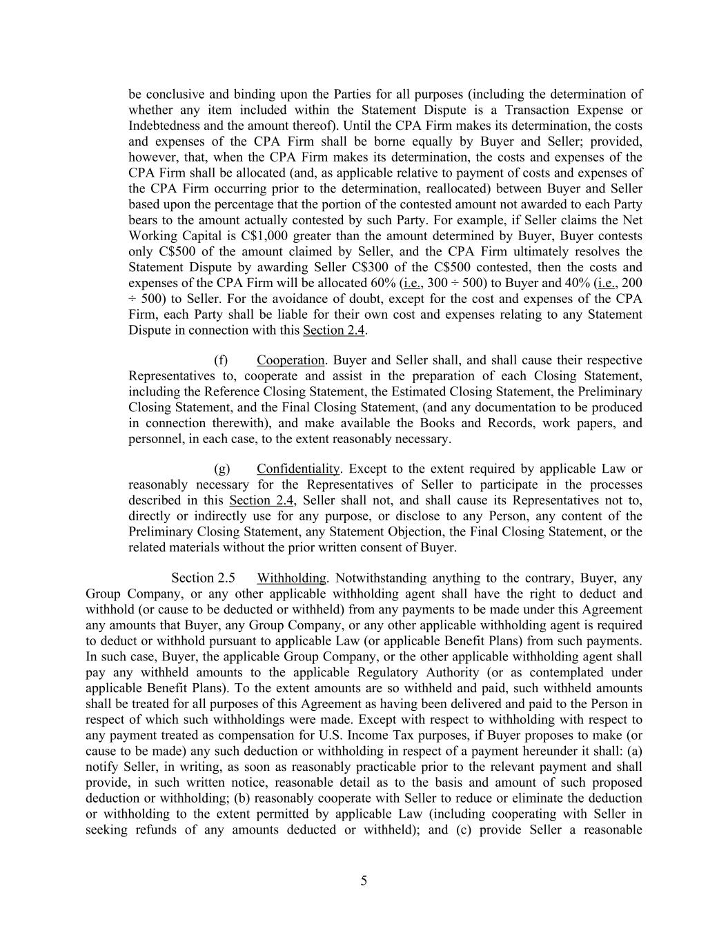 5 be conclusive and binding upon the Parties for all purposes (including the determination of whether any item included within the Statement Dispute is a Transaction Expense or Indebtedness and the amount thereof). Until the CPA Firm makes its determination, the costs and expenses of the CPA Firm shall be borne equally by Buyer and Seller; provided, however, that, when the CPA Firm makes its determination, the costs and expenses of the CPA Firm shall be allocated (and, as applicable relative to payment of costs and expenses of the CPA Firm occurring prior to the determination, reallocated) between Buyer and Seller based upon the percentage that the portion of the contested amount not awarded to each Party bears to the amount actually contested by such Party. For example, if Seller claims the Net Working Capital is C$1,000 greater than the amount determined by Buyer, Buyer contests only C$500 of the amount claimed by Seller, and the CPA Firm ultimately resolves the Statement Dispute by awarding Seller C$300 of the C$500 contested, then the costs and expenses of the CPA Firm will be allocated 60% (i.e., 300 ÷ 500) to Buyer and 40% (i.e., 200 ÷ 500) to Seller. For the avoidance of doubt, except for the cost and expenses of the CPA Firm, each Party shall be liable for their own cost and expenses relating to any Statement Dispute in connection with this Section 2.4. (f) Cooperation. Buyer and Seller shall, and shall cause their respective Representatives to, cooperate and assist in the preparation of each Closing Statement, including the Reference Closing Statement, the Estimated Closing Statement, the Preliminary Closing Statement, and the Final Closing Statement, (and any documentation to be produced in connection therewith), and make available the Books and Records, work papers, and personnel, in each case, to the extent reasonably necessary. (g) Confidentiality. Except to the extent required by applicable Law or reasonably necessary for the Representatives of Seller to participate in the processes described in this Section 2.4, Seller shall not, and shall cause its Representatives not to, directly or indirectly use for any purpose, or disclose to any Person, any content of the Preliminary Closing Statement, any Statement Objection, the Final Closing Statement, or the related materials without the prior written consent of Buyer. Section 2.5 Withholding. Notwithstanding anything to the contrary, Buyer, any Group Company, or any other applicable withholding agent shall have the right to deduct and withhold (or cause to be deducted or withheld) from any payments to be made under this Agreement any amounts that Buyer, any Group Company, or any other applicable withholding agent is required to deduct or withhold pursuant to applicable Law (or applicable Benefit Plans) from such payments. In such case, Buyer, the applicable Group Company, or the other applicable withholding agent shall pay any withheld amounts to the applicable Regulatory Authority (or as contemplated under applicable Benefit Plans). To the extent amounts are so withheld and paid, such withheld amounts shall be treated for all purposes of this Agreement as having been delivered and paid to the Person in respect of which such withholdings were made. Except with respect to withholding with respect to any payment treated as compensation for U.S. Income Tax purposes, if Buyer proposes to make (or cause to be made) any such deduction or withholding in respect of a payment hereunder it shall: (a) notify Seller, in writing, as soon as reasonably practicable prior to the relevant payment and shall provide, in such written notice, reasonable detail as to the basis and amount of such proposed deduction or withholding; (b) reasonably cooperate with Seller to reduce or eliminate the deduction or withholding to the extent permitted by applicable Law (including cooperating with Seller in seeking refunds of any amounts deducted or withheld); and (c) provide Seller a reasonable