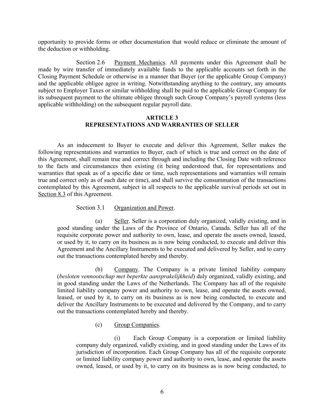 6 opportunity to provide forms or other documentation that would reduce or eliminate the amount of the deduction or withholding. Section 2.6 Payment Mechanics. All payments under this Agreement shall be made by wire transfer of immediately available funds to the applicable accounts set forth in the Closing Payment Schedule or otherwise in a manner that Buyer (or the applicable Group Company) and the applicable obligee agree in writing. Notwithstanding anything to the contrary, any amounts subject to Employer Taxes or similar withholding shall be paid to the applicable Group Company for its subsequent payment to the ultimate obligee through such Group Company’s payroll systems (less applicable withholding) on the subsequent regular payroll date. ARTICLE 3 REPRESENTATIONS AND WARRANTIES OF SELLER As an inducement to Buyer to execute and deliver this Agreement, Seller makes the following representations and warranties to Buyer, each of which is true and correct on the date of this Agreement, shall remain true and correct through and including the Closing Date with reference to the facts and circumstances then existing (it being understood that, for representations and warranties that speak as of a specific date or time, such representations and warranties will remain true and correct only as of such date or time), and shall survive the consummation of the transactions contemplated by this Agreement, subject in all respects to the applicable survival periods set out in Section 8.3 of this Agreement. Section 3.1 Organization and Power. (a) Seller. Seller is a corporation duly organized, validly existing, and in good standing under the Laws of the Province of Ontario, Canada. Seller has all of the requisite corporate power and authority to own, lease, and operate the assets owned, leased, or used by it, to carry on its business as is now being conducted, to execute and deliver this Agreement and the Ancillary Instruments to be executed and delivered by Seller, and to carry out the transactions contemplated hereby and thereby. (b) Company. The Company is a private limited liability company (besloten vennootschap met beperkte aansprakelijkheid) duly organized, validly existing, and in good standing under the Laws of the Netherlands. The Company has all of the requisite limited liability company power and authority to own, lease, and operate the assets owned, leased, or used by it, to carry on its business as is now being conducted, to execute and deliver the Ancillary Instruments to be executed and delivered by the Company, and to carry out the transactions contemplated hereby and thereby. (c) Group Companies. (i) Each Group Company is a corporation or limited liability company duly organized, validly existing, and in good standing under the Laws of its jurisdiction of incorporation. Each Group Company has all of the requisite corporate or limited liability company power and authority to own, lease, and operate the assets owned, leased, or used by it, to carry on its business as is now being conducted, to
