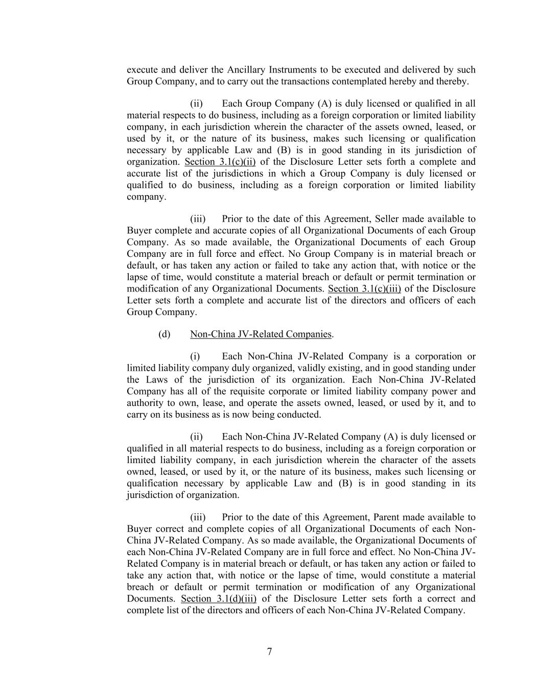 7 execute and deliver the Ancillary Instruments to be executed and delivered by such Group Company, and to carry out the transactions contemplated hereby and thereby. (ii) Each Group Company (A) is duly licensed or qualified in all material respects to do business, including as a foreign corporation or limited liability company, in each jurisdiction wherein the character of the assets owned, leased, or used by it, or the nature of its business, makes such licensing or qualification necessary by applicable Law and (B) is in good standing in its jurisdiction of organization. Section 3.1(c)(ii) of the Disclosure Letter sets forth a complete and accurate list of the jurisdictions in which a Group Company is duly licensed or qualified to do business, including as a foreign corporation or limited liability company. (iii) Prior to the date of this Agreement, Seller made available to Buyer complete and accurate copies of all Organizational Documents of each Group Company. As so made available, the Organizational Documents of each Group Company are in full force and effect. No Group Company is in material breach or default, or has taken any action or failed to take any action that, with notice or the lapse of time, would constitute a material breach or default or permit termination or modification of any Organizational Documents. Section 3.1(c)(iii) of the Disclosure Letter sets forth a complete and accurate list of the directors and officers of each Group Company. (d) Non-China JV-Related Companies. (i) Each Non-China JV-Related Company is a corporation or limited liability company duly organized, validly existing, and in good standing under the Laws of the jurisdiction of its organization. Each Non-China JV-Related Company has all of the requisite corporate or limited liability company power and authority to own, lease, and operate the assets owned, leased, or used by it, and to carry on its business as is now being conducted. (ii) Each Non-China JV-Related Company (A) is duly licensed or qualified in all material respects to do business, including as a foreign corporation or limited liability company, in each jurisdiction wherein the character of the assets owned, leased, or used by it, or the nature of its business, makes such licensing or qualification necessary by applicable Law and (B) is in good standing in its jurisdiction of organization. (iii) Prior to the date of this Agreement, Parent made available to Buyer correct and complete copies of all Organizational Documents of each Non- China JV-Related Company. As so made available, the Organizational Documents of each Non-China JV-Related Company are in full force and effect. No Non-China JV- Related Company is in material breach or default, or has taken any action or failed to take any action that, with notice or the lapse of time, would constitute a material breach or default or permit termination or modification of any Organizational Documents. Section 3.1(d)(iii) of the Disclosure Letter sets forth a correct and complete list of the directors and officers of each Non-China JV-Related Company.