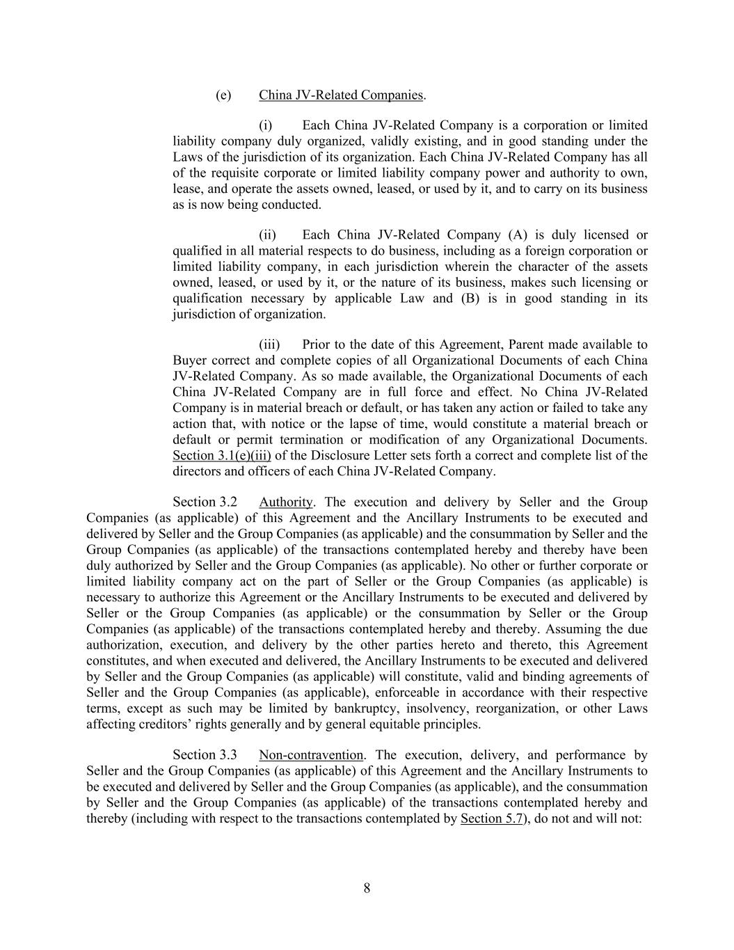 8 (e) China JV-Related Companies. (i) Each China JV-Related Company is a corporation or limited liability company duly organized, validly existing, and in good standing under the Laws of the jurisdiction of its organization. Each China JV-Related Company has all of the requisite corporate or limited liability company power and authority to own, lease, and operate the assets owned, leased, or used by it, and to carry on its business as is now being conducted. (ii) Each China JV-Related Company (A) is duly licensed or qualified in all material respects to do business, including as a foreign corporation or limited liability company, in each jurisdiction wherein the character of the assets owned, leased, or used by it, or the nature of its business, makes such licensing or qualification necessary by applicable Law and (B) is in good standing in its jurisdiction of organization. (iii) Prior to the date of this Agreement, Parent made available to Buyer correct and complete copies of all Organizational Documents of each China JV-Related Company. As so made available, the Organizational Documents of each China JV-Related Company are in full force and effect. No China JV-Related Company is in material breach or default, or has taken any action or failed to take any action that, with notice or the lapse of time, would constitute a material breach or default or permit termination or modification of any Organizational Documents. Section 3.1(e)(iii) of the Disclosure Letter sets forth a correct and complete list of the directors and officers of each China JV-Related Company. Section 3.2 Authority. The execution and delivery by Seller and the Group Companies (as applicable) of this Agreement and the Ancillary Instruments to be executed and delivered by Seller and the Group Companies (as applicable) and the consummation by Seller and the Group Companies (as applicable) of the transactions contemplated hereby and thereby have been duly authorized by Seller and the Group Companies (as applicable). No other or further corporate or limited liability company act on the part of Seller or the Group Companies (as applicable) is necessary to authorize this Agreement or the Ancillary Instruments to be executed and delivered by Seller or the Group Companies (as applicable) or the consummation by Seller or the Group Companies (as applicable) of the transactions contemplated hereby and thereby. Assuming the due authorization, execution, and delivery by the other parties hereto and thereto, this Agreement constitutes, and when executed and delivered, the Ancillary Instruments to be executed and delivered by Seller and the Group Companies (as applicable) will constitute, valid and binding agreements of Seller and the Group Companies (as applicable), enforceable in accordance with their respective terms, except as such may be limited by bankruptcy, insolvency, reorganization, or other Laws affecting creditors’ rights generally and by general equitable principles. Section 3.3 Non-contravention. The execution, delivery, and performance by Seller and the Group Companies (as applicable) of this Agreement and the Ancillary Instruments to be executed and delivered by Seller and the Group Companies (as applicable), and the consummation by Seller and the Group Companies (as applicable) of the transactions contemplated hereby and thereby (including with respect to the transactions contemplated by Section 5.7), do not and will not: