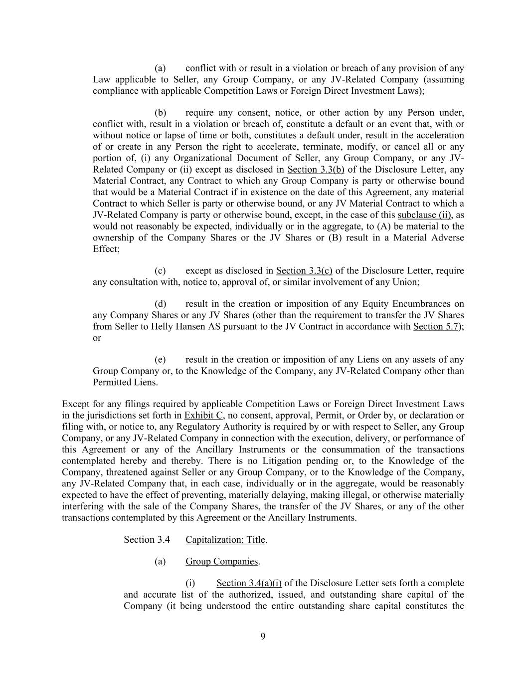 9 (a) conflict with or result in a violation or breach of any provision of any Law applicable to Seller, any Group Company, or any JV-Related Company (assuming compliance with applicable Competition Laws or Foreign Direct Investment Laws); (b) require any consent, notice, or other action by any Person under, conflict with, result in a violation or breach of, constitute a default or an event that, with or without notice or lapse of time or both, constitutes a default under, result in the acceleration of or create in any Person the right to accelerate, terminate, modify, or cancel all or any portion of, (i) any Organizational Document of Seller, any Group Company, or any JV- Related Company or (ii) except as disclosed in Section 3.3(b) of the Disclosure Letter, any Material Contract, any Contract to which any Group Company is party or otherwise bound that would be a Material Contract if in existence on the date of this Agreement, any material Contract to which Seller is party or otherwise bound, or any JV Material Contract to which a JV-Related Company is party or otherwise bound, except, in the case of this subclause (ii), as would not reasonably be expected, individually or in the aggregate, to (A) be material to the ownership of the Company Shares or the JV Shares or (B) result in a Material Adverse Effect; (c) except as disclosed in Section 3.3(c) of the Disclosure Letter, require any consultation with, notice to, approval of, or similar involvement of any Union; (d) result in the creation or imposition of any Equity Encumbrances on any Company Shares or any JV Shares (other than the requirement to transfer the JV Shares from Seller to Helly Hansen AS pursuant to the JV Contract in accordance with Section 5.7); or (e) result in the creation or imposition of any Liens on any assets of any Group Company or, to the Knowledge of the Company, any JV-Related Company other than Permitted Liens. Except for any filings required by applicable Competition Laws or Foreign Direct Investment Laws in the jurisdictions set forth in Exhibit C, no consent, approval, Permit, or Order by, or declaration or filing with, or notice to, any Regulatory Authority is required by or with respect to Seller, any Group Company, or any JV-Related Company in connection with the execution, delivery, or performance of this Agreement or any of the Ancillary Instruments or the consummation of the transactions contemplated hereby and thereby. There is no Litigation pending or, to the Knowledge of the Company, threatened against Seller or any Group Company, or to the Knowledge of the Company, any JV-Related Company that, in each case, individually or in the aggregate, would be reasonably expected to have the effect of preventing, materially delaying, making illegal, or otherwise materially interfering with the sale of the Company Shares, the transfer of the JV Shares, or any of the other transactions contemplated by this Agreement or the Ancillary Instruments. Section 3.4 Capitalization; Title. (a) Group Companies. (i) Section 3.4(a)(i) of the Disclosure Letter sets forth a complete and accurate list of the authorized, issued, and outstanding share capital of the Company (it being understood the entire outstanding share capital constitutes the