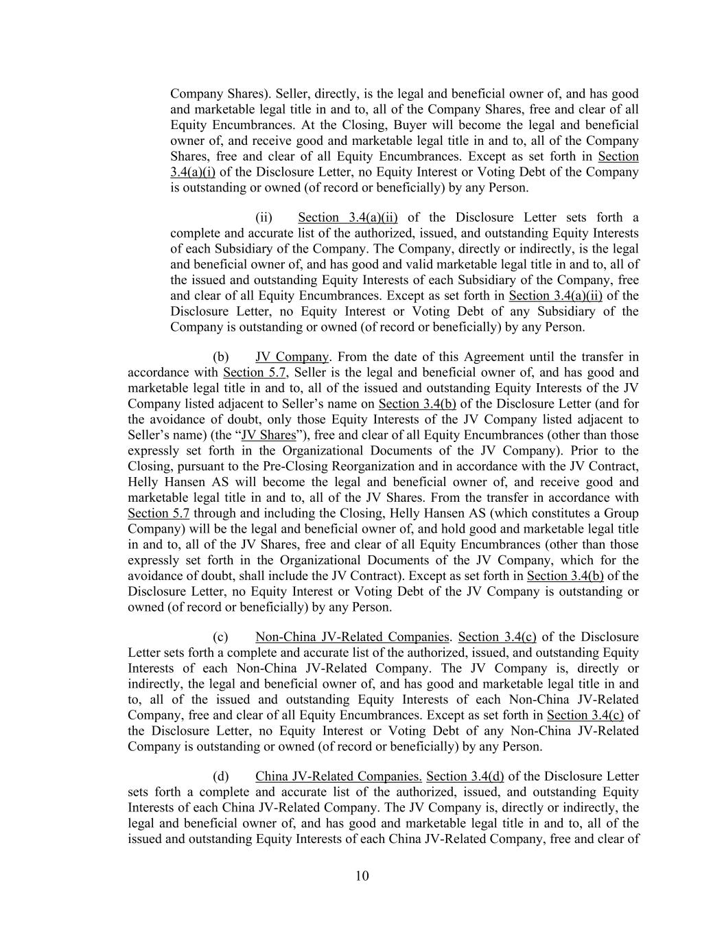 10 Company Shares). Seller, directly, is the legal and beneficial owner of, and has good and marketable legal title in and to, all of the Company Shares, free and clear of all Equity Encumbrances. At the Closing, Buyer will become the legal and beneficial owner of, and receive good and marketable legal title in and to, all of the Company Shares, free and clear of all Equity Encumbrances. Except as set forth in Section 3.4(a)(i) of the Disclosure Letter, no Equity Interest or Voting Debt of the Company is outstanding or owned (of record or beneficially) by any Person. (ii) Section 3.4(a)(ii) of the Disclosure Letter sets forth a complete and accurate list of the authorized, issued, and outstanding Equity Interests of each Subsidiary of the Company. The Company, directly or indirectly, is the legal and beneficial owner of, and has good and valid marketable legal title in and to, all of the issued and outstanding Equity Interests of each Subsidiary of the Company, free and clear of all Equity Encumbrances. Except as set forth in Section 3.4(a)(ii) of the Disclosure Letter, no Equity Interest or Voting Debt of any Subsidiary of the Company is outstanding or owned (of record or beneficially) by any Person. (b) JV Company. From the date of this Agreement until the transfer in accordance with Section 5.7, Seller is the legal and beneficial owner of, and has good and marketable legal title in and to, all of the issued and outstanding Equity Interests of the JV Company listed adjacent to Seller’s name on Section 3.4(b) of the Disclosure Letter (and for the avoidance of doubt, only those Equity Interests of the JV Company listed adjacent to Seller’s name) (the “JV Shares”), free and clear of all Equity Encumbrances (other than those expressly set forth in the Organizational Documents of the JV Company). Prior to the Closing, pursuant to the Pre-Closing Reorganization and in accordance with the JV Contract, Helly Hansen AS will become the legal and beneficial owner of, and receive good and marketable legal title in and to, all of the JV Shares. From the transfer in accordance with Section 5.7 through and including the Closing, Helly Hansen AS (which constitutes a Group Company) will be the legal and beneficial owner of, and hold good and marketable legal title in and to, all of the JV Shares, free and clear of all Equity Encumbrances (other than those expressly set forth in the Organizational Documents of the JV Company, which for the avoidance of doubt, shall include the JV Contract). Except as set forth in Section 3.4(b) of the Disclosure Letter, no Equity Interest or Voting Debt of the JV Company is outstanding or owned (of record or beneficially) by any Person. (c) Non-China JV-Related Companies. Section 3.4(c) of the Disclosure Letter sets forth a complete and accurate list of the authorized, issued, and outstanding Equity Interests of each Non-China JV-Related Company. The JV Company is, directly or indirectly, the legal and beneficial owner of, and has good and marketable legal title in and to, all of the issued and outstanding Equity Interests of each Non-China JV-Related Company, free and clear of all Equity Encumbrances. Except as set forth in Section 3.4(c) of the Disclosure Letter, no Equity Interest or Voting Debt of any Non-China JV-Related Company is outstanding or owned (of record or beneficially) by any Person. (d) China JV-Related Companies. Section 3.4(d) of the Disclosure Letter sets forth a complete and accurate list of the authorized, issued, and outstanding Equity Interests of each China JV-Related Company. The JV Company is, directly or indirectly, the legal and beneficial owner of, and has good and marketable legal title in and to, all of the issued and outstanding Equity Interests of each China JV-Related Company, free and clear of