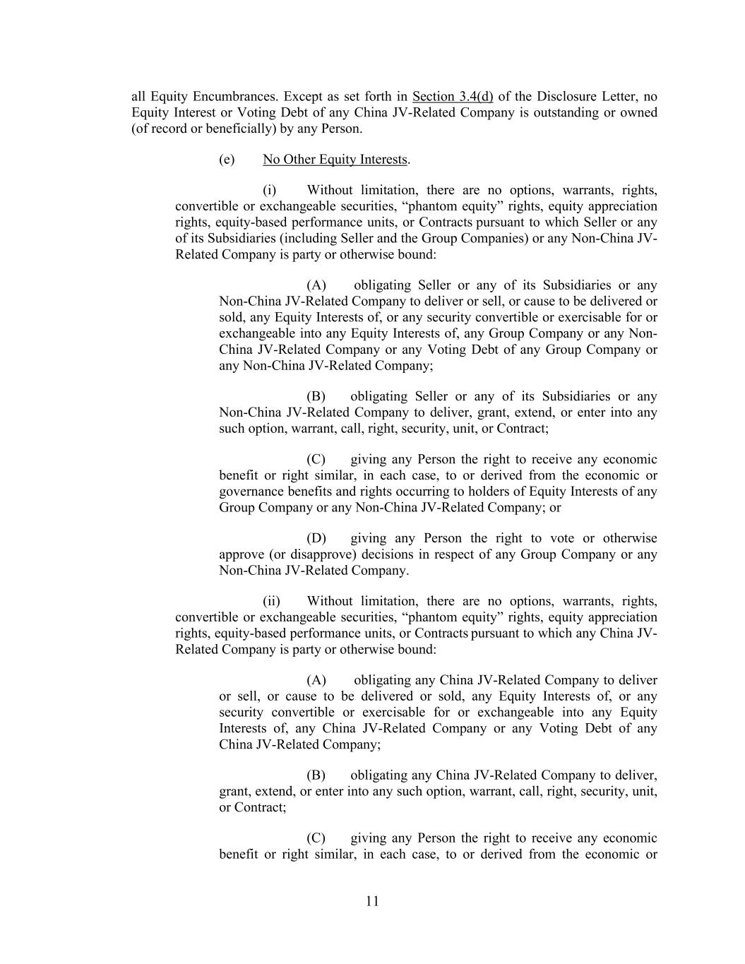 11 all Equity Encumbrances. Except as set forth in Section 3.4(d) of the Disclosure Letter, no Equity Interest or Voting Debt of any China JV-Related Company is outstanding or owned (of record or beneficially) by any Person. (e) No Other Equity Interests. (i) Without limitation, there are no options, warrants, rights, convertible or exchangeable securities, “phantom equity” rights, equity appreciation rights, equity-based performance units, or Contracts pursuant to which Seller or any of its Subsidiaries (including Seller and the Group Companies) or any Non-China JV- Related Company is party or otherwise bound: (A) obligating Seller or any of its Subsidiaries or any Non-China JV-Related Company to deliver or sell, or cause to be delivered or sold, any Equity Interests of, or any security convertible or exercisable for or exchangeable into any Equity Interests of, any Group Company or any Non- China JV-Related Company or any Voting Debt of any Group Company or any Non-China JV-Related Company; (B) obligating Seller or any of its Subsidiaries or any Non-China JV-Related Company to deliver, grant, extend, or enter into any such option, warrant, call, right, security, unit, or Contract; (C) giving any Person the right to receive any economic benefit or right similar, in each case, to or derived from the economic or governance benefits and rights occurring to holders of Equity Interests of any Group Company or any Non-China JV-Related Company; or (D) giving any Person the right to vote or otherwise approve (or disapprove) decisions in respect of any Group Company or any Non-China JV-Related Company. (ii) Without limitation, there are no options, warrants, rights, convertible or exchangeable securities, “phantom equity” rights, equity appreciation rights, equity-based performance units, or Contracts pursuant to which any China JV- Related Company is party or otherwise bound: (A) obligating any China JV-Related Company to deliver or sell, or cause to be delivered or sold, any Equity Interests of, or any security convertible or exercisable for or exchangeable into any Equity Interests of, any China JV-Related Company or any Voting Debt of any China JV-Related Company; (B) obligating any China JV-Related Company to deliver, grant, extend, or enter into any such option, warrant, call, right, security, unit, or Contract; (C) giving any Person the right to receive any economic benefit or right similar, in each case, to or derived from the economic or