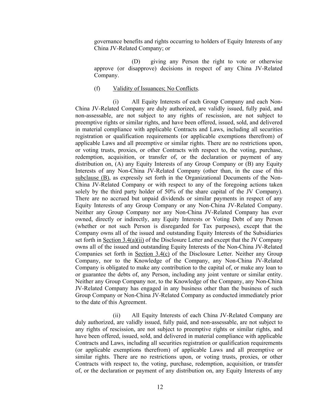 12 governance benefits and rights occurring to holders of Equity Interests of any China JV-Related Company; or (D) giving any Person the right to vote or otherwise approve (or disapprove) decisions in respect of any China JV-Related Company. (f) Validity of Issuances; No Conflicts. (i) All Equity Interests of each Group Company and each Non- China JV-Related Company are duly authorized, are validly issued, fully paid, and non-assessable, are not subject to any rights of rescission, are not subject to preemptive rights or similar rights, and have been offered, issued, sold, and delivered in material compliance with applicable Contracts and Laws, including all securities registration or qualification requirements (or applicable exemptions therefrom) of applicable Laws and all preemptive or similar rights. There are no restrictions upon, or voting trusts, proxies, or other Contracts with respect to, the voting, purchase, redemption, acquisition, or transfer of, or the declaration or payment of any distribution on, (A) any Equity Interests of any Group Company or (B) any Equity Interests of any Non-China JV-Related Company (other than, in the case of this subclause (B), as expressly set forth in the Organizational Documents of the Non- China JV-Related Company or with respect to any of the foregoing actions taken solely by the third party holder of 50% of the share capital of the JV Company). There are no accrued but unpaid dividends or similar payments in respect of any Equity Interests of any Group Company or any Non-China JV-Related Company. Neither any Group Company nor any Non-China JV-Related Company has ever owned, directly or indirectly, any Equity Interests or Voting Debt of any Person (whether or not such Person is disregarded for Tax purposes), except that the Company owns all of the issued and outstanding Equity Interests of the Subsidiaries set forth in Section 3.4(a)(ii) of the Disclosure Letter and except that the JV Company owns all of the issued and outstanding Equity Interests of the Non-China JV-Related Companies set forth in Section 3.4(c) of the Disclosure Letter. Neither any Group Company, nor to the Knowledge of the Company, any Non-China JV-Related Company is obligated to make any contribution to the capital of, or make any loan to or guarantee the debts of, any Person, including any joint venture or similar entity. Neither any Group Company nor, to the Knowledge of the Company, any Non-China JV-Related Company has engaged in any business other than the business of such Group Company or Non-China JV-Related Company as conducted immediately prior to the date of this Agreement. (ii) All Equity Interests of each China JV-Related Company are duly authorized, are validly issued, fully paid, and non-assessable, are not subject to any rights of rescission, are not subject to preemptive rights or similar rights, and have been offered, issued, sold, and delivered in material compliance with applicable Contracts and Laws, including all securities registration or qualification requirements (or applicable exemptions therefrom) of applicable Laws and all preemptive or similar rights. There are no restrictions upon, or voting trusts, proxies, or other Contracts with respect to, the voting, purchase, redemption, acquisition, or transfer of, or the declaration or payment of any distribution on, any Equity Interests of any