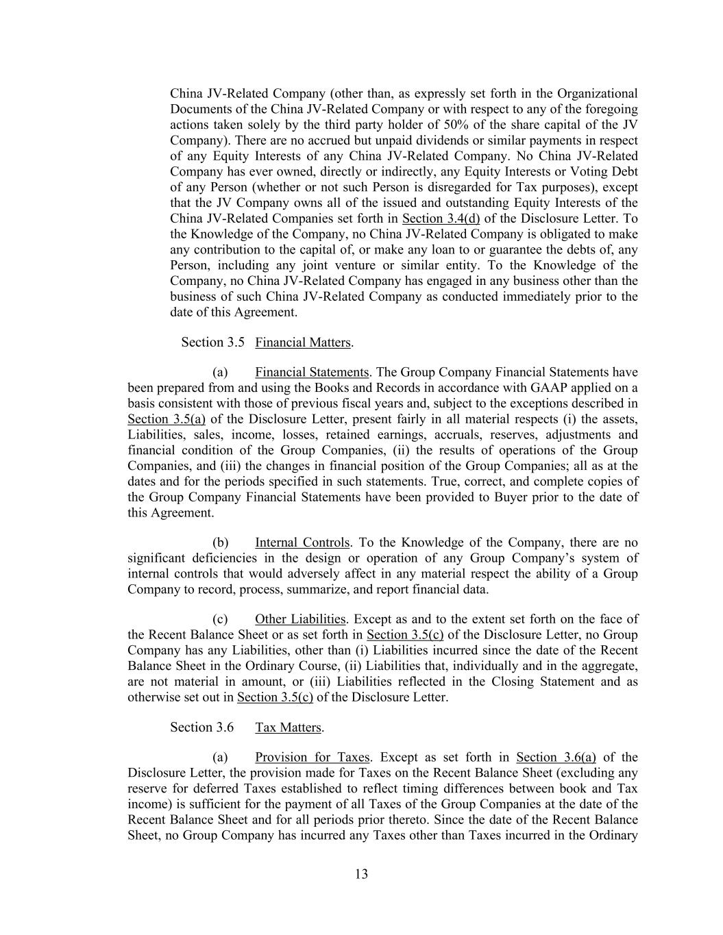 13 China JV-Related Company (other than, as expressly set forth in the Organizational Documents of the China JV-Related Company or with respect to any of the foregoing actions taken solely by the third party holder of 50% of the share capital of the JV Company). There are no accrued but unpaid dividends or similar payments in respect of any Equity Interests of any China JV-Related Company. No China JV-Related Company has ever owned, directly or indirectly, any Equity Interests or Voting Debt of any Person (whether or not such Person is disregarded for Tax purposes), except that the JV Company owns all of the issued and outstanding Equity Interests of the China JV-Related Companies set forth in Section 3.4(d) of the Disclosure Letter. To the Knowledge of the Company, no China JV-Related Company is obligated to make any contribution to the capital of, or make any loan to or guarantee the debts of, any Person, including any joint venture or similar entity. To the Knowledge of the Company, no China JV-Related Company has engaged in any business other than the business of such China JV-Related Company as conducted immediately prior to the date of this Agreement. Section 3.5 Financial Matters. (a) Financial Statements. The Group Company Financial Statements have been prepared from and using the Books and Records in accordance with GAAP applied on a basis consistent with those of previous fiscal years and, subject to the exceptions described in Section 3.5(a) of the Disclosure Letter, present fairly in all material respects (i) the assets, Liabilities, sales, income, losses, retained earnings, accruals, reserves, adjustments and financial condition of the Group Companies, (ii) the results of operations of the Group Companies, and (iii) the changes in financial position of the Group Companies; all as at the dates and for the periods specified in such statements. True, correct, and complete copies of the Group Company Financial Statements have been provided to Buyer prior to the date of this Agreement. (b) Internal Controls. To the Knowledge of the Company, there are no significant deficiencies in the design or operation of any Group Company’s system of internal controls that would adversely affect in any material respect the ability of a Group Company to record, process, summarize, and report financial data. (c) Other Liabilities. Except as and to the extent set forth on the face of the Recent Balance Sheet or as set forth in Section 3.5(c) of the Disclosure Letter, no Group Company has any Liabilities, other than (i) Liabilities incurred since the date of the Recent Balance Sheet in the Ordinary Course, (ii) Liabilities that, individually and in the aggregate, are not material in amount, or (iii) Liabilities reflected in the Closing Statement and as otherwise set out in Section 3.5(c) of the Disclosure Letter. Section 3.6 Tax Matters. (a) Provision for Taxes. Except as set forth in Section 3.6(a) of the Disclosure Letter, the provision made for Taxes on the Recent Balance Sheet (excluding any reserve for deferred Taxes established to reflect timing differences between book and Tax income) is sufficient for the payment of all Taxes of the Group Companies at the date of the Recent Balance Sheet and for all periods prior thereto. Since the date of the Recent Balance Sheet, no Group Company has incurred any Taxes other than Taxes incurred in the Ordinary
