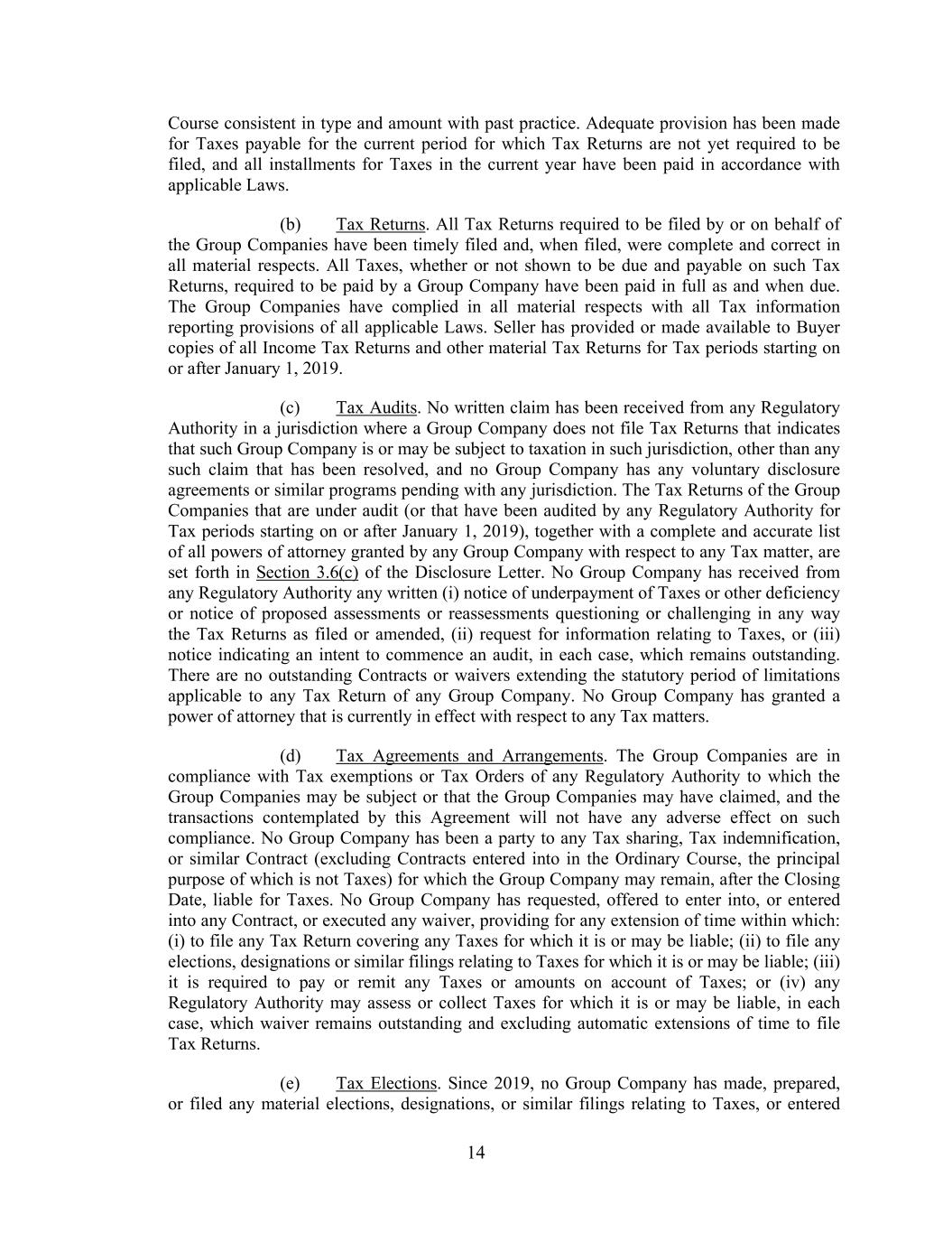 14 Course consistent in type and amount with past practice. Adequate provision has been made for Taxes payable for the current period for which Tax Returns are not yet required to be filed, and all installments for Taxes in the current year have been paid in accordance with applicable Laws. (b) Tax Returns. All Tax Returns required to be filed by or on behalf of the Group Companies have been timely filed and, when filed, were complete and correct in all material respects. All Taxes, whether or not shown to be due and payable on such Tax Returns, required to be paid by a Group Company have been paid in full as and when due. The Group Companies have complied in all material respects with all Tax information reporting provisions of all applicable Laws. Seller has provided or made available to Buyer copies of all Income Tax Returns and other material Tax Returns for Tax periods starting on or after January 1, 2019. (c) Tax Audits. No written claim has been received from any Regulatory Authority in a jurisdiction where a Group Company does not file Tax Returns that indicates that such Group Company is or may be subject to taxation in such jurisdiction, other than any such claim that has been resolved, and no Group Company has any voluntary disclosure agreements or similar programs pending with any jurisdiction. The Tax Returns of the Group Companies that are under audit (or that have been audited by any Regulatory Authority for Tax periods starting on or after January 1, 2019), together with a complete and accurate list of all powers of attorney granted by any Group Company with respect to any Tax matter, are set forth in Section 3.6(c) of the Disclosure Letter. No Group Company has received from any Regulatory Authority any written (i) notice of underpayment of Taxes or other deficiency or notice of proposed assessments or reassessments questioning or challenging in any way the Tax Returns as filed or amended, (ii) request for information relating to Taxes, or (iii) notice indicating an intent to commence an audit, in each case, which remains outstanding. There are no outstanding Contracts or waivers extending the statutory period of limitations applicable to any Tax Return of any Group Company. No Group Company has granted a power of attorney that is currently in effect with respect to any Tax matters. (d) Tax Agreements and Arrangements. The Group Companies are in compliance with Tax exemptions or Tax Orders of any Regulatory Authority to which the Group Companies may be subject or that the Group Companies may have claimed, and the transactions contemplated by this Agreement will not have any adverse effect on such compliance. No Group Company has been a party to any Tax sharing, Tax indemnification, or similar Contract (excluding Contracts entered into in the Ordinary Course, the principal purpose of which is not Taxes) for which the Group Company may remain, after the Closing Date, liable for Taxes. No Group Company has requested, offered to enter into, or entered into any Contract, or executed any waiver, providing for any extension of time within which: (i) to file any Tax Return covering any Taxes for which it is or may be liable; (ii) to file any elections, designations or similar filings relating to Taxes for which it is or may be liable; (iii) it is required to pay or remit any Taxes or amounts on account of Taxes; or (iv) any Regulatory Authority may assess or collect Taxes for which it is or may be liable, in each case, which waiver remains outstanding and excluding automatic extensions of time to file Tax Returns. (e) Tax Elections. Since 2019, no Group Company has made, prepared, or filed any material elections, designations, or similar filings relating to Taxes, or entered