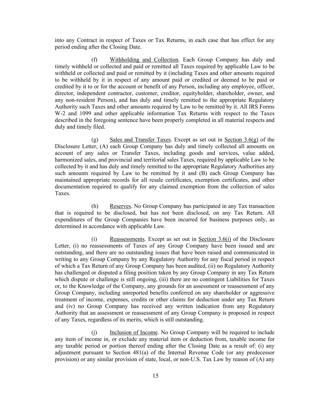 15 into any Contract in respect of Taxes or Tax Returns, in each case that has effect for any period ending after the Closing Date. (f) Withholding and Collection. Each Group Company has duly and timely withheld or collected and paid or remitted all Taxes required by applicable Law to be withheld or collected and paid or remitted by it (including Taxes and other amounts required to be withheld by it in respect of any amount paid or credited or deemed to be paid or credited by it to or for the account or benefit of any Person, including any employee, officer, director, independent contractor, customer, creditor, equityholder, shareholder, owner, and any non-resident Person), and has duly and timely remitted to the appropriate Regulatory Authority such Taxes and other amounts required by Law to be remitted by it. All IRS Forms W-2 and 1099 and other applicable information Tax Returns with respect to the Taxes described in the foregoing sentence have been properly completed in all material respects and duly and timely filed. (g) Sales and Transfer Taxes. Except as set out in Section 3.6(g) of the Disclosure Letter, (A) each Group Company has duly and timely collected all amounts on account of any sales or Transfer Taxes, including goods and services, value added, harmonized sales, and provincial and territorial sales Taxes, required by applicable Law to be collected by it and has duly and timely remitted to the appropriate Regulatory Authorities any such amounts required by Law to be remitted by it and (B) each Group Company has maintained appropriate records for all resale certificates, exemption certificates, and other documentation required to qualify for any claimed exemption from the collection of sales Taxes. (h) Reserves. No Group Company has participated in any Tax transaction that is required to be disclosed, but has not been disclosed, on any Tax Return. All expenditures of the Group Companies have been incurred for business purposes only, as determined in accordance with applicable Law. (i) Reassessments. Except as set out in Section 3.6(i) of the Disclosure Letter, (i) no reassessments of Taxes of any Group Company have been issued and are outstanding, and there are no outstanding issues that have been raised and communicated in writing to any Group Company by any Regulatory Authority for any fiscal period in respect of which a Tax Return of any Group Company has been audited, (ii) no Regulatory Authority has challenged or disputed a filing position taken by any Group Company in any Tax Return which dispute or challenge is still ongoing, (iii) there are no contingent Liabilities for Taxes or, to the Knowledge of the Company, any grounds for an assessment or reassessment of any Group Company, including unreported benefits conferred on any shareholder or aggressive treatment of income, expenses, credits or other claims for deduction under any Tax Return and (iv) no Group Company has received any written indication from any Regulatory Authority that an assessment or reassessment of any Group Company is proposed in respect of any Taxes, regardless of its merits, which is still outstanding. (j) Inclusion of Income. No Group Company will be required to include any item of income in, or exclude any material item or deduction from, taxable income for any taxable period or portion thereof ending after the Closing Date as a result of: (i) any adjustment pursuant to Section 481(a) of the Internal Revenue Code (or any predecessor provision) or any similar provision of state, local, or non-U.S. Tax Law by reason of (A) any